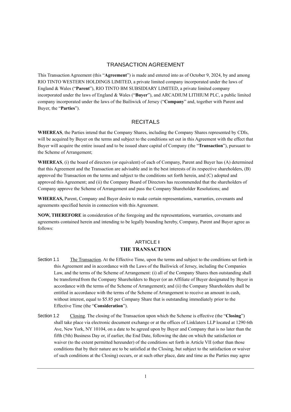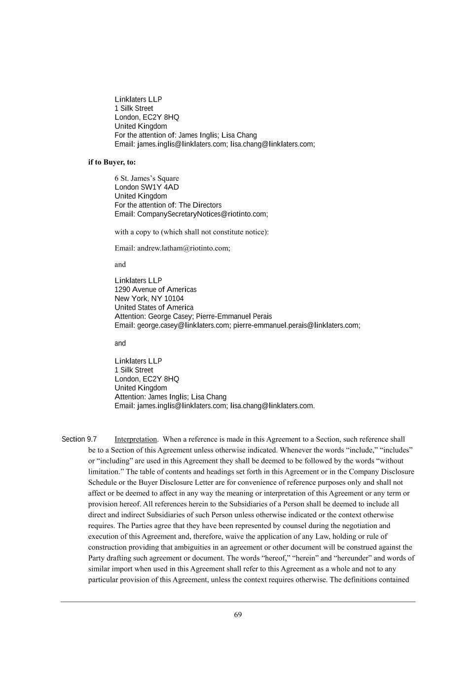 47 Linklaters LLP 1 Silk Street London, EC2Y 8HQ United Kingdom For the attention of: James Inglis; Lisa Chang Email: james.inglis@linklaters.com; lisa.chang@linklaters.com; if to Buyer, to: 4 Mj, DWc[iui MgkWh[ London SW1Y 4AD United Kingdom For the attention of: The Directors Email: CompanySecretaryNotices@riotinto.com; m_j^ W Yefo je (m^_Y^ i^Wbb dej Yedij_jkj[ dej_Y[)8 ?cW_b8 WdZh[m,bWj^Wc:h_ej_dje,Yec9 WdZ Linklaters LLP 1290 Avenue of Americas New York, NY 10104 United States of America Attention: George Casey; Pierre-Emmanuel Perais Email: george.casey@linklaters.com; pierre-emmanuel.perais@linklaters.com; and Linklaters LLP 1 Silk Street London, EC2Y 8HQ United Kingdom Attention: James Inglis; Lisa Chang Email: james.inglis@linklaters.com; lisa.chang@linklaters.com. Section 9.7 Cdj[hfh[jWj_ed, Q^[d W h[\[h[dY[ _i cWZ[ _d j^_i ;]h[[c[dj je W M[Yj_ed* ikY^ h[\[h[dY[ i^Wbb X[ je W M[Yj_ed e\ j^_i ;]h[[c[dj kdb[ii ej^[hm_i[ _dZ_YWj[Z, Q^[d[l[h j^[ mehZi r_dYbkZ[*s r_dYbkZ[is eh r_dYbkZ_d]s Wh[ ki[Z _d j^_i ;]h[[c[dj j^[o i^Wbb X[ Z[[c[Z je X[ \ebbem[Z Xo j^[ mehZi rm_j^ekj b_c_jWj_ed,s N^[ jWXb[ e\ Yedj[dji WdZ ^[WZ_d]i i[j \ehj^ _d j^_i ;]h[[c[dj eh _d j^[ =ecfWdo >_iYbeikh[ MY^[Zkb[ eh j^[ <ko[h >_iYbeikh[ F[jj[h Wh[ \eh Yedl[d_[dY[ e\ h[\[h[dY[ fkhfei[i edbo WdZ i^Wbb dej W\\[Yj eh X[ Z[[c[Z je W\\[Yj _d Wdo mWo j^[ c[Wd_d] eh _dj[hfh[jWj_ed e\ j^_i ;]h[[c[dj eh Wdo j[hc eh fhel_i_ed ^[h[e\, ;bb h[\[h[dY[i ^[h[_d je j^[ MkXi_Z_Wh_[i e\ W J[hied i^Wbb X[ Z[[c[Z je _dYbkZ[ Wbb Z_h[Yj WdZ _dZ_h[Yj MkXi_Z_Wh_[i e\ ikY^ J[hied kdb[ii ej^[hm_i[ _dZ_YWj[Z eh j^[ Yedj[nj ej^[hm_i[ h[gk_h[i, N^[ JWhj_[i W]h[[ j^Wj j^[o ^Wl[ X[[d h[fh[i[dj[Z Xo Yekdi[b Zkh_d] j^[ d[]ej_Wj_ed WdZ [n[Ykj_ed e\ j^_i ;]h[[c[dj WdZ* j^[h[\eh[* mW_l[ j^[ Wffb_YWj_ed e\ Wdo FWm* ^ebZ_d] eh hkb[ e\ YedijhkYj_ed fhel_Z_d] j^Wj WcX_]k_j_[i _d Wd W]h[[c[dj eh ej^[h ZeYkc[dj m_bb X[ Yedijhk[Z W]W_dij j^[ JWhjo ZhW\j_d] ikY^ W]h[[c[dj eh ZeYkc[dj, N^[ mehZi r^[h[e\*s r^[h[_ds WdZ r^[h[kdZ[hs WdZ mehZi e\ i_c_bWh _cfehj m^[d ki[Z _d j^_i ;]h[[c[dj i^Wbb h[\[h je j^_i ;]h[[c[dj Wi W m^eb[ WdZ dej je Wdo fWhj_YkbWh fhel_i_ed e\ j^_i ;]h[[c[dj* kdb[ii j^[ Yedj[nj h[gk_h[i ej^[hm_i[, N^[ Z[\_d_j_edi YedjW_d[Z