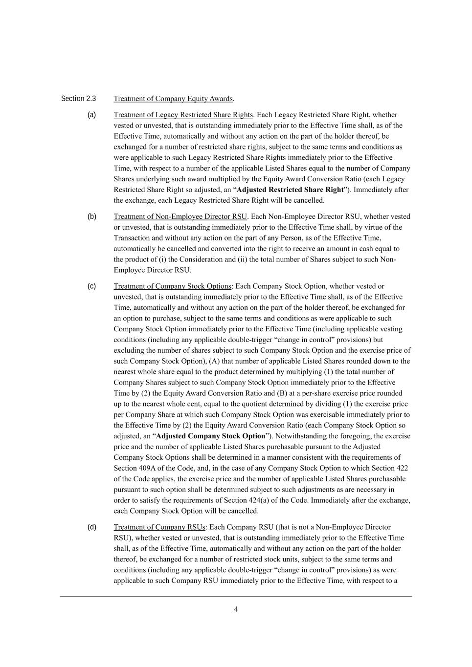 2 Section 2.3 Nh[Wjc[dj e\ =ecfWdo ?gk_jo ;mWhZi, (a) Nh[Wjc[dj e\ F[]WYo L[ijh_Yj[Z M^Wh[ L_]^ji, ?WY^ F[]WYo L[ijh_Yj[Z M^Wh[ L_]^j* m^[j^[h l[ij[Z eh kdl[ij[Z* j^Wj _i ekjijWdZ_d] _cc[Z_Wj[bo fh_eh je j^[ ?\\[Yj_l[ N_c[ i^Wbb* Wi e\ j^[ ?\\[Yj_l[ N_c[* WkjecWj_YWbbo WdZ m_j^ekj Wdo WYj_ed ed j^[ fWhj e\ j^[ ^ebZ[h j^[h[e\* X[ [nY^Wd][Z \eh W dkcX[h e\ h[ijh_Yj[Z i^Wh[ h_]^ji* ikX`[Yj je j^[ iWc[ j[hci WdZ YedZ_j_edi Wi m[h[ Wffb_YWXb[ je ikY^ F[]WYo L[ijh_Yj[Z M^Wh[ L_]^ji _cc[Z_Wj[bo fh_eh je j^[ ?\\[Yj_l[ N_c[* m_j^ h[if[Yj je W dkcX[h e\ j^[ Wffb_YWXb[ F_ij[Z M^Wh[i [gkWb je j^[ dkcX[h e\ =ecfWdo M^Wh[i kdZ[hbo_d] ikY^ WmWhZ ckbj_fb_[Z Xo j^[ ?gk_jo ;mWhZ =edl[hi_ed LWj_e ([WY^ F[]WYo L[ijh_Yj[Z M^Wh[ L_]^j ie WZ`kij[Z* Wd rAdjusted Restricted Share Rights), Ccc[Z_Wj[bo W\j[h j^[ [nY^Wd][* [WY^ F[]WYo L[ijh_Yj[Z M^Wh[ L_]^j m_bb X[ YWdY[bb[Z, (b) Nh[Wjc[dj e\ Hed+?cfbeo[[ >_h[Yjeh LMO, ?WY^ Hed+?cfbeo[[ >_h[Yjeh LMO* m^[j^[h l[ij[Z eh kdl[ij[Z* j^Wj _i ekjijWdZ_d] _cc[Z_Wj[bo fh_eh je j^[ ?\\[Yj_l[ N_c[ i^Wbb* Xo l_hjk[ e\ j^[ NhWdiWYj_ed WdZ m_j^ekj Wdo WYj_ed ed j^[ fWhj e\ Wdo J[hied* Wi e\ j^[ ?\\[Yj_l[ N_c[* WkjecWj_YWbbo X[ YWdY[bb[Z WdZ Yedl[hj[Z _dje j^[ h_]^j je h[Y[_l[ Wd Wcekdj _d YWi^ [gkWb je j^[ fheZkYj e\ (_) j^[ =edi_Z[hWj_ed WdZ (__) j^[ jejWb dkcX[h e\ M^Wh[i ikX`[Yj je ikY^ Hed+ ?cfbeo[[ >_h[Yjeh LMO, (c) Nh[Wjc[dj e\ =ecfWdo MjeYa Ifj_edi8 ?WY^ =ecfWdo MjeYa Ifj_ed* m^[j^[h l[ij[Z eh kdl[ij[Z* j^Wj _i ekjijWdZ_d] _cc[Z_Wj[bo fh_eh je j^[ ?\\[Yj_l[ N_c[ i^Wbb* Wi e\ j^[ ?\\[Yj_l[ N_c[* WkjecWj_YWbbo WdZ m_j^ekj Wdo WYj_ed ed j^[ fWhj e\ j^[ ^ebZ[h j^[h[e\* X[ [nY^Wd][Z \eh Wd efj_ed je fkhY^Wi[* ikX`[Yj je j^[ iWc[ j[hci WdZ YedZ_j_edi Wi m[h[ Wffb_YWXb[ je ikY^ =ecfWdo MjeYa Ifj_ed _cc[Z_Wj[bo fh_eh je j^[ ?\\[Yj_l[ N_c[ (_dYbkZ_d] Wffb_YWXb[ l[ij_d] YedZ_j_edi (_dYbkZ_d] Wdo Wffb_YWXb[ ZekXb[+jh_]][h rY^Wd][ _d Yedjhebs fhel_i_edi) Xkj [nYbkZ_d] j^[ dkcX[h e\ i^Wh[i ikX`[Yj je ikY^ =ecfWdo MjeYa Ifj_ed WdZ j^[ [n[hY_i[ fh_Y[ e\ ikY^ =ecfWdo MjeYa Ifj_ed)* (;) j^Wj dkcX[h e\ Wffb_YWXb[ F_ij[Z M^Wh[i hekdZ[Z Zemd je j^[ d[Wh[ij m^eb[ i^Wh[ [gkWb je j^[ fheZkYj Z[j[hc_d[Z Xo ckbj_fbo_d] (/) j^[ jejWb dkcX[h e\ =ecfWdo M^Wh[i ikX`[Yj je ikY^ =ecfWdo MjeYa Ifj_ed _cc[Z_Wj[bo fh_eh je j^[ ?\\[Yj_l[ N_c[ Xo (0) j^[ ?gk_jo ;mWhZ =edl[hi_ed LWj_e WdZ (<) Wj W f[h+i^Wh[ [n[hY_i[ fh_Y[ hekdZ[Z kf je j^[ d[Wh[ij m^eb[ Y[dj* [gkWb je j^[ gkej_[dj Z[j[hc_d[Z Xo Z_l_Z_d] (/) j^[ [n[hY_i[ fh_Y[ f[h =ecfWdo M^Wh[ Wj m^_Y^ ikY^ =ecfWdo MjeYa Ifj_ed mWi [n[hY_iWXb[ _cc[Z_Wj[bo fh_eh je j^[ ?\\[Yj_l[ N_c[ Xo (0) j^[ ?gk_jo ;mWhZ =edl[hi_ed LWj_e ([WY^ =ecfWdo MjeYa Ifj_ed ie WZ`kij[Z* Wd rAdjusted Company Stock Options), Hejm_j^ijWdZ_d] j^[ \eh[]e_d]* j^[ [n[hY_i[ fh_Y[ WdZ j^[ dkcX[h e\ Wffb_YWXb[ F_ij[Z M^Wh[i fkhY^WiWXb[ fkhikWdj je j^[ ;Z`kij[Z =ecfWdo MjeYa Ifj_edi i^Wbb X[ Z[j[hc_d[Z _d W cWdd[h Yedi_ij[dj m_j^ j^[ h[gk_h[c[dji e\ M[Yj_ed 2.7; e\ j^[ =eZ[* WdZ* _d j^[ YWi[ e\ Wdo =ecfWdo MjeYa Ifj_ed je m^_Y^ M[Yj_ed 200 e\ j^[ =eZ[ Wffb_[i* j^[ [n[hY_i[ fh_Y[ WdZ j^[ dkcX[h e\ Wffb_YWXb[ F_ij[Z M^Wh[i fkhY^WiWXb[ fkhikWdj je ikY^ efj_ed i^Wbb X[ Z[j[hc_d[Z ikX`[Yj je ikY^ WZ`kijc[dji Wi Wh[ d[Y[iiWho _d ehZ[h je iWj_i\o j^[ h[gk_h[c[dji e\ M[Yj_ed 202(W) e\ j^[ =eZ[, Ccc[Z_Wj[bo W\j[h j^[ [nY^Wd][* [WY^ =ecfWdo MjeYa Ifj_ed m_bb X[ YWdY[bb[Z, (d) Nh[Wjc[dj e\ =ecfWdo LMOi8 ?WY^ =ecfWdo LMO (j^Wj _i dej W Hed+?cfbeo[[ >_h[Yjeh LMO)* m^[j^[h l[ij[Z eh kdl[ij[Z* j^Wj _i ekjijWdZ_d] _cc[Z_Wj[bo fh_eh je j^[ ?\\[Yj_l[ N_c[ i^Wbb* Wi e\ j^[ ?\\[Yj_l[ N_c[* WkjecWj_YWbbo WdZ m_j^ekj Wdo WYj_ed ed j^[ fWhj e\ j^[ ^ebZ[h j^[h[e\* X[ [nY^Wd][Z \eh W dkcX[h e\ h[ijh_Yj[Z ijeYa kd_ji* ikX`[Yj je j^[ iWc[ j[hci WdZ YedZ_j_edi (_dYbkZ_d] Wdo Wffb_YWXb[ ZekXb[+jh_]][h rY^Wd][ _d Yedjhebs fhel_i_edi) Wi m[h[ Wffb_YWXb[ je ikY^ =ecfWdo LMO _cc[Z_Wj[bo fh_eh je j^[ ?\\[Yj_l[ N_c[* m_j^ h[if[Yj je W