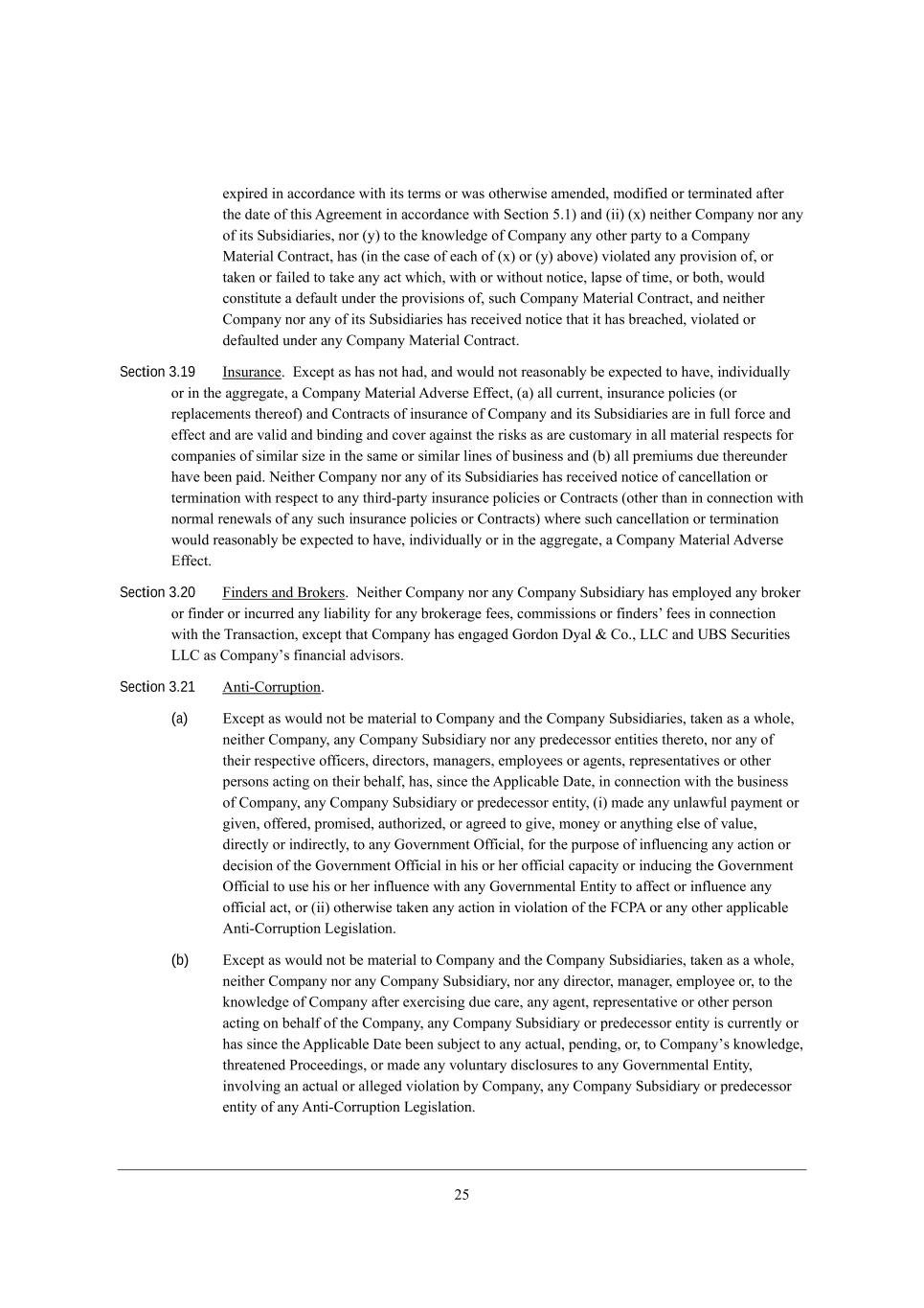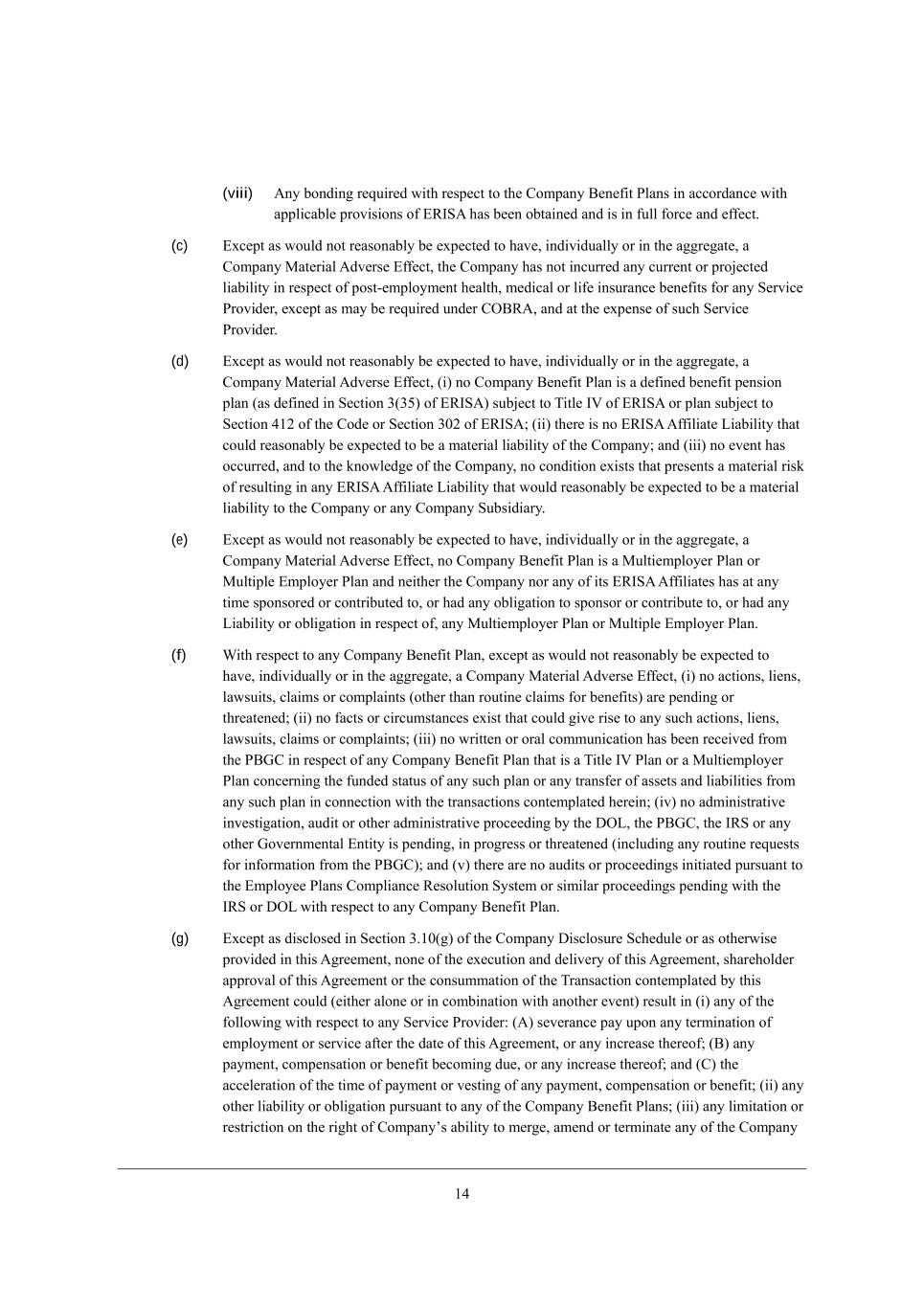 /5 Section 3.12 ;Xi[dY[ e\ =[hjW_d =^Wd][i eh ?l[dji, (a) M_dY[ DWdkWho 2* 0.02* j^[h[ ^Wi dej eYYkhh[Z Wdo ?\\[Yj j^Wj ^Wi ^WZ* eh mekbZ h[WiedWXbo X[ [nf[Yj[Z je ^Wl[* _dZ_l_ZkWbbo eh _d j^[ W]]h[]Wj[* W =ecfWdo GWj[h_Wb ;Zl[hi[ ?\\[Yj, (b) Ne j^[ [nj[dj dej fkXb_Ybo Z_iYbei[Z* i_dY[ DWdkWho 2* 0.02 j^hek]^ j^[ ZWj[ e\ j^_i ;]h[[c[dj* j^[ Xki_d[ii e\ =ecfWdo WdZ j^[ =ecfWdo MkXi_Z_Wh_[i ^Wi _d [WY^ YWi[ X[[d YedZkYj[Z* _d Wbb cWj[h_Wb h[if[Yji* _d j^[ ehZ_dWho Yekhi[ e\ Xki_d[ii, Section 3.13 Cdl[ij_]Wj_ed9 F_j_]Wj_ed, N^[h[ Wh[ de JheY[[Z_d]i Ykhh[dj* f[dZ_d] eh j^h[Wj[d[Z _d mh_j_d] (eh* je j^[ ademb[Z][ e\ =ecfWdo* ehWbbo) W]W_dij =ecfWdo eh Wdo =ecfWdo MkXi_Z_Who* [nY[fj \eh j^ei[ j^Wj ^Wl[ dej X[[d* WdZ mekbZ dej h[WiedWXbo X[ [nf[Yj[Z je X[* _dZ_l_ZkWbbo eh _d j^[ W]]h[]Wj[* cWj[h_Wb je =ecfWdo WdZ j^[ =ecfWdo MkXi_Z_Wh_[i* jWa[d Wi W m^eb[, ?nY[fj Wi i[j \ehj^ ed M[Yj_ed 1,/1 e\ j^[ =ecfWdo >_iYbeikh[ MY^[Zkb[ eh Wi mekbZ dej h[WiedWXbo X[ [nf[Yj[Z je X[ cWj[h_Wb je =ecfWdo WdZ j^[ =ecfWdo MkXi_Z_Wh_[i* jWa[d Wi W m^eb[* (W) j^[h[ Wh[ de* WdZ i_dY[ DWdkWho 2* 0.02* j^[h[ ^Wi dej X[[d Wdo* i[jjb[c[dj W]h[[c[dji eh i_c_bWh mh_jj[d W]h[[c[dji X[jm[[d =ecfWdo eh Wdo =ecfWdo MkXi_Z_Wh_[i WdZ Wdo Ael[hdc[djWb ?dj_jo WdZ (X) j^[h[ _i de* WdZ i_dY[ DWdkWho 2* 0.02* j^[h[ ^Wi dej X[[d Wdo* ekjijWdZ_d] IhZ[h e\ Wdo Ael[hdc[djWb ?dj_jo W]W_dij eh ej^[hm_i[ W\\[Yj_d] j^[ =ecfWdo eh Wdo =ecfWdo MkXi_Z_Wh_[i eh Wdo e\ j^[_h fhef[hj_[i eh Wii[ji* [nY[fj \eh IhZ[hi e\ ][d[hWb Wffb_YWX_b_jo W\\[Yj_d] j^[ _dZkijho ][d[hWbbo _d m^_Y^ =ecfWdo WdZ =ecfWdo MkXi_Z_Wh_[i ef[hWj[, ?nY[fj Wi mekbZ dej h[WiedWXbo X[ [nf[Yj[Z je X[ cWj[h_Wb je =ecfWdo WdZ j^[ =ecfWdo MkXi_Z_Wh_[i* jWa[d Wi W m^eb[* je j^[ ademb[Z][ e\ j^[ =ecfWdo* (_) de _dl[ij_]Wj_ed Z_h[Yj[Z eh jWh][j[Z Wj =ecfWdo eh Wdo =ecfWdo MkXi_Z_Wh_[i _i X[_d] YedZkYj[Z Xo Wdo Ael[hdc[djWb ?dj_jo WdZ (__) de ikY^ _dl[ij_]Wj_ed _i iY^[Zkb[Z eh f[dZ_d], Section 3.14 NWn GWjj[hi, (a) ?nY[fj Wi ^Wi dej ^WZ* WdZ mekbZ dej h[WiedWXbo X[ [nf[Yj[Z je ^Wl[* _dZ_l_ZkWbbo eh _d j^[ W]]h[]Wj[* W =ecfWdo GWj[h_Wb ;Zl[hi[ ?\\[Yj* i_dY[ j^[ ;ffb_YWXb[ >Wj[8 (i) =ecfWdo _i h[i_Z[dj \eh NWn fkhfei[i edbo _d Ch[bWdZ WdZ [WY^ =ecfWdo MkXi_Z_Who _i h[i_Z[dj \eh NWn fkhfei[i edbo _d _ji `kh_iZ_Yj_ed e\ _dYehfehWj_ed9 (ii) j^[ L[]_ij[h e\ G[cX[hi ^Wi X[[d a[fj Wj Wbb j_c[i _d D[hi[o WdZ de i^Wh[ h[]_ij[h e\ =ecfWdo _i eh ^Wi X[[d a[fj _d Wdo ej^[h `kh_iZ_Yj_ed9 (iii) Wbb NWn L[jkhdi j^Wj Wh[ h[gk_h[Z je X[ \_b[Z Xo eh m_j^ h[if[Yj je =ecfWdo eh Wdo e\ _ji MkXi_Z_Wh_[i eh fh[Z[Y[iieh [dj_j_[i ^Wl[ X[[d j_c[bo \_b[Z (jWa_d] _dje WYYekdj Wdo [nj[di_ed e\ j_c[ m_j^_d m^_Y^ je \_b[)* WdZ Wbb ikY^ NWn L[jkhdi Wh[ jhk[* Yecfb[j[ WdZ WYYkhWj[9 (iv) =ecfWdo* _ji MkXi_Z_Wh_[i WdZ fh[Z[Y[iieh [dj_j_[i ^Wl[ fW_Z Wbb NWn[i Zk[ WdZ em_d] Xo Wdo e\ j^[c* _dYbkZ_d] Wdo NWn[i h[gk_h[Z je X[ m_j^^[bZ \hec Wcekdji em_d] je Wdo [cfbeo[[* Yh[Z_jeh eh j^_hZ fWhjo (_d [WY^ YWi[* m^[j^[h eh dej i^emd ed Wdo NWn L[jkhd)* ej^[h j^Wd NWn[i j^Wj Wh[ X[_d] Yedj[ij[Z Xo =ecfWdo eh Wdo e\ _ji MkXi_Z_Wh_[i _d ]eeZ \W_j^ Xo Wffhefh_Wj[ fheY[[Z_d]i WdZ \eh m^_Y^ WZ[gkWj[ h[i[hl[i ^Wl[ X[[d [ijWXb_i^[Z _d WYYehZWdY[ m_j^ A;;J ed j^[ Yedieb_ZWj[Z \_dWdY_Wb ijWj[c[dji e\ =ecfWdo WdZ _ji MkXi_Z_Wh_[i _dYbkZ[Z _d j^[ =ecfWdo M?= >eYkc[dji (Yebb[Yj_l[bo* j^[ rCompany Disclosure Documentss)9