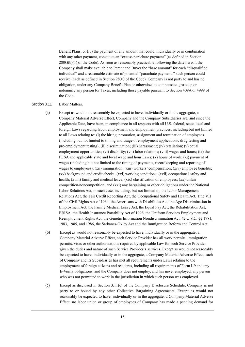 /3 <[d[\_j JbWdi9 eh (_l) j^[ fWoc[dj e\ Wdo Wcekdj j^Wj YekbZ* _dZ_l_ZkWbbo eh _d YecX_dWj_ed m_j^ Wdo ej^[h fWoc[dj* Yedij_jkj[ Wd r[nY[ii fWhWY^kj[ fWoc[djs (Wi Z[\_d[Z _d M[Yj_ed 06.A(X)(/) e\ j^[ =eZ[), ;i ieed Wi h[WiedWXbo fhWYj_YWXb[ \ebbem_d] j^[ ZWj[ ^[h[e\* j^[ =ecfWdo i^Wbb cWa[ WlW_bWXb[ je JWh[dj WdZ <ko[h j^[ rXWi[ Wcekdjs \eh [WY^ rZ_igkWb_\_[Z _dZ_l_ZkWbs WdZ W h[WiedWXb[ [ij_cWj[ e\ fej[dj_Wb rfWhWY^kj[ fWoc[djis ikY^ f[hied YekbZ h[Y[_l[ ([WY^ Wi Z[\_d[Z _d M[Yj_ed 06.A e\ j^[ =eZ[), =ecfWdo _i dej fWhjo je WdZ ^Wi de eXb_]Wj_ed* kdZ[h Wdo =ecfWdo <[d[\_j JbWd eh ej^[hm_i[* je Yecf[diWj[* ]heii+kf eh _dZ[cd_\o Wdo f[hied \eh NWn[i* _dYbkZ_d] j^ei[ fWoWXb[ fkhikWdj je M[Yj_ed 2.7; eh 2777 e\ j^[ =eZ[, Section 3.11 FWXeh GWjj[hi, (a) ?nY[fj Wi mekbZ dej h[WiedWXbo X[ [nf[Yj[Z je ^Wl[* _dZ_l_ZkWbbo eh _d j^[ W]]h[]Wj[* W =ecfWdo GWj[h_Wb ;Zl[hi[ ?\\[Yj* =ecfWdo WdZ j^[ =ecfWdo MkXi_Z_Wh_[i Wh[* WdZ i_dY[ j^[ ;ffb_YWXb[ >Wj[* ^Wl[ X[[d* _d Yecfb_WdY[ _d Wbb h[if[Yji m_j^ Wbb O,M, \[Z[hWb* ijWj[* beYWb WdZ \eh[_]d FWmi h[]WhZ_d] bWXeh* [cfbeoc[dj WdZ [cfbeoc[dj fhWYj_Y[i* _dYbkZ_d] Xkj dej b_c_j[Z je Wbb FWmi h[bWj_d] je8 (_) j^[ ^_h_d]* fhecej_ed* Wii_]dc[dj WdZ j[hc_dWj_ed e\ [cfbeo[[i (_dYbkZ_d] Xkj dej b_c_j[Z je j_c_d] WdZ kiW][ e\ [cfbeoc[dj Wffb_YWj_edi* Zhk] j[ij_d] WdZ fh[+[cfbeoc[dj j[ij_d])9 (__) Z_iYh_c_dWj_ed9 (___) ^WhWiic[dj9 (_l) h[jWb_Wj_ed9 (l) [gkWb [cfbeoc[dj effehjkd_j_[i9 (l_) Z_iWX_b_jo9 (l__) bWXeh h[bWj_edi9 (l___) mW][i WdZ ^ekhi9 (_n) j^[ @FM; WdZ Wffb_YWXb[ ijWj[ WdZ beYWb mW][ WdZ ^ekh FWmi9 (n) ^ekhi e\ meha9 (n_) fWoc[dj e\ mW][i (_dYbkZ_d] Xkj dej b_c_j[Z je j^[ j_c_d] e\ fWoc[dji* h[YehZa[[f_d] WdZ h[fehj_d] e\ mW][i je [cfbeo[[i)9 (n__) _cc_]hWj_ed9 (n___) meha[hiu Yecf[diWj_ed9 (n_l) [cfbeo[[ X[d[\_ji9 (nl) XWYa]hekdZ WdZ Yh[Z_j Y^[Yai9 (nl_) meha_d] YedZ_j_edi9 (nl__) eYYkfWj_edWb iW\[jo WdZ ^[Wbj^9 (nl___) \Wc_bo WdZ c[Z_YWb b[Wl[9 (n_n) YbWii_\_YWj_ed e\ [cfbeo[[i9 (nn) kd\W_h Yecf[j_j_ed-dedYecf[j_j_ed9 WdZ (nn_) Wdo XWh]W_d_d] eh ej^[h eXb_]Wj_edi kdZ[h j^[ HWj_edWb FWXeh L[bWj_edi ;Yj* _d [WY^ YWi[* _dYbkZ_d]* Xkj dej b_c_j[Z je* j^[ FWXeh GWdW][c[dj L[bWj_edi ;Yj* j^[ @W_h =h[Z_j L[fehj_d] ;Yj* j^[ IYYkfWj_edWb MW\[jo WdZ B[Wbj^ ;Yj* N_jb[ PCC e\ j^[ =_l_b L_]^ji ;Yj e\ /742* j^[ ;c[h_YWdi m_j^ >_iWX_b_j_[i ;Yj* j^[ ;][ >_iYh_c_dWj_ed _d ?cfbeoc[dj ;Yj* j^[ @Wc_bo G[Z_YWb F[Wl[ ;Yj* j^[ ?gkWb JWo ;Yj* j^[ L[^WX_b_jWj_ed ;Yj* ?LCM;* j^[ B[Wbj^ CdikhWdY[ JehjWX_b_jo ;Yj e\ /774* j^[ Od_\ehc M[hl_Y[i ?cfbeoc[dj WdZ L[[cfbeoc[dj L_]^ji ;Yj* j^[ A[d[j_Y Cd\ehcWj_ed HedZ_iYh_c_dWj_ed ;Yj* 20 O,M,=, qq /76/* /761* /763* WdZ /764* j^[ MWhXWd[i+Inb[o ;Yj WdZ j^[ Ccc_]hWj_ed L[\ehc WdZ =edjheb ;Yj, (b) ?nY[fj Wi mekbZ dej h[WiedWXbo X[ [nf[Yj[Z je ^Wl[* _dZ_l_ZkWbbo eh _d j^[ W]]h[]Wj[* W =ecfWdo GWj[h_Wb ;Zl[hi[ ?\\[Yj* [WY^ M[hl_Y[ Jhel_Z[h ^Wi Wbb meha f[hc_ji* _cc_]hWj_ed f[hc_ji* l_iWi eh ej^[h Wkj^eh_pWj_edi h[gk_h[Z Xo Wffb_YWXb[ FWm \eh ikY^ M[hl_Y[ Jhel_Z[h ]_l[d j^[ Zkj_[i WdZ dWjkh[ e\ ikY^ M[hl_Y[ Jhel_Z[hui i[hl_Y[i, ?nY[fj Wi mekbZ dej h[WiedWXbo X[ [nf[Yj[Z je ^Wl[* _dZ_l_ZkWbbo eh _d j^[ W]]h[]Wj[* W =ecfWdo GWj[h_Wb ;Zl[hi[ ?\\[Yj* [WY^ e\ =ecfWdo WdZ _ji MkXi_Z_Wh_[i ^Wi c[j Wbb h[gk_h[c[dji kdZ[h FWmi h[bWj_d] je j^[ [cfbeoc[dj e\ \eh[_]d Y_j_p[di WdZ h[i_Z[dji* _dYbkZ_d] Wbb h[gk_h[c[dji e\ @ehc C+7 WdZ Wdo ?+P[h_\o eXb_]Wj_edi* WdZ j^[ =ecfWdo Ze[i dej [cfbeo* WdZ ^Wi d[l[h [cfbeo[Z* Wdo f[hied m^e mWi dej f[hc_jj[Z je meha _d j^[ `kh_iZ_Yj_ed _d m^_Y^ ikY^ f[hied mWi [cfbeo[Z, (c) ?nY[fj Wi Z_iYbei[Z _d M[Yj_ed 1,//(Y) e\ j^[ =ecfWdo >_iYbeikh[ MY^[Zkb[* =ecfWdo _i dej fWhjo je eh XekdZ Xo Wdo ej^[h =ebb[Yj_l[ <Wh]W_d_d] ;]h[[c[dji, ?nY[fj Wi mekbZ dej h[WiedWXbo X[ [nf[Yj[Z je ^Wl[* _dZ_l_ZkWbbo eh _d j^[ W]]h[]Wj[* W =ecfWdo GWj[h_Wb ;Zl[hi[ ?\\[Yj* de bWXeh kd_ed eh ]hekf e\ [cfbeo[[i e\ =ecfWdo ^Wi cWZ[ W f[dZ_d] Z[cWdZ \eh
