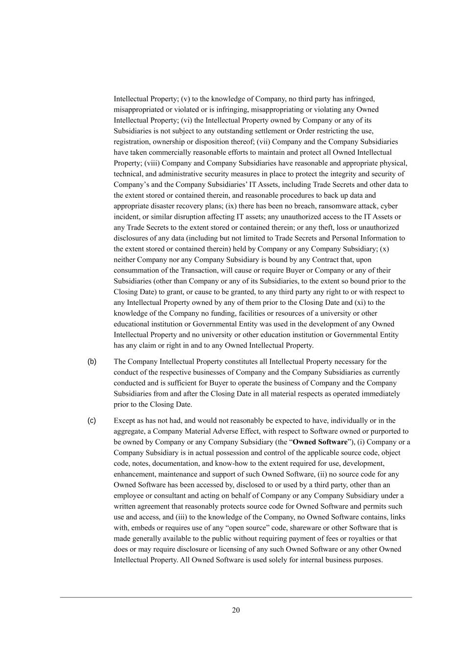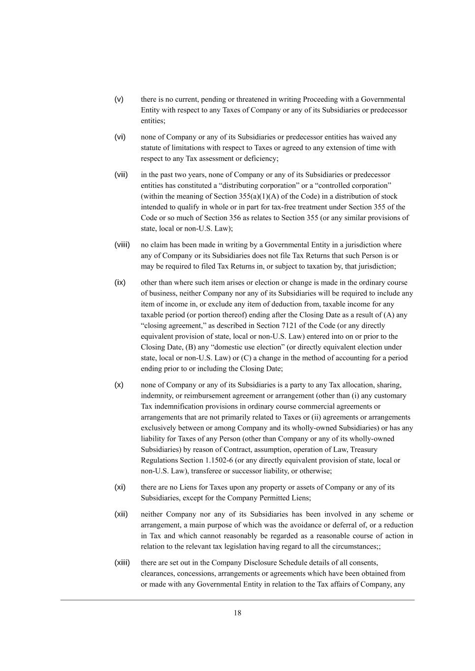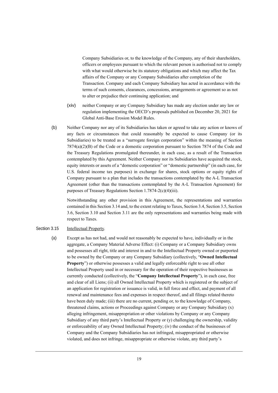 /7 =ecfWdo MkXi_Z_Wh_[i eh* je j^[ ademb[Z][ e\ j^[ =ecfWdo* Wdo e\ j^[_h i^Wh[^ebZ[hi* e\\_Y[hi eh [cfbeo[[i fkhikWdj je m^_Y^ j^[ h[b[lWdj f[hied _i Wkj^eh_i[Z dej je Yecfbo m_j^ m^Wj mekbZ ej^[hm_i[ X[ _ji ijWjkjeho eXb_]Wj_edi WdZ m^_Y^ cWo W\\[Yj j^[ NWn W\\W_hi e\ j^[ =ecfWdo eh Wdo =ecfWdo MkXi_Z_Wh_[i W\j[h Yecfb[j_ed e\ j^[ NhWdiWYj_ed, =ecfWdo WdZ [WY^ =ecfWdo MkXi_Z_Who ^Wi WYj[Z _d WYYehZWdY[ m_j^ j^[ j[hci e\ ikY^ Yedi[dji* Yb[WhWdY[i* YedY[ii_edi* WhhWd][c[dji eh W]h[[c[dj ie Wi dej je Wbj[h eh fh[`kZ_Y[ j^[_h Yedj_dk_d] Wffb_YWj_ed9 WdZ (xiv) d[_j^[h =ecfWdo eh Wdo =ecfWdo MkXi_Z_Who ^Wi cWZ[ Wdo [b[Yj_ed kdZ[h Wdo bWm eh h[]kbWj_ed _cfb[c[dj_d] j^[ I?=>ui fhefeiWbi fkXb_i^[Z ed >[Y[cX[h 0.* 0.0/ \eh AbeXWb ;dj_+<Wi[ ?hei_ed GeZ[b Lkb[i, (b) H[_j^[h =ecfWdo deh Wdo e\ _ji MkXi_Z_Wh_[i ^Wi jWa[d eh W]h[[Z je jWa[ Wdo WYj_ed eh ademi e\ Wdo \WYji eh Y_hYkcijWdY[i j^Wj YekbZ h[WiedWXbo X[ [nf[Yj[Z je YWki[ =ecfWdo (eh _ji MkXi_Z_Wh_[i) je X[ jh[Wj[Z Wi W rikhhe]Wj[ \eh[_]d YehfehWj_eds m_j^_d j^[ c[Wd_d] e\ M[Yj_ed 5652(W)(0)(<) e\ j^[ =eZ[ eh W Zec[ij_Y YehfehWj_ed fkhikWdj je M[Yj_ed 5652 e\ j^[ =eZ[ WdZ j^[ Nh[Wikho L[]kbWj_edi fheckb]Wj[Z j^[h[kdZ[h* _d [WY^ YWi[* Wi W h[ikbj e\ j^[ NhWdiWYj_ed Yedj[cfbWj[Z Xo j^_i ;]h[[c[dj, H[_j^[h =ecfWdo deh _ji MkXi_Z_Wh_[i ^Wl[ WYgk_h[Z j^[ ijeYa* [gk_jo _dj[h[iji eh Wii[ji e\ W rZec[ij_Y YehfehWj_eds eh rZec[ij_Y fWhjd[hi^_fs (_d [WY^ YWi[* \eh O,M, \[Z[hWb _dYec[ jWn fkhfei[i) _d [nY^Wd][ \eh i^Wh[i* ijeYa efj_edi eh [gk_jo h_]^ji e\ =ecfWdo fkhikWdj je W fbWd j^Wj _dYbkZ[i j^[ jhWdiWYj_edi Yedj[cfbWj[Z Xo j^[ ;+F NhWdiWYj_ed ;]h[[c[dj (ej^[h j^Wd j^[ jhWdiWYj_edi Yedj[cfbWj[Z Xo j^[ ;+F NhWdiWYj_ed ;]h[[c[dj) \eh fkhfei[i e\ Nh[Wikho L[]kbWj_edi M[Yj_ed /,5652+0(Y)(2)(___), Hejm_j^ijWdZ_d] Wdo ej^[h fhel_i_ed _d j^_i ;]h[[c[dj* j^[ h[fh[i[djWj_edi WdZ mWhhWdj_[i YedjW_d[Z _d j^_i M[Yj_ed 1,/2 WdZ* je j^[ [nj[dj h[bWj_d] je NWn[i* M[Yj_ed 1,2* M[Yj_ed 1,3* M[Yj_ed 1,4* M[Yj_ed 1,/. WdZ M[Yj_ed 1,// Wh[ j^[ edbo h[fh[i[djWj_edi WdZ mWhhWdj_[i X[_d] cWZ[ m_j^ h[if[Yj je NWn[i, Section 3.15 Cdj[bb[YjkWb Jhef[hjo, (a) ?nY[fj Wi ^Wi dej ^WZ* WdZ mekbZ dej h[WiedWXbo X[ [nf[Yj[Z je ^Wl[* _dZ_l_ZkWbbo eh _d j^[ W]]h[]Wj[* W =ecfWdo GWj[h_Wb ;Zl[hi[ ?\\[Yj8 (_) =ecfWdo eh W =ecfWdo MkXi_Z_Who emdi WdZ feii[ii[i Wbb h_]^j* j_jb[ WdZ _dj[h[ij _d WdZ je j^[ Cdj[bb[YjkWb Jhef[hjo emd[Z eh fkhfehj[Z je X[ emd[Z Xo j^[ =ecfWdo eh Wdo =ecfWdo MkXi_Z_Who (Yebb[Yj_l[bo* rOwned Intellectual Propertys) eh ej^[hm_i[ feii[ii[i W lWb_Z WdZ b[]Wbbo [d\ehY[WXb[ h_]^j je ki[ Wbb ej^[h Cdj[bb[YjkWb Jhef[hjo ki[Z _d eh d[Y[iiWho \eh j^[ ef[hWj_ed e\ j^[_h h[if[Yj_l[ Xki_d[ii[i Wi Ykhh[djbo YedZkYj[Z (Yebb[Yj_l[bo* j^[ rCompany Intellectual Propertys)* _d [WY^ YWi[* \h[[ WdZ Yb[Wh e\ Wbb F_[di9 (__) Wbb Imd[Z Cdj[bb[YjkWb Jhef[hjo m^_Y^ _i h[]_ij[h[Z eh j^[ ikX`[Yj e\ Wd Wffb_YWj_ed \eh h[]_ijhWj_ed eh _iikWdY[ _i lWb_Z* _d \kbb \ehY[ WdZ [\\[Yj* WdZ fWoc[dj e\ Wbb h[d[mWb WdZ cW_dj[dWdY[ \[[i WdZ [nf[di[i _d h[if[Yj j^[h[e\* WdZ Wbb \_b_d]i h[bWj[Z j^[h[je ^Wl[ X[[d Zkbo cWZ[9 (___) j^[h[ Wh[ de Ykhh[dj* f[dZ_d] eh* je j^[ ademb[Z][ e\ =ecfWdo* j^h[Wj[d[Z YbW_ci* WYj_edi eh JheY[[Z_d]i W]W_dij =ecfWdo eh Wdo =ecfWdo MkXi_Z_Who (n) Wbb[]_d] _d\h_d][c[dj* c_iWffhefh_Wj_ed eh ej^[h l_ebWj_edi Xo =ecfWdo eh Wdo =ecfWdo MkXi_Z_Who e\ Wdo j^_hZ fWhjoui Cdj[bb[YjkWb Jhef[hjo eh (o) Y^Wbb[d]_d] j^[ emd[hi^_f* lWb_Z_jo eh [d\ehY[WX_b_jo e\ Wdo Imd[Z Cdj[bb[YjkWb Jhef[hjo9 (_l) j^[ YedZkYj e\ j^[ Xki_d[ii[i e\ =ecfWdo WdZ j^[ =ecfWdo MkXi_Z_Wh_[i ^Wi dej _d\h_d][Z* c_iWffhefh_Wj[Z eh ej^[hm_i[ l_ebWj[Z* WdZ Ze[i dej _d\h_d][* c_iWffhefh_Wj[ eh ej^[hm_i[ l_ebWj[* Wdo j^_hZ fWhjoui