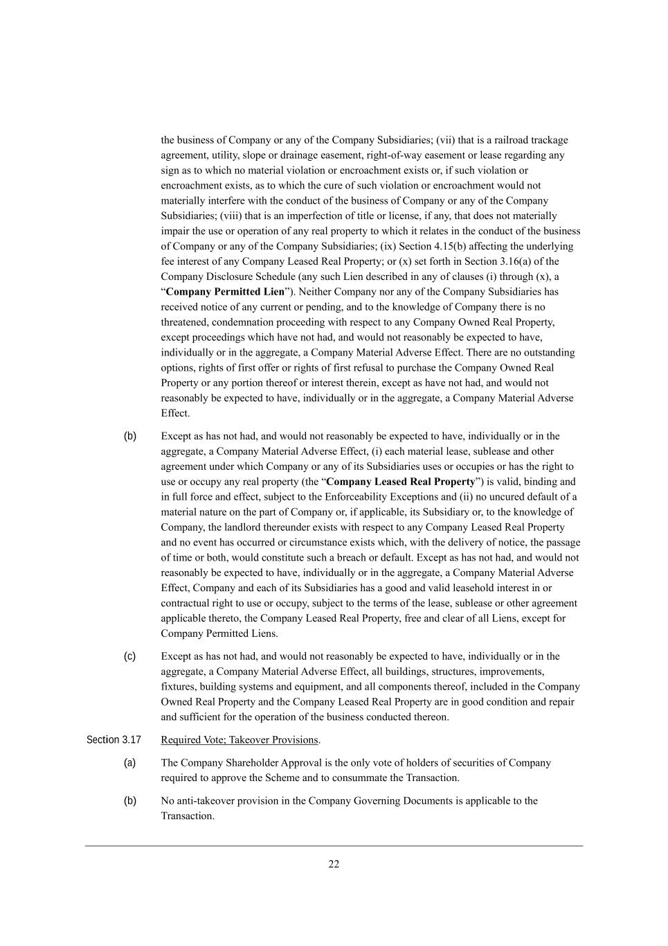 00 j^[ Xki_d[ii e\ =ecfWdo eh Wdo e\ j^[ =ecfWdo MkXi_Z_Wh_[i9 (l__) j^Wj _i W hW_bheWZ jhWYaW][ W]h[[c[dj* kj_b_jo* ibef[ eh ZhW_dW][ [Wi[c[dj* h_]^j+e\+mWo [Wi[c[dj eh b[Wi[ h[]WhZ_d] Wdo i_]d Wi je m^_Y^ de cWj[h_Wb l_ebWj_ed eh [dYheWY^c[dj [n_iji eh* _\ ikY^ l_ebWj_ed eh [dYheWY^c[dj [n_iji* Wi je m^_Y^ j^[ Ykh[ e\ ikY^ l_ebWj_ed eh [dYheWY^c[dj mekbZ dej cWj[h_Wbbo _dj[h\[h[ m_j^ j^[ YedZkYj e\ j^[ Xki_d[ii e\ =ecfWdo eh Wdo e\ j^[ =ecfWdo MkXi_Z_Wh_[i9 (l___) j^Wj _i Wd _cf[h\[Yj_ed e\ j_jb[ eh b_Y[di[* _\ Wdo* j^Wj Ze[i dej cWj[h_Wbbo _cfW_h j^[ ki[ eh ef[hWj_ed e\ Wdo h[Wb fhef[hjo je m^_Y^ _j h[bWj[i _d j^[ YedZkYj e\ j^[ Xki_d[ii e\ =ecfWdo eh Wdo e\ j^[ =ecfWdo MkXi_Z_Wh_[i9 (_n) M[Yj_ed 2,/3(X) W\\[Yj_d] j^[ kdZ[hbo_d] \[[ _dj[h[ij e\ Wdo =ecfWdo F[Wi[Z L[Wb Jhef[hjo9 eh (n) i[j \ehj^ _d M[Yj_ed 1,/4(W) e\ j^[ =ecfWdo >_iYbeikh[ MY^[Zkb[ (Wdo ikY^ F_[d Z[iYh_X[Z _d Wdo e\ YbWki[i (_) j^hek]^ (n)* W rCompany Permitted Liens), H[_j^[h =ecfWdo deh Wdo e\ j^[ =ecfWdo MkXi_Z_Wh_[i ^Wi h[Y[_l[Z dej_Y[ e\ Wdo Ykhh[dj eh f[dZ_d]* WdZ je j^[ ademb[Z][ e\ =ecfWdo j^[h[ _i de j^h[Wj[d[Z* YedZ[cdWj_ed fheY[[Z_d] m_j^ h[if[Yj je Wdo =ecfWdo Imd[Z L[Wb Jhef[hjo* [nY[fj fheY[[Z_d]i m^_Y^ ^Wl[ dej ^WZ* WdZ mekbZ dej h[WiedWXbo X[ [nf[Yj[Z je ^Wl[* _dZ_l_ZkWbbo eh _d j^[ W]]h[]Wj[* W =ecfWdo GWj[h_Wb ;Zl[hi[ ?\\[Yj, N^[h[ Wh[ de ekjijWdZ_d] efj_edi* h_]^ji e\ \_hij e\\[h eh h_]^ji e\ \_hij h[\kiWb je fkhY^Wi[ j^[ =ecfWdo Imd[Z L[Wb Jhef[hjo eh Wdo fehj_ed j^[h[e\ eh _dj[h[ij j^[h[_d* [nY[fj Wi ^Wl[ dej ^WZ* WdZ mekbZ dej h[WiedWXbo X[ [nf[Yj[Z je ^Wl[* _dZ_l_ZkWbbo eh _d j^[ W]]h[]Wj[* W =ecfWdo GWj[h_Wb ;Zl[hi[ ?\\[Yj, (b) ?nY[fj Wi ^Wi dej ^WZ* WdZ mekbZ dej h[WiedWXbo X[ [nf[Yj[Z je ^Wl[* _dZ_l_ZkWbbo eh _d j^[ W]]h[]Wj[* W =ecfWdo GWj[h_Wb ;Zl[hi[ ?\\[Yj* (_) [WY^ cWj[h_Wb b[Wi[* ikXb[Wi[ WdZ ej^[h W]h[[c[dj kdZ[h m^_Y^ =ecfWdo eh Wdo e\ _ji MkXi_Z_Wh_[i ki[i eh eYYkf_[i eh ^Wi j^[ h_]^j je ki[ eh eYYkfo Wdo h[Wb fhef[hjo (j^[ rCompany Leased Real Propertys) _i lWb_Z* X_dZ_d] WdZ _d \kbb \ehY[ WdZ [\\[Yj* ikX`[Yj je j^[ ?d\ehY[WX_b_jo ?nY[fj_edi WdZ (__) de kdYkh[Z Z[\Wkbj e\ W cWj[h_Wb dWjkh[ ed j^[ fWhj e\ =ecfWdo eh* _\ Wffb_YWXb[* _ji MkXi_Z_Who eh* je j^[ ademb[Z][ e\ =ecfWdo* j^[ bWdZbehZ j^[h[kdZ[h [n_iji m_j^ h[if[Yj je Wdo =ecfWdo F[Wi[Z L[Wb Jhef[hjo WdZ de [l[dj ^Wi eYYkhh[Z eh Y_hYkcijWdY[ [n_iji m^_Y^* m_j^ j^[ Z[b_l[ho e\ dej_Y[* j^[ fWiiW][ e\ j_c[ eh Xej^* mekbZ Yedij_jkj[ ikY^ W Xh[WY^ eh Z[\Wkbj, ?nY[fj Wi ^Wi dej ^WZ* WdZ mekbZ dej h[WiedWXbo X[ [nf[Yj[Z je ^Wl[* _dZ_l_ZkWbbo eh _d j^[ W]]h[]Wj[* W =ecfWdo GWj[h_Wb ;Zl[hi[ ?\\[Yj* =ecfWdo WdZ [WY^ e\ _ji MkXi_Z_Wh_[i ^Wi W ]eeZ WdZ lWb_Z b[Wi[^ebZ _dj[h[ij _d eh YedjhWYjkWb h_]^j je ki[ eh eYYkfo* ikX`[Yj je j^[ j[hci e\ j^[ b[Wi[* ikXb[Wi[ eh ej^[h W]h[[c[dj Wffb_YWXb[ j^[h[je* j^[ =ecfWdo F[Wi[Z L[Wb Jhef[hjo* \h[[ WdZ Yb[Wh e\ Wbb F_[di* [nY[fj \eh =ecfWdo J[hc_jj[Z F_[di, (c) ?nY[fj Wi ^Wi dej ^WZ* WdZ mekbZ dej h[WiedWXbo X[ [nf[Yj[Z je ^Wl[* _dZ_l_ZkWbbo eh _d j^[ W]]h[]Wj[* W =ecfWdo GWj[h_Wb ;Zl[hi[ ?\\[Yj* Wbb Xk_bZ_d]i* ijhkYjkh[i* _cfhel[c[dji* \_njkh[i* Xk_bZ_d] ioij[ci WdZ [gk_fc[dj* WdZ Wbb Yecfed[dji j^[h[e\* _dYbkZ[Z _d j^[ =ecfWdo Imd[Z L[Wb Jhef[hjo WdZ j^[ =ecfWdo F[Wi[Z L[Wb Jhef[hjo Wh[ _d ]eeZ YedZ_j_ed WdZ h[fW_h WdZ ik\\_Y_[dj \eh j^[ ef[hWj_ed e\ j^[ Xki_d[ii YedZkYj[Z j^[h[ed, Section 3.17 L[gk_h[Z Pej[9 NWa[el[h Jhel_i_edi, (a) N^[ =ecfWdo M^Wh[^ebZ[h ;ffhelWb _i j^[ edbo lej[ e\ ^ebZ[hi e\ i[Ykh_j_[i e\ =ecfWdo h[gk_h[Z je Wffhel[ j^[ MY^[c[ WdZ je YedikccWj[ j^[ NhWdiWYj_ed, (b) He Wdj_+jWa[el[h fhel_i_ed _d j^[ =ecfWdo Ael[hd_d] >eYkc[dji _i Wffb_YWXb[ je j^[ NhWdiWYj_ed,