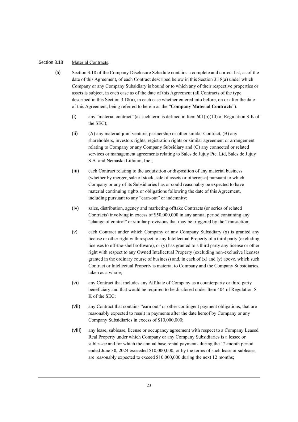 01 Section 3.18 GWj[h_Wb =edjhWYji, (a) M[Yj_ed 1,/6 e\ j^[ =ecfWdo >_iYbeikh[ MY^[Zkb[ YedjW_di W Yecfb[j[ WdZ Yehh[Yj b_ij* Wi e\ j^[ ZWj[ e\ j^_i ;]h[[c[dj* e\ [WY^ =edjhWYj Z[iYh_X[Z X[bem _d j^_i M[Yj_ed 1,/6(W) kdZ[h m^_Y^ =ecfWdo eh Wdo =ecfWdo MkXi_Z_Who _i XekdZ eh je m^_Y^ Wdo e\ j^[_h h[if[Yj_l[ fhef[hj_[i eh Wii[ji _i ikX`[Yj* _d [WY^ YWi[ Wi e\ j^[ ZWj[ e\ j^_i ;]h[[c[dj (Wbb =edjhWYji e\ j^[ jof[ Z[iYh_X[Z _d j^_i M[Yj_ed 1,/6(W)* _d [WY^ YWi[ m^[j^[h [dj[h[Z _dje X[\eh[* ed eh W\j[h j^[ ZWj[ e\ j^_i ;]h[[c[dj* X[_d] h[\[hh[Z je ^[h[_d Wi j^[ rCompany Material Contractss)8 (i) Wdo rcWj[h_Wb YedjhWYjs (Wi ikY^ j[hc _i Z[\_d[Z _d Cj[c 4./(X)(/.) e\ L[]kbWj_ed M+E e\ j^[ M?=)9 (ii) (;) Wdo cWj[h_Wb `e_dj l[djkh[* fWhjd[hi^_f eh ej^[h i_c_bWh =edjhWYj* (<) Wdo i^Wh[^ebZ[hi* _dl[ijehi h_]^ji* h[]_ijhWj_ed h_]^ji eh i_c_bWh W]h[[c[dj eh WhhWd][c[dj h[bWj_d] je =ecfWdo eh Wdo =ecfWdo MkXi_Z_Who WdZ (=) Wdo Yedd[Yj[Z eh h[bWj[Z i[hl_Y[i eh cWdW][c[dj W]h[[c[dji h[bWj_d] je MWb[i Z[ Dk`ko Jj[, FjZ* MWb[i Z[ Dk`ko M,;, WdZ H[cWiaW F_j^_kc* CdY,9 (iii) [WY^ =edjhWYj h[bWj_d] je j^[ WYgk_i_j_ed eh Z_ifei_j_ed e\ Wdo cWj[h_Wb Xki_d[ii (m^[j^[h Xo c[h][h* iWb[ e\ ijeYa* iWb[ e\ Wii[ji eh ej^[hm_i[) fkhikWdj je m^_Y^ =ecfWdo eh Wdo e\ _ji MkXi_Z_Wh_[i ^Wi eh YekbZ h[WiedWXbo X[ [nf[Yj[Z je ^Wl[ cWj[h_Wb Yedj_dk_d] h_]^ji eh eXb_]Wj_edi \ebbem_d] j^[ ZWj[ e\ j^_i ;]h[[c[dj* _dYbkZ_d] fkhikWdj je Wdo r[Whd+ekjs eh _dZ[cd_jo9 (iv) iWb[i* Z_ijh_Xkj_ed* W][dYo WdZ cWha[j_d] e\\jWa[ =edjhWYji (eh i[h_[i e\ h[bWj[Z =edjhWYji) _dlebl_d] _d [nY[ii e\ $3.*...*... _d Wdo WddkWb f[h_eZ YedjW_d_d] Wdo rY^Wd][ e\ Yedjhebs eh i_c_bWh fhel_i_edi j^Wj cWo X[ jh_]][h[Z Xo j^[ NhWdiWYj_ed9 (v) [WY^ =edjhWYj kdZ[h m^_Y^ =ecfWdo eh Wdo =ecfWdo MkXi_Z_Who (n) _i ]hWdj[Z Wdo b_Y[di[ eh ej^[h h_]^j m_j^ h[if[Yj je Wdo Cdj[bb[YjkWb Jhef[hjo e\ W j^_hZ fWhjo ([nYbkZ_d] b_Y[di[i je e\\+j^[+i^[b\ ie\jmWh[)* eh (o) ^Wi ]hWdj[Z je W j^_hZ fWhjo Wdo b_Y[di[ eh ej^[h h_]^j m_j^ h[if[Yj je Wdo Imd[Z Cdj[bb[YjkWb Jhef[hjo ([nYbkZ_d] ded+[nYbki_l[ b_Y[di[i ]hWdj[Z _d j^[ ehZ_dWho Yekhi[ e\ Xki_d[ii) WdZ* _d [WY^ e\ (n) WdZ (o) WXel[* m^_Y^ ikY^ =edjhWYj eh Cdj[bb[YjkWb Jhef[hjo _i cWj[h_Wb je =ecfWdo WdZ j^[ =ecfWdo MkXi_Z_Wh_[i* jWa[d Wi W m^eb[9 (vi) Wdo =edjhWYj j^Wj _dYbkZ[i Wdo ;\\_b_Wj[ e\ =ecfWdo Wi W Yekdj[hfWhjo eh j^_hZ fWhjo X[d[\_Y_Who WdZ j^Wj mekbZ X[ h[gk_h[Z je X[ Z_iYbei[Z kdZ[h Cj[c 2.2 e\ L[]kbWj_ed M+ E e\ j^[ M?=9 (vii) Wdo =edjhWYj j^Wj YedjW_di r[Whd ekjs eh ej^[h Yedj_d][dj fWoc[dj eXb_]Wj_edi* j^Wj Wh[ h[WiedWXbo [nf[Yj[Z je h[ikbj _d fWoc[dji W\j[h j^[ ZWj[ ^[h[e\ Xo =ecfWdo eh Wdo =ecfWdo MkXi_Z_Wh_[i _d [nY[ii e\ $/.*...*...9 (viii) Wdo b[Wi[* ikXb[Wi[* b_Y[di[ eh eYYkfWdYo W]h[[c[dj m_j^ h[if[Yj je W =ecfWdo F[Wi[Z L[Wb Jhef[hjo kdZ[h m^_Y^ =ecfWdo eh Wdo =ecfWdo MkXi_Z_Wh_[i _i W b[ii[[ eh ikXb[ii[[ WdZ \eh m^_Y^ j^[ WddkWb XWi[ h[djWb fWoc[dji Zkh_d] j^[ /0+cedj^ f[h_eZ [dZ[Z Dkd[ 1.* 0.02 [nY[[Z[Z $/.*...*...* eh Xo j^[ j[hci e\ ikY^ b[Wi[ eh ikXb[Wi[* Wh[ h[WiedWXbo [nf[Yj[Z je [nY[[Z $/.*...*... Zkh_d] j^[ d[nj /0 cedj^i9