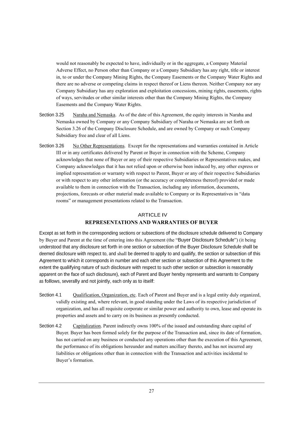 05 mekbZ dej h[WiedWXbo X[ [nf[Yj[Z je ^Wl[* _dZ_l_ZkWbbo eh _d j^[ W]]h[]Wj[* W =ecfWdo GWj[h_Wb ;Zl[hi[ ?\\[Yj* de J[hied ej^[h j^Wd =ecfWdo eh W =ecfWdo MkXi_Z_Who ^Wi Wdo h_]^j* j_jb[ eh _dj[h[ij _d* je eh kdZ[h j^[ =ecfWdo G_d_d] L_]^ji* j^[ =ecfWdo ?Wi[c[dji eh j^[ =ecfWdo QWj[h L_]^ji WdZ j^[h[ Wh[ de WZl[hi[ eh Yecf[j_d] YbW_ci _d h[if[Yj j^[h[e\ eh F_[di j^[h[ed, H[_j^[h =ecfWdo deh Wdo =ecfWdo MkXi_Z_Who ^Wi Wdo [nfbehWj_ed WdZ [nfbe_jWj_ed YedY[ii_edi* c_d_d] h_]^ji* [Wi[c[dji* h_]^ji e\ mWoi* i[hl_jkZ[i eh ej^[h i_c_bWh _dj[h[iji ej^[h j^Wd j^[ =ecfWdo G_d_d] L_]^ji* j^[ =ecfWdo ?Wi[c[dji WdZ j^[ =ecfWdo QWj[h L_]^ji, Section 3.25 HWhW^W WdZ H[cWiaW, ;i e\ j^[ ZWj[ e\ j^_i ;]h[[c[dj* j^[ [gk_jo _dj[h[iji _d HWhW^W WdZ H[cWiaW emd[Z Xo =ecfWdo eh Wdo =ecfWdo MkXi_Z_Who e\ HWhW^W eh H[cWiaW Wh[ i[j \ehj^ ed M[Yj_ed 1,04 e\ j^[ =ecfWdo >_iYbeikh[ MY^[Zkb[* WdZ Wh[ emd[Z Xo =ecfWdo eh ikY^ =ecfWdo MkXi_Z_Who \h[[ WdZ Yb[Wh e\ Wbb F_[di, Section 3.26 He Ij^[h L[fh[i[djWj_edi, ?nY[fj \eh j^[ h[fh[i[djWj_edi WdZ mWhhWdj_[i YedjW_d[Z _d ;hj_Yb[ CCC eh _d Wdo Y[hj_\_YWj[i Z[b_l[h[Z Xo JWh[dj eh <ko[h _d Yedd[Yj_ed m_j^ j^[ MY^[c[* =ecfWdo WYademb[Z][i j^Wj ded[ e\ <ko[h eh Wdo e\ j^[_h h[if[Yj_l[ MkXi_Z_Wh_[i eh L[fh[i[djWj_l[i cWa[i* WdZ =ecfWdo WYademb[Z][i j^Wj _j ^Wi dej h[b_[Z kfed eh ej^[hm_i[ X[[d _dZkY[Z Xo* Wdo ej^[h [nfh[ii eh _cfb_[Z h[fh[i[djWj_ed eh mWhhWdjo m_j^ h[if[Yj je JWh[dj* <ko[h eh Wdo e\ j^[_h h[if[Yj_l[ MkXi_Z_Wh_[i eh m_j^ h[if[Yj je Wdo ej^[h _d\ehcWj_ed (eh j^[ WYYkhWYo eh Yecfb[j[d[ii j^[h[e\) fhel_Z[Z eh cWZ[ WlW_bWXb[ je j^[c _d Yedd[Yj_ed m_j^ j^[ NhWdiWYj_ed* _dYbkZ_d] Wdo _d\ehcWj_ed* ZeYkc[dji* fhe`[Yj_edi* \eh[YWiji eh ej^[h cWj[h_Wb cWZ[ WlW_bWXb[ je =ecfWdo eh _ji L[fh[i[djWj_l[i _d rZWjW heecis eh cWdW][c[dj fh[i[djWj_edi h[bWj[Z je j^[ NhWdiWYj_ed, ARTICLE IV REPRESENTATIONS AND WARRANTIES OF BUYER Except as set forth in the corresponding sections or subsections of the disclosure schedule delivered to Company Xo <ko[h WdZ JWh[dj Wj j^[ j_c[ e\ [dj[h_d] _dje j^_i ;]h[[c[dj (j^[ rBuyer Disclosure Schedules) (_j X[_d] understood that any disclosure set forth in one section or subsection of the Buyer Disclosure Schedule shall be deemed disclosure with respect to, and i^Wbb be deemed to apply to and qualify, the section or subsection of this Agreement to which it corresponds in number and each other section or subsection of this Agreement to the extent the qualifying nature of such disclosure with respect to such other section or subsection is reasonably apparent on the face of such disclosure), each of Parent and Buyer hereby represents and warrants to Company as follows, severally and not jointly, each only as to itself: Section 4.1 KkWb_\_YWj_ed* Ih]Wd_pWj_ed* [jY, ?WY^ e\ JWh[dj WdZ <ko[h WdZ _i W b[]Wb [dj_jo Zkbo eh]Wd_p[Z* lWb_Zbo [n_ij_d] WdZ* m^[h[ h[b[lWdj* _d ]eeZ ijWdZ_d] kdZ[h j^[ FWmi e\ _ji h[if[Yj_l[ `kh_iZ_Yj_ed e\ eh]Wd_pWj_ed* WdZ ^Wi Wbb h[gk_i_j[ YehfehWj[ eh i_c_bWh fem[h WdZ Wkj^eh_jo je emd* b[Wi[ WdZ ef[hWj[ _ji fhef[hj_[i WdZ Wii[ji WdZ je YWhho ed _ji Xki_d[ii Wi fh[i[djbo YedZkYj[Z, Section 4.2 =Wf_jWb_pWj_ed, JWh[dj _dZ_h[Yjbo emdi /..% e\ j^[ _iik[Z WdZ ekjijWdZ_d] i^Wh[ YWf_jWb e\ <ko[h, <ko[h ^Wi X[[d \ehc[Z ieb[bo \eh j^[ fkhfei[ e\ j^[ NhWdiWYj_ed WdZ* i_dY[ _ji ZWj[ e\ \ehcWj_ed* ^Wi dej YWhh_[Z ed Wdo Xki_d[ii eh YedZkYj[Z Wdo ef[hWj_edi ej^[h j^Wd j^[ [n[Ykj_ed e\ j^_i ;]h[[c[dj* j^[ f[h\ehcWdY[ e\ _ji eXb_]Wj_edi ^[h[kdZ[h WdZ cWjj[hi WdY_bbWho j^[h[je* WdZ ^Wi dej _dYkhh[Z Wdo b_WX_b_j_[i eh eXb_]Wj_edi ej^[h j^Wd _d Yedd[Yj_ed m_j^ j^[ NhWdiWYj_ed WdZ WYj_l_j_[i _dY_Z[djWb je <ko[hui \ehcWj_ed,