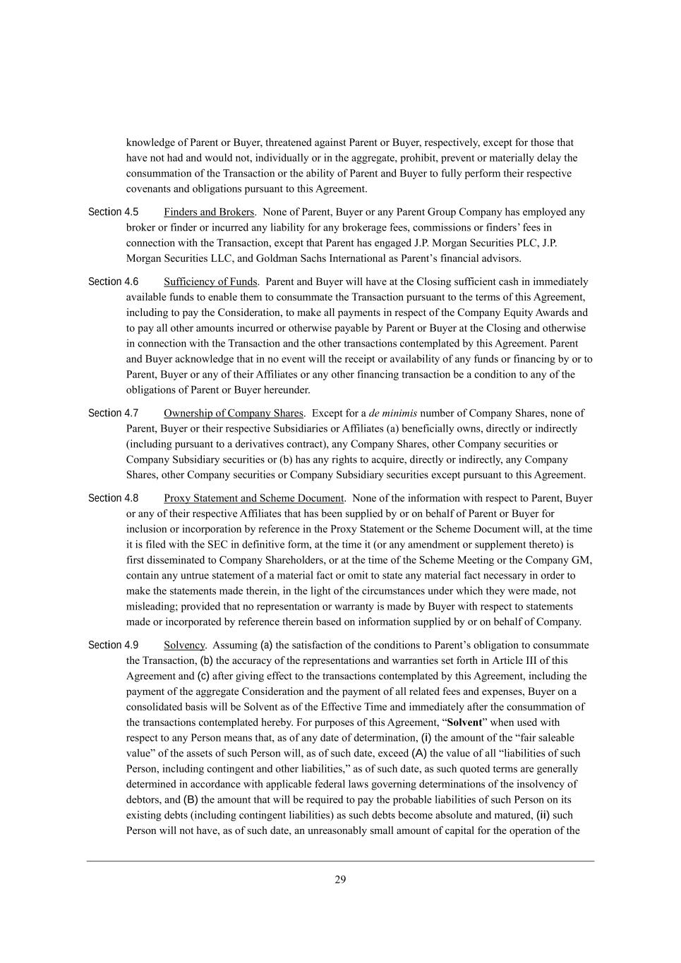 07 ademb[Z][ e\ JWh[dj eh <ko[h* j^h[Wj[d[Z W]W_dij JWh[dj eh <ko[h* h[if[Yj_l[bo* [nY[fj \eh j^ei[ j^Wj ^Wl[ dej ^WZ WdZ mekbZ dej* _dZ_l_ZkWbbo eh _d j^[ W]]h[]Wj[* fhe^_X_j* fh[l[dj eh cWj[h_Wbbo Z[bWo j^[ YedikccWj_ed e\ j^[ NhWdiWYj_ed eh j^[ WX_b_jo e\ JWh[dj WdZ <ko[h je \kbbo f[h\ehc j^[_h h[if[Yj_l[ Yel[dWdji WdZ eXb_]Wj_edi fkhikWdj je j^_i ;]h[[c[dj, Section 4.5 @_dZ[hi WdZ <hea[hi, Hed[ e\ JWh[dj* <ko[h eh Wdo JWh[dj Ahekf =ecfWdo ^Wi [cfbeo[Z Wdo Xhea[h eh \_dZ[h eh _dYkhh[Z Wdo b_WX_b_jo \eh Wdo Xhea[hW][ \[[i* Yecc_ii_edi eh \_dZ[hiu \[[i _d Yedd[Yj_ed m_j^ j^[ NhWdiWYj_ed* [nY[fj j^Wj JWh[dj ^Wi [d]W][Z D,J, Geh]Wd M[Ykh_j_[i JF=* D,J, Geh]Wd M[Ykh_j_[i FF=* WdZ AebZcWd MWY^i Cdj[hdWj_edWb Wi JWh[djui \_dWdY_Wb WZl_iehi, Section 4.6 Mk\\_Y_[dYo e\ @kdZi, JWh[dj WdZ <ko[h m_bb ^Wl[ Wj j^[ =bei_d] ik\\_Y_[dj YWi^ _d _cc[Z_Wj[bo WlW_bWXb[ \kdZi je [dWXb[ j^[c je YedikccWj[ j^[ NhWdiWYj_ed fkhikWdj je j^[ j[hci e\ j^_i ;]h[[c[dj* _dYbkZ_d] je fWo j^[ =edi_Z[hWj_ed* je cWa[ Wbb fWoc[dji _d h[if[Yj e\ j^[ =ecfWdo ?gk_jo ;mWhZi WdZ je fWo Wbb ej^[h Wcekdji _dYkhh[Z eh ej^[hm_i[ fWoWXb[ Xo JWh[dj eh <ko[h Wj j^[ =bei_d] WdZ ej^[hm_i[ _d Yedd[Yj_ed m_j^ j^[ NhWdiWYj_ed WdZ j^[ ej^[h jhWdiWYj_edi Yedj[cfbWj[Z Xo j^_i ;]h[[c[dj, JWh[dj WdZ <ko[h WYademb[Z][ j^Wj _d de [l[dj m_bb j^[ h[Y[_fj eh WlW_bWX_b_jo e\ Wdo \kdZi eh \_dWdY_d] Xo eh je JWh[dj* <ko[h eh Wdo e\ j^[_h ;\\_b_Wj[i eh Wdo ej^[h \_dWdY_d] jhWdiWYj_ed X[ W YedZ_j_ed je Wdo e\ j^[ eXb_]Wj_edi e\ JWh[dj eh <ko[h ^[h[kdZ[h, Section 4.7 Imd[hi^_f e\ =ecfWdo M^Wh[i, ?nY[fj \eh W de minimis dkcX[h e\ =ecfWdo M^Wh[i* ded[ e\ JWh[dj* <ko[h eh j^[_h h[if[Yj_l[ MkXi_Z_Wh_[i eh ;\\_b_Wj[i (W) X[d[\_Y_Wbbo emdi* Z_h[Yjbo eh _dZ_h[Yjbo (_dYbkZ_d] fkhikWdj je W Z[h_lWj_l[i YedjhWYj)* Wdo =ecfWdo M^Wh[i* ej^[h =ecfWdo i[Ykh_j_[i eh =ecfWdo MkXi_Z_Who i[Ykh_j_[i eh (X) ^Wi Wdo h_]^ji je WYgk_h[* Z_h[Yjbo eh _dZ_h[Yjbo* Wdo =ecfWdo M^Wh[i* ej^[h =ecfWdo i[Ykh_j_[i eh =ecfWdo MkXi_Z_Who i[Ykh_j_[i [nY[fj fkhikWdj je j^_i ;]h[[c[dj, Section 4.8 Jheno MjWj[c[dj WdZ MY^[c[ >eYkc[dj, Hed[ e\ j^[ _d\ehcWj_ed m_j^ h[if[Yj je JWh[dj* <ko[h eh Wdo e\ j^[_h h[if[Yj_l[ ;\\_b_Wj[i j^Wj ^Wi X[[d ikffb_[Z Xo eh ed X[^Wb\ e\ JWh[dj eh <ko[h \eh _dYbki_ed eh _dYehfehWj_ed Xo h[\[h[dY[ _d j^[ Jheno MjWj[c[dj eh j^[ MY^[c[ >eYkc[dj m_bb* Wj j^[ j_c[ _j _i \_b[Z m_j^ j^[ M?= _d Z[\_d_j_l[ \ehc* Wj j^[ j_c[ _j (eh Wdo Wc[dZc[dj eh ikffb[c[dj j^[h[je) _i \_hij Z_ii[c_dWj[Z je =ecfWdo M^Wh[^ebZ[hi* eh Wj j^[ j_c[ e\ j^[ MY^[c[ G[[j_d] eh j^[ =ecfWdo AG* YedjW_d Wdo kdjhk[ ijWj[c[dj e\ W cWj[h_Wb \WYj eh ec_j je ijWj[ Wdo cWj[h_Wb \WYj d[Y[iiWho _d ehZ[h je cWa[ j^[ ijWj[c[dji cWZ[ j^[h[_d* _d j^[ b_]^j e\ j^[ Y_hYkcijWdY[i kdZ[h m^_Y^ j^[o m[h[ cWZ[* dej c_ib[WZ_d]9 fhel_Z[Z j^Wj de h[fh[i[djWj_ed eh mWhhWdjo _i cWZ[ Xo <ko[h m_j^ h[if[Yj je ijWj[c[dji cWZ[ eh _dYehfehWj[Z Xo h[\[h[dY[ j^[h[_d XWi[Z ed _d\ehcWj_ed ikffb_[Z Xo eh ed X[^Wb\ e\ =ecfWdo, Section 4.9 Mebl[dYo, ;iikc_d] (a) j^[ iWj_i\WYj_ed e\ j^[ YedZ_j_edi je JWh[djui eXb_]Wj_ed je YedikccWj[ j^[ NhWdiWYj_ed* (b) j^[ WYYkhWYo e\ j^[ h[fh[i[djWj_edi WdZ mWhhWdj_[i i[j \ehj^ _d ;hj_Yb[ CCC e\ j^_i ;]h[[c[dj WdZ (c) W\j[h ]_l_d] [\\[Yj je j^[ jhWdiWYj_edi Yedj[cfbWj[Z Xo j^_i ;]h[[c[dj* _dYbkZ_d] j^[ fWoc[dj e\ j^[ W]]h[]Wj[ =edi_Z[hWj_ed WdZ j^[ fWoc[dj e\ Wbb h[bWj[Z \[[i WdZ [nf[di[i* <ko[h ed W Yedieb_ZWj[Z XWi_i m_bb X[ Mebl[dj Wi e\ j^[ ?\\[Yj_l[ N_c[ WdZ _cc[Z_Wj[bo W\j[h j^[ YedikccWj_ed e\ j^[ jhWdiWYj_edi Yedj[cfbWj[Z ^[h[Xo, @eh fkhfei[i e\ j^_i ;]h[[c[dj* rSolvents m^[d ki[Z m_j^ h[if[Yj je Wdo J[hied c[Wdi j^Wj* Wi e\ Wdo ZWj[ e\ Z[j[hc_dWj_ed* (i) j^[ Wcekdj e\ j^[ r\W_h iWb[WXb[ lWbk[s e\ j^[ Wii[ji e\ ikY^ J[hied m_bb* Wi e\ ikY^ ZWj[* [nY[[Z (A) j^[ lWbk[ e\ Wbb rb_WX_b_j_[i e\ ikY^ J[hied* _dYbkZ_d] Yedj_d][dj WdZ ej^[h b_WX_b_j_[i*s Wi e\ ikY^ ZWj[* Wi ikY^ gkej[Z j[hci Wh[ ][d[hWbbo Z[j[hc_d[Z _d WYYehZWdY[ m_j^ Wffb_YWXb[ \[Z[hWb bWmi ]el[hd_d] Z[j[hc_dWj_edi e\ j^[ _diebl[dYo e\ Z[Xjehi* WdZ (B) j^[ Wcekdj j^Wj m_bb X[ h[gk_h[Z je fWo j^[ fheXWXb[ b_WX_b_j_[i e\ ikY^ J[hied ed _ji [n_ij_d] Z[Xji (_dYbkZ_d] Yedj_d][dj b_WX_b_j_[i) Wi ikY^ Z[Xji X[Yec[ WXiebkj[ WdZ cWjkh[Z* (ii) ikY^ J[hied m_bb dej ^Wl[* Wi e\ ikY^ ZWj[* Wd kdh[WiedWXbo icWbb Wcekdj e\ YWf_jWb \eh j^[ ef[hWj_ed e\ j^[
