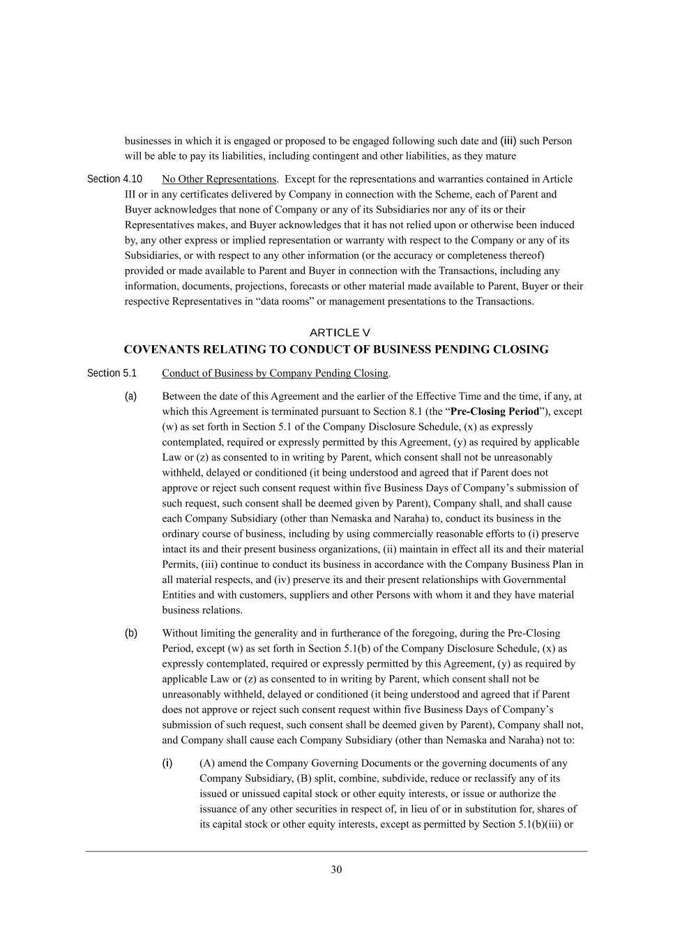 1. Xki_d[ii[i _d m^_Y^ _j _i [d]W][Z eh fhefei[Z je X[ [d]W][Z \ebbem_d] ikY^ ZWj[ WdZ (iii) ikY^ J[hied m_bb X[ WXb[ je fWo _ji b_WX_b_j_[i* _dYbkZ_d] Yedj_d][dj WdZ ej^[h b_WX_b_j_[i* Wi j^[o cWjkh[ Section 4.10 He Ij^[h L[fh[i[djWj_edi, ?nY[fj \eh j^[ h[fh[i[djWj_edi WdZ mWhhWdj_[i YedjW_d[Z _d ;hj_Yb[ CCC eh _d Wdo Y[hj_\_YWj[i Z[b_l[h[Z Xo =ecfWdo _d Yedd[Yj_ed m_j^ j^[ MY^[c[* [WY^ e\ JWh[dj WdZ <ko[h WYademb[Z][i j^Wj ded[ e\ =ecfWdo eh Wdo e\ _ji MkXi_Z_Wh_[i deh Wdo e\ _ji eh j^[_h L[fh[i[djWj_l[i cWa[i* WdZ <ko[h WYademb[Z][i j^Wj _j ^Wi dej h[b_[Z kfed eh ej^[hm_i[ X[[d _dZkY[Z Xo* Wdo ej^[h [nfh[ii eh _cfb_[Z h[fh[i[djWj_ed eh mWhhWdjo m_j^ h[if[Yj je j^[ =ecfWdo eh Wdo e\ _ji MkXi_Z_Wh_[i* eh m_j^ h[if[Yj je Wdo ej^[h _d\ehcWj_ed (eh j^[ WYYkhWYo eh Yecfb[j[d[ii j^[h[e\) fhel_Z[Z eh cWZ[ WlW_bWXb[ je JWh[dj WdZ <ko[h _d Yedd[Yj_ed m_j^ j^[ NhWdiWYj_edi* _dYbkZ_d] Wdo _d\ehcWj_ed* ZeYkc[dji* fhe`[Yj_edi* \eh[YWiji eh ej^[h cWj[h_Wb cWZ[ WlW_bWXb[ je JWh[dj* <ko[h eh j^[_h h[if[Yj_l[ L[fh[i[djWj_l[i _d rZWjW heecis eh cWdW][c[dj fh[i[djWj_edi je j^[ NhWdiWYj_edi, ARTICLE V COVENANTS RELATING TO CONDUCT OF BUSINESS PENDING CLOSING Section 5.1 =edZkYj e\ <ki_d[ii Xo =ecfWdo J[dZ_d] =bei_d], (a) <[jm[[d j^[ ZWj[ e\ j^_i ;]h[[c[dj WdZ j^[ [Whb_[h e\ j^[ ?\\[Yj_l[ N_c[ WdZ j^[ j_c[* _\ Wdo* Wj m^_Y^ j^_i ;]h[[c[dj _i j[hc_dWj[Z fkhikWdj je M[Yj_ed 6,/ (j^[ rPre-Closing Periods)* [nY[fj (m) Wi i[j \ehj^ _d M[Yj_ed 3,/ e\ j^[ =ecfWdo >_iYbeikh[ MY^[Zkb[* (n) Wi [nfh[iibo Yedj[cfbWj[Z* h[gk_h[Z eh [nfh[iibo f[hc_jj[Z Xo j^_i ;]h[[c[dj* (o) Wi h[gk_h[Z Xo Wffb_YWXb[ FWm eh (p) Wi Yedi[dj[Z je _d mh_j_d] Xo JWh[dj* m^_Y^ Yedi[dj i^Wbb dej X[ kdh[WiedWXbo m_j^^[bZ* Z[bWo[Z eh YedZ_j_ed[Z (_j X[_d] kdZ[hijeeZ WdZ W]h[[Z j^Wj _\ JWh[dj Ze[i dej Wffhel[ eh h[`[Yj ikY^ Yedi[dj h[gk[ij m_j^_d \_l[ <ki_d[ii >Woi e\ =ecfWdoui ikXc_ii_ed e\ ikY^ h[gk[ij* ikY^ Yedi[dj i^Wbb X[ Z[[c[Z ]_l[d Xo JWh[dj)* =ecfWdo i^Wbb* WdZ i^Wbb YWki[ [WY^ =ecfWdo MkXi_Z_Who (ej^[h j^Wd H[cWiaW WdZ HWhW^W) je* YedZkYj _ji Xki_d[ii _d j^[ ehZ_dWho Yekhi[ e\ Xki_d[ii* _dYbkZ_d] Xo ki_d] Yecc[hY_Wbbo h[WiedWXb[ [\\ehji je (_) fh[i[hl[ _djWYj _ji WdZ j^[_h fh[i[dj Xki_d[ii eh]Wd_pWj_edi* (__) cW_djW_d _d [\\[Yj Wbb _ji WdZ j^[_h cWj[h_Wb J[hc_ji* (___) Yedj_dk[ je YedZkYj _ji Xki_d[ii _d WYYehZWdY[ m_j^ j^[ =ecfWdo <ki_d[ii JbWd _d Wbb cWj[h_Wb h[if[Yji* WdZ (_l) fh[i[hl[ _ji WdZ j^[_h fh[i[dj h[bWj_edi^_fi m_j^ Ael[hdc[djWb ?dj_j_[i WdZ m_j^ Ykijec[hi* ikffb_[hi WdZ ej^[h J[hiedi m_j^ m^ec _j WdZ j^[o ^Wl[ cWj[h_Wb Xki_d[ii h[bWj_edi, (b) Q_j^ekj b_c_j_d] j^[ ][d[hWb_jo WdZ _d \khj^[hWdY[ e\ j^[ \eh[]e_d]* Zkh_d] j^[ Jh[+=bei_d] J[h_eZ* [nY[fj (m) Wi i[j \ehj^ _d M[Yj_ed 3,/(X) e\ j^[ =ecfWdo >_iYbeikh[ MY^[Zkb[* (n) Wi [nfh[iibo Yedj[cfbWj[Z* h[gk_h[Z eh [nfh[iibo f[hc_jj[Z Xo j^_i ;]h[[c[dj* (o) Wi h[gk_h[Z Xo Wffb_YWXb[ FWm eh (p) Wi Yedi[dj[Z je _d mh_j_d] Xo JWh[dj* m^_Y^ Yedi[dj i^Wbb dej X[ kdh[WiedWXbo m_j^^[bZ* Z[bWo[Z eh YedZ_j_ed[Z (_j X[_d] kdZ[hijeeZ WdZ W]h[[Z j^Wj _\ JWh[dj Ze[i dej Wffhel[ eh h[`[Yj ikY^ Yedi[dj h[gk[ij m_j^_d \_l[ <ki_d[ii >Woi e\ =ecfWdoui ikXc_ii_ed e\ ikY^ h[gk[ij* ikY^ Yedi[dj i^Wbb X[ Z[[c[Z ]_l[d Xo JWh[dj)* =ecfWdo i^Wbb dej* WdZ =ecfWdo i^Wbb YWki[ [WY^ =ecfWdo MkXi_Z_Who (ej^[h j^Wd H[cWiaW WdZ HWhW^W) dej je8 (i) (;) Wc[dZ j^[ =ecfWdo Ael[hd_d] >eYkc[dji eh j^[ ]el[hd_d] ZeYkc[dji e\ Wdo =ecfWdo MkXi_Z_Who* (<) ifb_j* YecX_d[* ikXZ_l_Z[* h[ZkY[ eh h[YbWii_\o Wdo e\ _ji _iik[Z eh kd_iik[Z YWf_jWb ijeYa eh ej^[h [gk_jo _dj[h[iji* eh _iik[ eh Wkj^eh_p[ j^[ _iikWdY[ e\ Wdo ej^[h i[Ykh_j_[i _d h[if[Yj e\* _d b_[k e\ eh _d ikXij_jkj_ed \eh* i^Wh[i e\ _ji YWf_jWb ijeYa eh ej^[h [gk_jo _dj[h[iji* [nY[fj Wi f[hc_jj[Z Xo M[Yj_ed 3,/(X)(___) eh