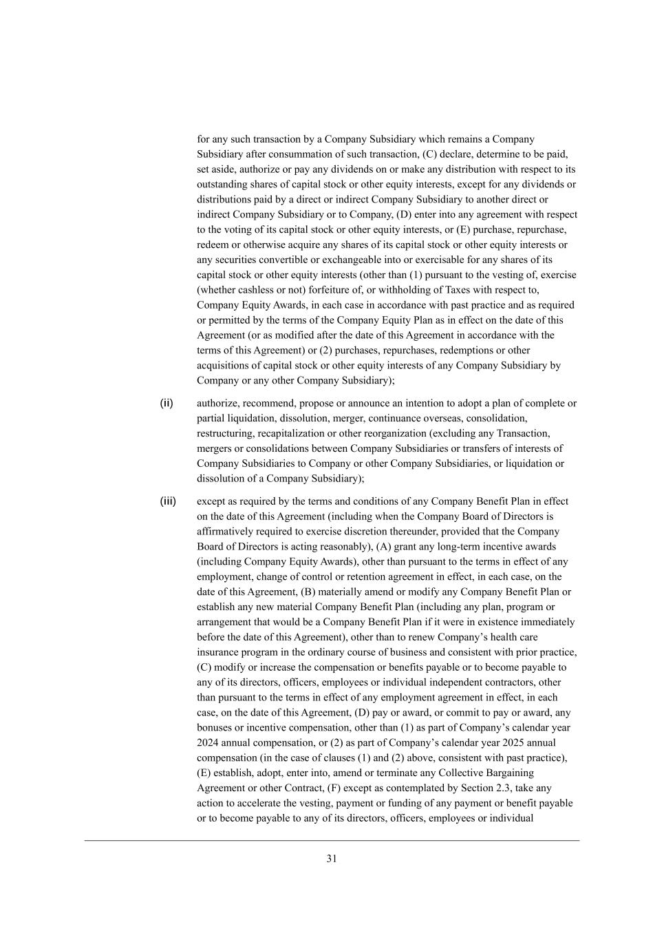 10 _dZ[f[dZ[dj YedjhWYjehi* (A) j[hc_dWj[ j^[ [cfbeoc[dj e\ Wdo [n[Ykj_l[ e\\_Y[h e\ =ecfWdo* ej^[h j^Wd \eh YWki[* (B) ^_h[ Wdo i[d_eh [cfbeo[[ ^Wl_d] jejWb jWh][j WddkWb YWi^ Yecf[diWj_ed e\ ceh[ j^Wd $1..*... eh Wdo [n[Ykj_l[ e\\_Y[h e\ =ecfWdo* _d [WY^ YWi[ ej^[h j^Wd je \_bb ef[d fei_j_edi eh fei_j_edi j^Wj X[Yec[ ef[d* je Yecfb[j[ ^_h_d]i j^Wj Wh[ Wbh[WZo _d fhe]h[ii Wi e\ j^[ ZWj[ ^[h[e\ eh je \_bb d[m heb[i j^Wj ^Wl[ X[[d Zkbo XkZ][j[Z WdZ Wffhel[Z* eh (C) _cfb[c[dj eh WddekdY[ Wdo [cfbeo[[ bWoe\\i (ej^[h j^Wd \eh YWki[ eh _d j^[ ehZ_dWho Yekhi[ e\ Xki_d[ii)9 (iv) cWa[ Wdo cWj[h_Wb Y^Wd][ _d \_dWdY_Wb WYYekdj_d] feb_Y_[i* fh_dY_fb[i* fhWYj_Y[i eh fheY[Zkh[i eh Wdo e\ _ji c[j^eZi e\ h[fehj_d] _dYec[* Z[ZkYj_edi eh ej^[h cWj[h_Wb _j[ci \eh \_dWdY_Wb WYYekdj_d] fkhfei[i* [nY[fj Wi h[gk_h[Z Xo A;;J* Wffb_YWXb[ FWm eh M?= hkb[i9 (v) Wkj^eh_p[ eh WddekdY[ Wd _dj[dj_ed je Wkj^eh_p[* eh [dj[h _dje W]h[[c[dji fhel_Z_d] \eh* Wdo WYgk_i_j_edi e\ Wdo Xki_d[ii eh _dl[ijc[dji _d j^_hZ fWhj_[i (ej^[h j^Wd Wdo YWf_jWb [nf[dZ_jkh[i* m^_Y^ Wh[ j^[ ikX`[Yj e\ M[Yj_ed 3,/(X)(n___))* m^[j^[h Xo c[h][h* Yedieb_ZWj_ed* fkhY^Wi[ e\ fhef[hjo eh Wii[ji* `e_dj l[djkh[* b_Y[di[i eh ej^[hm_i[* [nY[fj \eh ikY^ jhWdiWYj_edi \eh Yedi_Z[hWj_ed (_dYbkZ_d] Wiikcfj_ed e\ b_WX_b_j_[i) j^Wj Ze dej [nY[[Z (m^[d jWa[d je][j^[h m_j^ Wbb ej^[h ikY^ jhWdiWYj_edi) $/.*...*... _d j^[ W]]h[]Wj[ (lWbk_d] Wdo ded+YWi^ Yedi_Z[hWj_ed Wj _ji \W_h cWha[j lWbk[ Wi e\ j^[ ZWj[ e\ j^[ W]h[[c[dj \eh ikY^ WYgk_i_j_ed)9 (vi) [dj[h _dje Wdo d[m cWj[h_Wb b_d[ e\ Xki_d[ii ej^[h j^Wd Wdo b_d[ e\ Xki_d[ii j^Wj _i h[WiedWXbo WdY_bbWho je eh W h[WiedWXbo \eh[i[[WXb[ [nj[di_ed e\ Wdo b_d[ e\ Xki_d[ii [d]W][Z _d Xo JWh[dj eh <ko[h Wi e\ j^[ ZWj[ e\ j^_i ;]h[[c[dj9 (vii) _iik[* Z[b_l[h* ]hWdj* i[bb* jhWdi\[h* fb[Z][* Z_ifei[ e\ eh [dYkcX[h* eh Wkj^eh_p[ j^[ _iikWdY[* Z[b_l[ho* ]hWdj* iWb[* jhWdi\[h* fb[Z][* Z_ifei_j_ed eh [dYkcXhWdY[ e\* Wdo i^Wh[i e\ YWf_jWb ijeYa* lej_d] i[Ykh_j_[i eh ej^[h [gk_jo _dj[h[iji _d =ecfWdo eh Wdo =ecfWdo MkXi_Z_Who eh Wdo i[Ykh_j_[i Yedl[hj_Xb[ _dje eh [nY^Wd][WXb[ \eh Wdo ikY^ i^Wh[i* lej_d] i[Ykh_j_[i eh [gk_jo _dj[h[iji* eh Wdo h_]^ji* mWhhWdji eh efj_edi je WYgk_h[ Wdo ikY^ i^Wh[i e\ _ji YWf_jWb ijeYa* lej_d] i[Ykh_j_[i eh [gk_jo _dj[h[iji eh Wdo rf^Wdjecs ijeYa* rf^Wdjecs ijeYa h_]^ji* ijeYa Wffh[Y_Wj_ed h_]^ji eh ijeYa XWi[Z f[h\ehcWdY[ kd_ji eh jWa[ Wdo WYj_ed je YWki[ je X[ [n[hY_iWXb[ Wdo ej^[hm_i[ kd[n[hY_iWXb[ =ecfWdo ?gk_jo ;mWhZ* ej^[h j^Wd (;) Wi ej^[hm_i[ h[gk_h[Z Xo j^[ j[hci WdZ YedZ_j_edi e\ Wdo =ecfWdo ?gk_jo ;mWhZ Wi _d [\\[Yj ed j^[ ZWj[ ^[h[e\ eh ]hWdj[Z W\j[h j^[ ZWj[ ^[h[e\ Wi [nfh[iibo f[hc_jj[Z ^[h[kdZ[h (_dYbkZ_d] m^[d j^[ =ecfWdo <eWhZ e\ >_h[Yjehi _i W\\_hcWj_l[bo h[gk_h[Z je [n[hY_i[ Z_iYh[j_ed j^[h[kdZ[h* fhel_Z[Z j^Wj j^[ =ecfWdo <eWhZ e\ >_h[Yjehi _i WYj_d] h[WiedWXbo) eh _iik[Z W\j[h j^[ ZWj[ ^[h[e\ _d WYYehZWdY[ m_j^ j^[ j[hci e\ j^_i ;]h[[c[dj* (<) _iikWdY[i e\ =ecfWdo M^Wh[i _d h[if[Yj e\ j^[ i[jjb[c[dj e\ =ecfWdo ?gk_jo ;mWhZi ekjijWdZ_d] ed j^[ ZWj[ ^[h[e\ WdZ _d WYYehZWdY[ m_j^ j^[_h h[if[Yj_l[ j[hci Wi _d [\\[Yj ed j^[ ZWj[ ^[h[e\ eh ]hWdj[Z W\j[h j^[ ZWj[ ^[h[e\ Wi [nfh[iibo f[hc_jj[Z ^[h[kdZ[h* (=) Wi f[hc_jj[Z Xo M[Yj_ed 3,/(X)(___) WXel[ eh (>) _iikWdY[i e\ i[Ykh_j_[i je =ecfWdo Xo W =ecfWdo MkXi_Z_Who eh X[jm[[d =ecfWdo MkXi_Z_Wh_[i9 (viii) Yh[Wj[* _dYkh* Wiikc[ eh ej^[hm_i[ X[Yec[ b_WXb[ m_j^ h[if[Yj je Wdo CdZ[Xj[Zd[ii (m^[j^[h [l_Z[dY[Z Xo W dej[ eh ej^[h _dijhkc[dj* fkhikWdj je Wd _iikWdY[ e\ Z[Xj