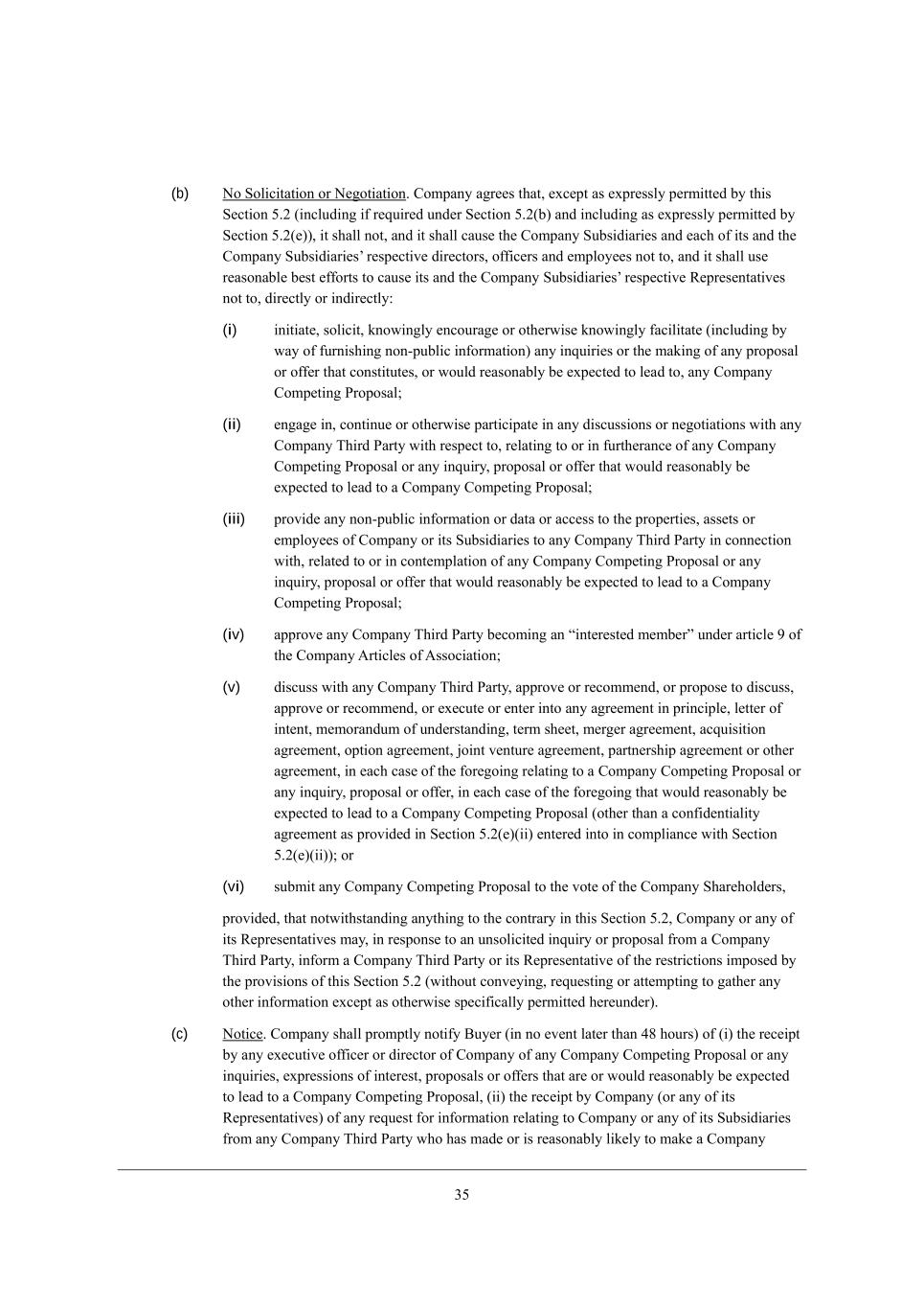 12 (xiii) cWa[ eh Yecc_j je Wdo d[m YWf_jWb [nf[dZ_jkh[* ej^[h j^Wd (;) _d Yedd[Yj_ed m_j^ j^[ h[fW_h eh h[fbWY[c[dj e\ \WY_b_j_[i* fhef[hj_[i eh Wii[ji Z[ijheo[Z eh ZWcW][Z Zk[ je YWikWbjo eh WYY_Z[dj eh (<) _d j^[ ehZ_dWho Yekhi[ e\ Xki_d[ii eh (=) Wd Wcekdj* _d j^[ W]]h[]Wj[* dej _d [nY[ii e\ /0.% e\ j^[ YWf_jWb [nf[dZ_jkh[ Wcekdj \eh j^[ [_]^j[[d+ cedj^ f[h_eZ \ebbem_d] j^[ ZWj[ e\ j^_i ;]h[[c[dj i[j \ehj^ _d M[Yj_ed 3,/(X)(n___) e\ j^[ =ecfWdo >_iYbeikh[ MY^[Zkb[9 (xiv) [nY[fj _d j^[ ehZ_dWho Yekhi[ e\ Xki_d[ii eh m_j^ h[if[Yj je cWjj[hi j^Wj Wh[ [nfh[iibo f[hc_jj[Z Xo j^[ ej^[h fhel_i_edi e\ j^_i M[Yj_ed 3,/(X)* (;) [dj[h _dje Wdo =edjhWYj j^Wj mekbZ* _\ [dj[h[Z _dje fh_eh je j^[ ZWj[ ^[h[e\* X[ W =ecfWdo GWj[h_Wb =edjhWYj* eh (<) ceZ_\o* Wc[dZ eh j[hc_dWj[ Wdo =ecfWdo GWj[h_Wb =edjhWYj eh mW_l[* h[b[Wi[ eh Wii_]d Wdo cWj[h_Wb h_]^ji* X[d[\_ji eh YbW_ci j^[h[kdZ[h9 eh (xv) W]h[[* h[iebl[ eh Yecc_j* _d mh_j_d] eh ej^[hm_i[* je Ze Wdo e\ j^[ \eh[]e_d], (c) >kh_d] j^[ Jh[+=bei_d] J[h_eZ* [nY[fj (m) Wi i[j \ehj^ _d M[Yj_ed 3,/ e\ j^[ =ecfWdo >_iYbeikh[ MY^[Zkb[* (n) Wi [nfh[iibo Yedj[cfbWj[Z* h[gk_h[Z eh [nfh[iibo f[hc_jj[Z Xo j^_i ;]h[[c[dj* (o) Wi h[gk_h[Z Xo Wffb_YWXb[ FWm eh (p) Wi Yedi[dj[Z je _d mh_j_d] Xo JWh[dj* m^_Y^ Yedi[dj i^Wbb dej X[ kdh[WiedWXbo m_j^^[bZ* Z[bWo[Z eh YedZ_j_ed[Z (_j X[_d] kdZ[hijeeZ WdZ W]h[[Z j^Wj _\ JWh[dj Ze[i dej Wffhel[ eh h[`[Yj ikY^ Yedi[dj h[gk[ij m_j^_d \_l[ <ki_d[ii >Woi e\ =ecfWdoui ikXc_ii_ed e\ ikY^ h[gk[ij* ikY^ Yedi[dj i^Wbb X[ Z[[c[Z ]_l[d Xo JWh[dj)* =ecfWdo i^Wbb ki[ _ji Yecc[hY_Wbbo h[WiedWXb[ [\\ehji je YWki[ [WY^ e\ H[cWiaW WdZ HWhW^W je YedZkYj _ji Xki_d[ii _d j^[ ehZ_dWho Yekhi[ e\ Xki_d[ii, (d) Q_j^ekj _d Wdo mWo b_c_j_d] Wdo fWhjoui h_]^ji eh eXb_]Wj_edi kdZ[h j^_i ;]h[[c[dj* dej^_d] YedjW_d[Z _d j^_i ;]h[[c[dj i^Wbb ]_l[ JWh[dj eh <ko[h* Z_h[Yjbo eh _dZ_h[Yjbo* j^[ h_]^j je Yedjheb eh Z_h[Yj j^[ ef[hWj_edi e\ =ecfWdo eh Wdo e\ _ji MkXi_Z_Wh_[i fh_eh je j^[ ?\\[Yj_l[ N_c[, Jh_eh je j^[ ?\\[Yj_l[ N_c[* =ecfWdo i^Wbb [n[hY_i[* Yedi_ij[dj m_j^ j^[ j[hci WdZ YedZ_j_edi e\ j^_i ;]h[[c[dj* Yecfb[j[ Yedjheb WdZ ikf[hl_i_ed el[h _ji WdZ _ji MkXi_Z_Wh_[iu h[if[Yj_l[ ef[hWj_edi, Section 5.2 Meb_Y_jWj_ed Xo =ecfWdo, (a) ?nY[fj Wi [nfh[iibo f[hc_jj[Z Xo j^_i M[Yj_ed 3,0* =ecfWdo i^Wbb* WdZ =ecfWdo i^Wbb YWki[ j^[ =ecfWdo MkXi_Z_Wh_[i WdZ [WY^ e\ _ji WdZ j^[ =ecfWdo MkXi_Z_Wh_[iu h[if[Yj_l[ Z_h[Yjehi* e\\_Y[hi WdZ [cfbeo[[i je* WdZ i^Wbb ki[ _ji h[WiedWXb[ X[ij [\\ehji je YWki[ _ji WdZ j^[ =ecfWdo MkXi_Z_Wh_[iu h[if[Yj_l[ j^_hZ+fWhjo YedikbjWdji* \_dWdY_Wb WZl_iehi* WYYekdjWdji* b[]Wb Yekdi[b* _dl[ijc[dj XWda[hi WdZ ej^[h j^_hZ fWhjo W][dji* WZl_iehi WdZ h[fh[i[djWj_l[i je* _cc[Z_Wj[bo Y[Wi[ WdZ YWki[ je X[ j[hc_dWj[Z Wdo Z_iYkii_edi WdZ d[]ej_Wj_edi m_j^ Wdo =ecfWdo N^_hZ JWhjo YedZkYj[Z ^[h[je\eh[ m_j^ h[if[Yj je Wdo _dgk_ho* fhefeiWb eh e\\[h j^Wj Yedij_jkj[i W =ecfWdo =ecf[j_d] JhefeiWb* eh Wdo _dgk_ho* fhefeiWb eh e\\[h j^Wj mekbZ h[WiedWXbo X[ [nf[Yj[Z je b[WZ je W =ecfWdo =ecf[j_d] JhefeiWb, =ecfWdo m_bb fhecfjbo (WdZ _d [WY^ YWi[ m_j^_d 02 ^ekhi \hec j^[ ZWj[ e\ j^_i ;]h[[c[dj) Z[b_l[h mh_jj[d dej_Y[ je [WY^ =ecfWdo N^_hZ JWhjo (WdZ ikY^ =ecfWdo N^_hZ JWhjoui L[fh[i[djWj_l[i) j^Wj ^Wi [n[Ykj[Z W Yed\_Z[dj_Wb_jo W]h[[c[dj \eh fkhfei[i e\ [lWbkWj_d] Wdo jhWdiWYj_ed j^Wj YekbZ X[ W =ecfWdo =ecf[j_d] JhefeiWb je h[jkhd eh Z[ijheo (Wi fhel_Z[Z _d j^[ j[hci e\ ikY^ Yed\_Z[dj_Wb_jo W]h[[c[dj) Wbb Yed\_Z[dj_Wb _d\ehcWj_ed YedY[hd_d] =ecfWdo eh Wdo =ecfWdo MkXi_Z_Who WdZ i^Wbb fhecfjbo (WdZ _d [WY^ YWi[ m_j^_d 02 ^ekhi \hec j^[ ZWj[ e\ j^_i ;]h[[c[dj) j[hc_dWj[ Wbb f^oi_YWb WdZ [b[Yjhed_Y ZWjW WYY[ii fh[l_ekibo ]hWdj[Z je [WY^ ikY^ =ecfWdo N^_hZ JWhjo,