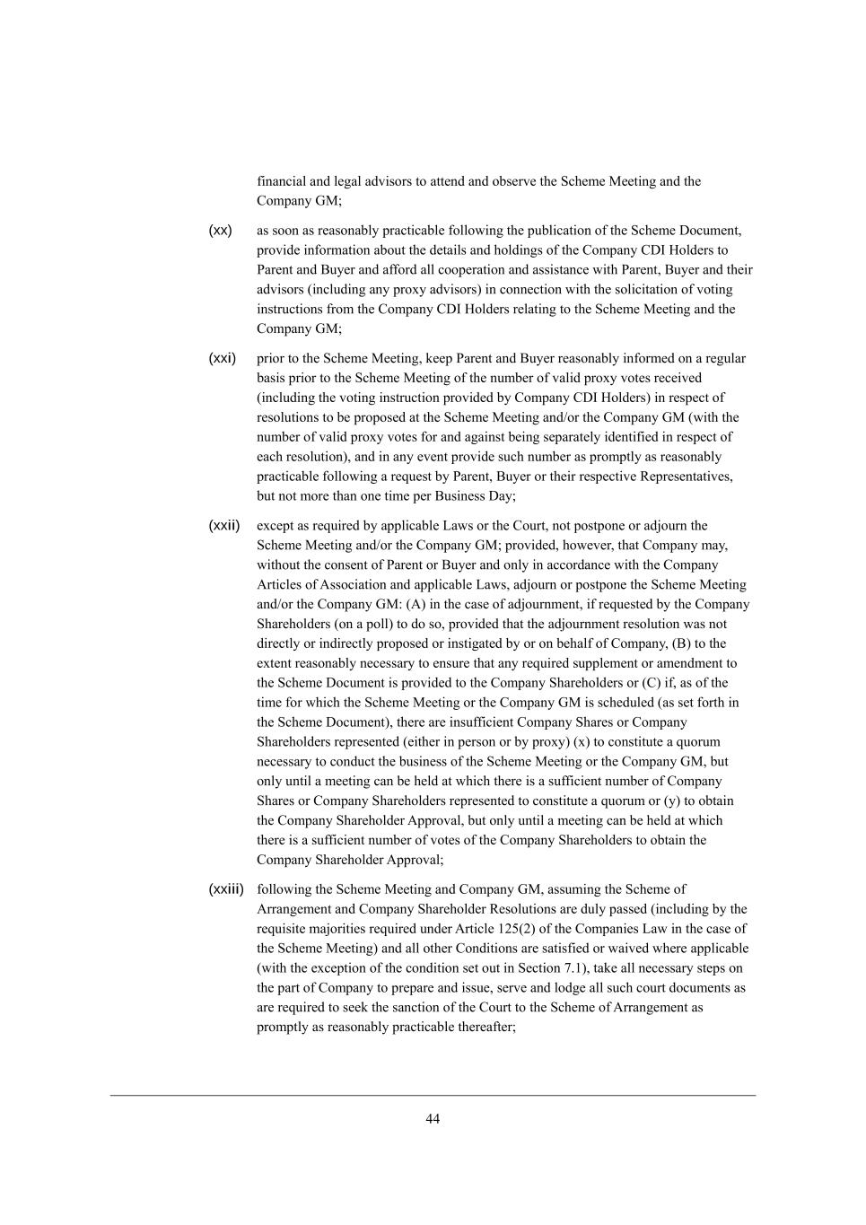 21 (xiv) fhel_Z[ JWh[dj WdZ <ko[h m_j^ ZhW\ji e\ j^[ \ehci e\ fheno \eh ki[ Xo j^[ =ecfWdo M^Wh[^ebZ[hi Wj j^[ =ecfWdo AG WdZ j^[ MY^[c[ G[[j_d] (j^[ rForms of Proxys)* Wbb j^[ d[Y[iiWho [l_Z[dY[ WdZ fb[WZ_d]i _d h[bWj_ed je j^[ Z_h[Yj_edi ^[Wh_d] e\ j^[ =ekhj (j^[ rDirections Court Documentations) WdZ Wdo ikffb[c[djWb Y_hYkbWh eh ZeYkc[dj h[gk_h[Z je X[ fkXb_i^[Z eh ikXc_jj[Z je j^[ =ekhj _d Yedd[Yj_ed m_j^ j^[ MY^[c[ e\ ;hhWd][c[dj eh Wdo lWh_Wj_ed eh Wc[dZc[dj je j^[ MY^[c[ e\ ;hhWd][c[dj (W rScheme Supplemental Documents) (_\ Wffb_YWXb[)* _d [WY^ YWi[ fh[fWh[Z _d WYYehZWdY[ m_j^ Wffb_YWXb[ FWmi WdZ YkijecWho fhWYj_Y[9 (xv) W\\ehZ JWh[dj WdZ <ko[h (eh j^[_h dec_dWj[Z WZl_i[hi) h[WiedWXbo ik\\_Y_[dj j_c[ je h[l_[m [WY^ ZhW\j e\ Wbb ikY^ ZeYkc[dji Z[jW_b[Z _d M[Yj_ed 3,1(W)(___) WXel[ WdZ jWa[ _dje Yedi_Z[hWj_ed _d ]eeZ \W_j^ Wbb Yecc[dji h[WiedWXbo fhefei[Z Xo <ko[h9 (xvi) Wi fhecfjbo Wi h[WiedWXbo fhWYj_YWXb[* dej_\o JWh[dj WdZ <ko[h e\ Wdo cWjj[h e\ m^_Y^ _j X[Yec[i WmWh[ j^Wj mekbZ h[WiedWXbo X[ [nf[Yj[Z je cWj[h_Wbbo Z[bWo eh fh[l[dj \_b_d] e\ j^[ MY^[c[ >eYkc[dj eh j^[ >_h[Yj_edi =ekhj >eYkc[djWj_ed* _dYbkZ_d] m_j^ekj b_c_jWj_ed kfZWj[i je j^[ \_b_d] fheY[ii e\ j^[ Jheno MjWj[c[dj m_j^ j^[ M?=9 fhel_Z[Z j^Wj Wdo \W_bkh[ je Yecfbo m_j^ j^_i M[Yj_ed 3,1(W)(nl_) i^Wbb dej Yedij_jkj[ W Xh[WY^ eh \W_bkh[ je f[h\ehc Xo =ecfWdo m_j^ h[if[Yj je j^[ YedZ_j_edi i[j \ehj^ _d ;hj_Yb[ PCC* eh ]_l[ h_i[ je Wdo h_]^j e\ j[hc_dWj_ed kdZ[h ;hj_Yb[ PCCC9 (xvii) Wi fhecfjbo Wi h[WiedWXbo fhWYj_YWXb[ \ebbem_d] j^[ Jheno MjWj[c[dj =b[WhWdY[ >Wj[* cWa[ Wbb d[Y[iiWho Wffb_YWj_edi je j^[ =ekhj _d Yedd[Yj_ed m_j^ j^[ _cfb[c[djWj_ed e\ j^[ MY^[c[ e\ ;hhWd][c[dj (_dYbkZ_d] Wffbo_d] je j^[ =ekhj \eh b[Wl[ je Yedl[d[ j^[ MY^[c[ G[[j_d] WdZ i[jjb_d] m_j^ j^[ =ekhj j^[ MY^[c[ >eYkc[dj* j^[ @ehci e\ Jheno WdZ Wdo MY^[c[ Mkffb[c[djWb >eYkc[dj WdZ jWa_d] ikY^ ej^[h ij[fi Wi cWo X[ h[gk_h[Z eh Z[i_hWXb[ _d Yedd[Yj_ed m_j^ ikY^ Wffb_YWj_edi* _d [WY^ YWi[ Wi fhecfjbo Wi h[WiedWXbo fhWYj_YWXb[)* WdZ ki[ _ji h[WiedWXb[ X[ij [\\ehji ie Wi je [dikh[ j^Wj j^[ ^[Wh_d] e\ ikY^ fheY[[Z_d]i eYYkhi Wi fhecfjbo Wi fhWYj_YWXb[ _d ehZ[h je \WY_b_jWj[ j^[ Z_ifWjY^ e\ j^[ MY^[c[ >eYkc[dj WdZ Wdo MY^[c[ Mkffb[c[djWb >eYkc[dj WdZ i[[a ikY^ Z_h[Yj_edi e\ j^[ =ekhj Wi _j Yedi_Z[hi d[Y[iiWho eh Z[i_hWXb[ _d Yedd[Yj_ed m_j^ j^[ MY^[c[ G[[j_d]9 (xviii) fheYkh[ j^[ fkXb_YWj_ed e\ Wdo WZl[hj_i[c[dji h[gk_h[Z Xo Wffb_YWXb[ FWmi WdZ Z_ifWjY^ e\ j^[ MY^[c[ >eYkc[dj* j^[ @ehci e\ Jheno WdZ Wdo MY^[c[ Mkffb[c[djWb >eYkc[dj je =ecfWdo M^Wh[^ebZ[hi ed j^[ L[]_ij[h e\ G[cX[hi e\ =ecfWdo WdZ =ecfWdo =>C BebZ[hi ed j^[ =ecfWdo =>C L[]_ij[h ed j^[ h[YehZ ZWj[ Wi W]h[[Z m_j^ j^[ =ekhj* Wi fhecfjbo Wi h[WiedWXbo fhWYj_YWXb[ W\j[h j^[ WffhelWb e\ j^[ =ekhj je Z_ifWjY^ j^[ ZeYkc[dji X[_d] eXjW_d[Z* WdZ j^[h[W\j[h fkXb_i^9 WdZ-eh feij ikY^ ej^[h ZeYkc[dj WdZ _d\ehcWj_ed (j^[ \ehc e\ m^_Y^ i^Wbb X[ W]h[[Z X[jm[[d j^[ JWhj_[i) Wi j^[ =ekhj cWo Wffhel[ eh Z_h[Yj \hec j_c[ je j_c[ _d Yedd[Yj_ed m_j^ j^[ _cfb[c[djWj_ed e\ j^[ MY^[c[ e\ ;hhWd][c[dj _d WYYehZWdY[ m_j^ Wffb_YWXb[ FWm Wi fhecfjbo Wi h[WiedWXbo fhWYj_YWXb[ \ebbem_d] j^[ WffhelWb e\ j^[ =ekhj je fkXb_i^ eh feij ikY^ ZeYkc[dji X[_d] eXjW_d[Z9 (xix) Wi ieed Wi h[WiedWXbo fhWYj_YWXb[* YWbb* Yedl[d[* ^ebZ WdZ YedZkYj j^[ MY^[c[ G[[j_d] WdZ j^[ =ecfWdo AG _d Yecfb_WdY[ m_j^ j^_i ;]h[[c[dj* j^[ =ecfWdo ;hj_Yb[i e\ ;iieY_Wj_ed WdZ Wffb_YWXb[ FWmi WdZ f[hc_j h[fh[i[djWj_l[i e\ <ko[h WdZ-eh _ji