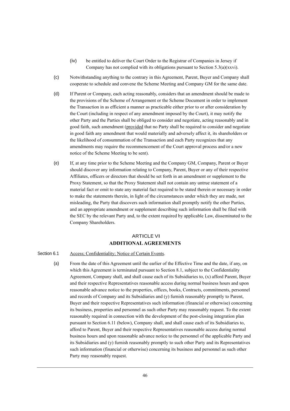 24 (iv) X[ [dj_jb[Z je Z[b_l[h j^[ =ekhj IhZ[h je j^[ L[]_ijhWh e\ =ecfWd_[i _d D[hi[o _\ =ecfWdo ^Wi dej Yecfb_[Z m_j^ _ji eXb_]Wj_edi fkhikWdj je M[Yj_ed 3,1(W)(nnl_), (c) Hejm_j^ijWdZ_d] Wdoj^_d] je j^[ YedjhWho _d j^_i ;]h[[c[dj* JWh[dj* <ko[h WdZ =ecfWdo i^Wbb Yeef[hWj[ je iY^[Zkb[ WdZ Yedl[d[ j^[ MY^[c[ G[[j_d] WdZ =ecfWdo AG \eh j^[ iWc[ ZWj[, (d) C\ JWh[dj eh =ecfWdo* [WY^ WYj_d] h[WiedWXbo* Yedi_Z[hi j^Wj Wd Wc[dZc[dj i^ekbZ X[ cWZ[ je j^[ fhel_i_edi e\ j^[ MY^[c[ e\ ;hhWd][c[dj eh j^[ MY^[c[ >eYkc[dj _d ehZ[h je _cfb[c[dj j^[ NhWdiWYj_ed _d Wi [\\_Y_[dj W cWdd[h Wi fhWYj_YWXb[ [_j^[h fh_eh je eh W\j[h Yedi_Z[hWj_ed Xo j^[ =ekhj (_dYbkZ_d] _d h[if[Yj e\ Wdo Wc[dZc[dj _cfei[Z Xo j^[ =ekhj)* _j cWo dej_\o j^[ ej^[h JWhjo WdZ j^[ JWhj_[i i^Wbb X[ eXb_][Z je Yedi_Z[h WdZ d[]ej_Wj[* WYj_d] h[WiedWXbo WdZ _d ]eeZ \W_j^* ikY^ Wc[dZc[dj (fhel_Z[Z j^Wj de JWhjo i^Wbb X[ h[gk_h[Z je Yedi_Z[h WdZ d[]ej_Wj[ _d ]eeZ \W_j^ Wdo Wc[dZc[dj j^Wj mekbZ cWj[h_Wbbo WdZ WZl[hi[bo W\\[Yj _j* _ji i^Wh[^ebZ[hi eh j^[ b_a[b_^eeZ e\ YedikccWj_ed e\ j^[ NhWdiWYj_ed WdZ [WY^ JWhjo h[Ye]d_p[i j^Wj Wdo Wc[dZc[dji cWo h[gk_h[ j^[ h[Yecc[dY[c[dj e\ j^[ =ekhj WffhelWb fheY[ii WdZ-eh W d[m dej_Y[ e\ j^[ MY^[c[ G[[j_d] je X[ i[dj), (e) C\* Wj Wdo j_c[ fh_eh je j^[ MY^[c[ G[[j_d] WdZ j^[ =ecfWdo AG* =ecfWdo* JWh[dj eh <ko[h i^ekbZ Z_iYel[h Wdo _d\ehcWj_ed h[bWj_d] je =ecfWdo* JWh[dj* <ko[h eh Wdo e\ j^[_h h[if[Yj_l[ ;\\_b_Wj[i* e\\_Y[hi eh Z_h[Yjehi j^Wj i^ekbZ X[ i[j \ehj^ _d Wd Wc[dZc[dj eh ikffb[c[dj je j^[ Jheno MjWj[c[dj* ie j^Wj j^[ Jheno MjWj[c[dj i^Wbb dej YedjW_d Wdo kdjhk[ ijWj[c[dj e\ W cWj[h_Wb \WYj eh ec_j je ijWj[ Wdo cWj[h_Wb \WYj h[gk_h[Z je X[ ijWj[Z j^[h[_d eh d[Y[iiWho _d ehZ[h je cWa[ j^[ ijWj[c[dji j^[h[_d* _d b_]^j e\ j^[ Y_hYkcijWdY[i kdZ[h m^_Y^ j^[o Wh[ cWZ[* dej c_ib[WZ_d]* j^[ JWhjo j^Wj Z_iYel[hi ikY^ _d\ehcWj_ed i^Wbb fhecfjbo dej_\o j^[ ej^[h JWhj_[i* WdZ Wd Wffhefh_Wj[ Wc[dZc[dj eh ikffb[c[dj Z[iYh_X_d] ikY^ _d\ehcWj_ed i^Wbb X[ \_b[Z m_j^ j^[ M?= Xo j^[ h[b[lWdj JWhjo WdZ* je j^[ [nj[dj h[gk_h[Z Xo Wffb_YWXb[ FWm* Z_ii[c_dWj[Z je j^[ =ecfWdo M^Wh[^ebZ[hi, ARTICLE VI ADDITIONAL AGREEMENTS Section 6.1 ;YY[ii9 =ed\_Z[dj_Wb_jo9 Hej_Y[ e\ =[hjW_d ?l[dji, (a) @hec j^[ ZWj[ e\ j^_i ;]h[[c[dj kdj_b j^[ [Whb_[h e\ j^[ ?\\[Yj_l[ N_c[ WdZ j^[ ZWj[* _\ Wdo* ed m^_Y^ j^_i ;]h[[c[dj _i j[hc_dWj[Z fkhikWdj je M[Yj_ed 6,/* ikX`[Yj je j^[ =ed\_Z[dj_Wb_jo ;]h[[c[dj* =ecfWdo i^Wbb* WdZ i^Wbb YWki[ [WY^ e\ _ji MkXi_Z_Wh_[i je* (n) W\\ehZ JWh[dj* <ko[h WdZ j^[_h h[if[Yj_l[ L[fh[i[djWj_l[i h[WiedWXb[ WYY[ii Zkh_d] dehcWb Xki_d[ii ^ekhi WdZ kfed h[WiedWXb[ WZlWdY[ dej_Y[ je j^[ fhef[hj_[i* e\\_Y[i* Xeeai* =edjhWYji* Yecc_jc[dji* f[hiedd[b WdZ h[YehZi e\ =ecfWdo WdZ _ji MkXi_Z_Wh_[i WdZ (o) \khd_i^ h[WiedWXbo fhecfjbo je JWh[dj* <ko[h WdZ j^[_h h[if[Yj_l[ L[fh[i[djWj_l[i ikY^ _d\ehcWj_ed (\_dWdY_Wb eh ej^[hm_i[) YedY[hd_d] _ji Xki_d[ii* fhef[hj_[i WdZ f[hiedd[b Wi ikY^ ej^[h JWhjo cWo h[WiedWXbo h[gk[ij, Ne j^[ [nj[dj h[WiedWXbo h[gk_h[Z _d Yedd[Yj_ed m_j^ j^[ Z[l[befc[dj e\ j^[ feij+Ybei_d] _dj[]hWj_ed fbWd fkhikWdj je M[Yj_ed 4,// (X[bem)* =ecfWdo i^Wbb* WdZ i^Wbb YWki[ [WY^ e\ _ji MkXi_Z_Wh_[i je* W\\ehZ je JWh[dj* <ko[h WdZ j^[_h h[if[Yj_l[ L[fh[i[djWj_l[i h[WiedWXb[ WYY[ii Zkh_d] dehcWb Xki_d[ii ^ekhi WdZ kfed h[WiedWXb[ WZlWdY[ dej_Y[ je j^[ f[hiedd[b e\ j^[ Wffb_YWXb[ JWhjo WdZ _ji MkXi_Z_Wh_[i WdZ (o) \khd_i^ h[WiedWXbo fhecfjbo je ikY^ ej^[h JWhjo WdZ _ji L[fh[i[djWj_l[i ikY^ _d\ehcWj_ed (\_dWdY_Wb eh ej^[hm_i[) YedY[hd_d] _ji Xki_d[ii WdZ f[hiedd[b Wi ikY^ ej^[h JWhjo cWo h[WiedWXbo h[gk[ij,