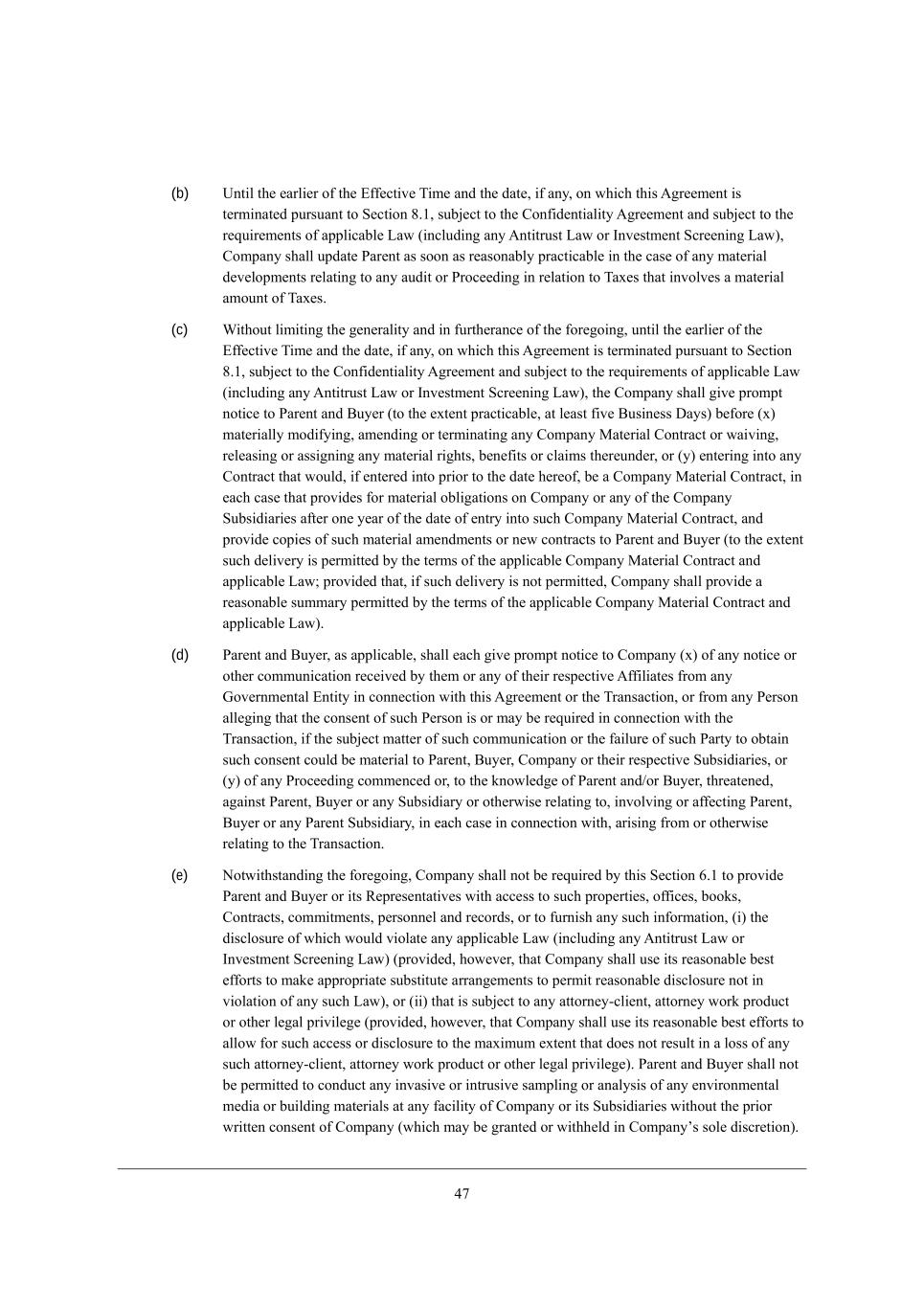 33 Wdo e\ j^[_h h[if[Yj_l[ MkXi_Z_Wh_[i _\ ikY^ Yecckd_YWj_edi h[bWj[ je j^[ NhWdiWYj_ed WdZ m_bb fhel_Z[ j^[ ej^[h JWhjo m_j^ W h[WiedWXb[ effehjkd_jo je h[l_[m WdZ Yecc[dj ed ikY^ Yecckd_YWj_edi fh_eh je Z_ijh_Xkj_ed, (j) Hej^_d] _d j^_i ;]h[[c[dj i^Wbb Yed\[h kfed Wdo =edj_dk_d] ?cfbeo[[ Wdo h_]^j je Yedj_dk[ _d j^[ [cfbeo eh i[hl_Y[ e\ j^[ JWhj_[i eh Wdo e\ j^[_h h[if[Yj_l[ ;\\_b_Wj[i* eh i^Wbb _dj[h\[h[ m_j^ eh h[ijh_Yj _d Wdo mWo j^[ h_]^ji e\ j^[ JWhj_[i eh Wdo e\ j^[_h h[if[Yj_l[ ;\\_b_Wj[i* m^_Y^ h_]^ji Wh[ ^[h[Xo [nfh[iibo h[i[hl[Z* je Z_iY^Wh][ eh j[hc_dWj[ j^[ i[hl_Y[i e\ Wdo =edj_dk_d] ?cfbeo[[ eh Wdo ej^[h J[hied Wj Wdo j_c[ \eh Wdo h[Wied m^Wjie[l[h* m_j^ eh m_j^ekj YWki[* [nY[fj je j^[ [nj[dj [nfh[iibo fhel_Z[Z ej^[hm_i[ _d W mh_jj[d W]h[[c[dj X[jm[[d Wdo e\ j^[ JWhj_[i eh j^[_h h[if[Yj_l[ ;\\_b_Wj[i WdZ j^[ =edj_dk_d] ?cfbeo[[9 Wdo i[l[hWdY[* X[d[\_j eh ej^[h Wffb_YWXb[ fbWd eh fhe]hWc Yel[h_d] ikY^ =edj_dk_d] ?cfbeo[[9 eh Wffb_YWXb[ FWm, (k) Hej^_d] _d j^_i ;]h[[c[dj i^Wbb (_) X[ jh[Wj[Z Wi Wd Wc[dZc[dj* ceZ_\_YWj_ed eh Yh[Wj_ed e\ Wdo [cfbeo[[ X[d[\_j fbWd* fhe]hWc* feb_Yo* fhWYj_Y[* W]h[[c[dj eh WhhWd][c[dj* _dYbkZ_d] e\ Wdo =ecfWdo <[d[\_j JbWd* (__) Yh[Wj[ Wdo h_]^j eh X[d[\_j _d Wdo J[hied* ej^[h j^Wd j^[ JWhj_[i je j^_i ;]h[[c[dj* (___) ]kWhWdj[[ [cfbeoc[dj e\ Wdo [cfbeo[[ \eh Wdo f[h_eZ e\ j_c[ W\j[h j^[ ?\\[Yj_l[ N_c[ eh fh[YbkZ[ j^[ WX_b_jo e\ <ko[h eh Wdo JWh[dj Ahekf =ecfWdo (_dYbkZ_d]* \eh j^[ Wle_ZWdY[ e\ ZekXj* =ecfWdo WdZ [WY^ e\ _ji MkXi_Z_Wh_[i) je j[hc_dWj[ j^[ [cfbeoc[dj e\ Wdo [cfbeo[[ eh (_l) Yh[Wj[ W X_dZ_d] [cfbeoc[dj W]h[[c[dj m_j^ Wdo [cfbeo[[, Section 6.7 NWa[el[h MjWjkj[i, C\ Wdo NWa[el[h MjWjkj[ Wffb_YWXb[ je j^_i ;]h[[c[dj eh j^[ NhWdiWYj_ed* =ecfWdo* JWh[dj* <ko[h WdZ j^[_h h[if[Yj_l[ XeWhZi e\ Z_h[Yjehi* _d h[WiedWXb[ YedikbjWj_ed m_j^ j^[ ej^[h JWhj_[i WdZ m_j^ ikY^ h[WiedWXb[ Wii_ijWdY[ Wi cWo X[ h[gk_h[Z \hec j^[ ej^[h JWhj_[i WdZ j^[ ej^[h JWhj_[iu <eWhZi e\ >_h[Yjehi* i^Wbb jWa[ ikY^ WYj_edi Wi Wh[ h[WiedWXbo d[Y[iiWho ie j^Wj j^[ NhWdiWYj_ed cWo X[ YedikccWj[Z Wi fhecfjbo Wi h[WiedWXbo fhWYj_YWXb[ ed j^[ j[hci e\ j^_i ;]h[[c[dj (Xkj d[_j^[h =ecfWdo* JWh[dj* <ko[h deh j^[_h h[if[Yj_l[ XeWhZi e\ Z_h[Yjehi m_bb X[ h[gk_h[Z je jWa[ Wdo WYj_ed j^Wj mekbZ* eh mekbZ X[ h[WiedWXbo b_a[bo je* YedjhWl[d[ Wdo Wffb_YWXb[ FWm), Section 6.8 Lkb[ /4X+1, Jh_eh je j^[ ?\\[Yj_l[ N_c[* =ecfWdo i^Wbb* jWa[ Wbb ikY^ ij[fi Wi cWo X[ h[WiedWXbo d[Y[iiWho eh WZl_iWXb[ ^[h[je je YWki[ Wdo Z_ifei_j_edi e\ [gk_jo i[Ykh_j_[i (_dYbkZ_d] Z[h_lWj_l[ i[Ykh_j_[i) e\ =ecfWdo _d Yedd[Yj_ed m_j^ j^_i ;]h[[c[dj WdZ j^[ NhWdiWYj_ed Xo [WY^ _dZ_l_ZkWb m^e _i W Z_h[Yjeh eh e\\_Y[h e\ =ecfWdo ikX`[Yj je j^[ h[fehj_d] h[gk_h[c[dji e\ M[Yj_ed /4(W) e\ j^[ ?nY^Wd][ ;Yj m_j^ h[if[Yj je =ecfWdo je X[ [n[cfj kdZ[h Lkb[ /4X+1 fheckb]Wj[Z kdZ[h j^[ ?nY^Wd][ ;Yj, Section 6.9 NhWdiWYj_ed F_j_]Wj_ed9 Hej_Y[i, =ecfWdo i^Wbb fhecfjbo dej_\o JWh[dj WdZ <ko[h e\ Wdo i^Wh[^ebZ[h Z[cWdZi* b_j_]Wj_edi* WhX_jhWj_edi eh ej^[h i_c_bWh JheY[[Z_d]i (_dYbkZ_d] Z[h_lWj_l[ YbW_ci) Yecc[dY[Z W]W_dij _j* Wdo e\ _ji MkXi_Z_Wh_[i eh _ji eh j^[_h h[if[Yj_l[ Z_h[Yjehi eh e\\_Y[hi* _d [WY^ YWi[ Xo Wdo i^Wh[^ebZ[h e\ =ecfWdo* Wi Wffb_YWXb[* h[bWj_d] je j^_i ;]h[[c[dj eh Wdo e\ j^[ NhWdiWYj_ed (Yebb[Yj_l[bo* j^[ rTransaction Litigations) WdZ i^Wbb a[[f JWh[dj WdZ <ko[h h[WiedWXbo _d\ehc[Z h[]WhZ_d] Wdo NhWdiWYj_ed F_j_]Wj_ed, JWh[dj WdZ <ko[h i^Wbb* Wj JWh[djui eh <ko[hui [nf[di[* ^Wl[ j^[ h_]^j je fWhj_Y_fWj[ _d* Xkj dej Yedjheb* j^[ Z[\[di[ e\ Wdo NhWdiWYj_ed F_j_]Wj_ed Xhek]^j W]W_dij =ecfWdo* Wdo e\ _ji MkXi_Z_Wh_[i eh _ji eh j^[_h Z_h[Yjehi eh e\\_Y[hi WdZ =ecfWdo i^Wbb jWa[ _dje Yedi_Z[hWj_ed Wbb e\ JWh[djui WdZ <ko[hui h[WiedWXb[ Yecc[dji eh h[gk[iji m_j^ h[if[Yj je ikY^ NhWdiWYj_ed F_j_]Wj_ed, Jh_eh je j^[ ?\\[Yj_l[ N_c[* d[_j^[h =ecfWdo deh Wdo =ecfWdo MkXi_Z_Who i^Wbb i[jjb[* e\\[h je i[jjb[ eh ej^[hm_i[ f[hc_j eh fWhj_Y_fWj[ _d* Z_h[Yjbo eh _dZ_h[Yjbo* j^[ i[jjb[c[dj eh e\\[h eh i[jjb[c[dj e\ Wdo ikY^ NhWdiWYj_ed F_j_]Wj_ed m_j^ekj j^[ fh_eh mh_jj[d Yedi[dj e\ JWh[dj* ikY^ Yedi[dj