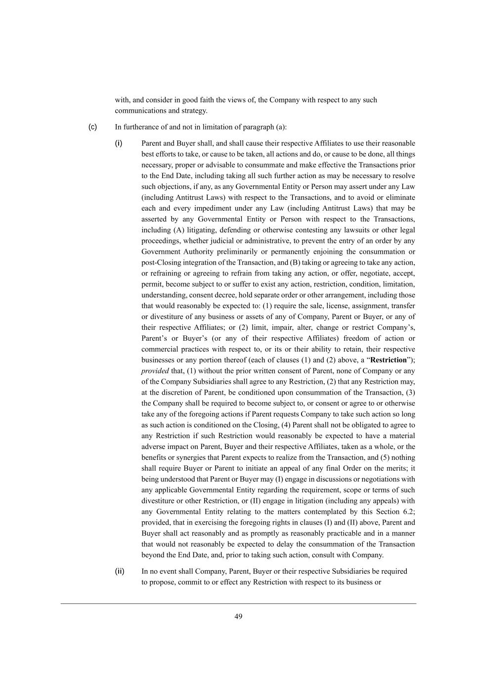 27 m_j^* WdZ Yedi_Z[h _d ]eeZ \W_j^ j^[ l_[mi e\* j^[ =ecfWdo m_j^ h[if[Yj je Wdo ikY^ Yecckd_YWj_edi WdZ ijhWj[]o, (c) Cd \khj^[hWdY[ e\ WdZ dej _d b_c_jWj_ed e\ fWhW]hWf^ (W)8 (i) JWh[dj WdZ <ko[h i^Wbb* WdZ i^Wbb YWki[ j^[_h h[if[Yj_l[ ;\\_b_Wj[i je ki[ j^[_h h[WiedWXb[ X[ij [\\ehji je jWa[* eh YWki[ je X[ jWa[d* Wbb WYj_edi WdZ Ze* eh YWki[ je X[ Zed[* Wbb j^_d]i d[Y[iiWho* fhef[h eh WZl_iWXb[ je YedikccWj[ WdZ cWa[ [\\[Yj_l[ j^[ NhWdiWYj_edi fh_eh je j^[ ?dZ >Wj[* _dYbkZ_d] jWa_d] Wbb ikY^ \khj^[h WYj_ed Wi cWo X[ d[Y[iiWho je h[iebl[ ikY^ eX`[Yj_edi* _\ Wdo* Wi Wdo Ael[hdc[djWb ?dj_jo eh J[hied cWo Wii[hj kdZ[h Wdo FWm (_dYbkZ_d] ;dj_jhkij FWmi) m_j^ h[if[Yj je j^[ NhWdiWYj_edi* WdZ je Wle_Z eh [b_c_dWj[ [WY^ WdZ [l[ho _cf[Z_c[dj kdZ[h Wdo FWm (_dYbkZ_d] ;dj_jhkij FWmi) j^Wj cWo X[ Wii[hj[Z Xo Wdo Ael[hdc[djWb ?dj_jo eh J[hied m_j^ h[if[Yj je j^[ NhWdiWYj_edi* _dYbkZ_d] (;) b_j_]Wj_d]* Z[\[dZ_d] eh ej^[hm_i[ Yedj[ij_d] Wdo bWmik_ji eh ej^[h b[]Wb fheY[[Z_d]i* m^[j^[h `kZ_Y_Wb eh WZc_d_ijhWj_l[* je fh[l[dj j^[ [djho e\ Wd ehZ[h Xo Wdo Ael[hdc[dj ;kj^eh_jo fh[b_c_dWh_bo eh f[hcWd[djbo [d`e_d_d] j^[ YedikccWj_ed eh feij+=bei_d] _dj[]hWj_ed e\ j^[ NhWdiWYj_ed* WdZ (<) jWa_d] eh W]h[[_d] je jWa[ Wdo WYj_ed* eh h[\hW_d_d] eh W]h[[_d] je h[\hW_d \hec jWa_d] Wdo WYj_ed* eh e\\[h* d[]ej_Wj[* WYY[fj* f[hc_j* X[Yec[ ikX`[Yj je eh ik\\[h je [n_ij Wdo WYj_ed* h[ijh_Yj_ed* YedZ_j_ed* b_c_jWj_ed* kdZ[hijWdZ_d]* Yedi[dj Z[Yh[[* ^ebZ i[fWhWj[ ehZ[h eh ej^[h WhhWd][c[dj* _dYbkZ_d] j^ei[ j^Wj mekbZ h[WiedWXbo X[ [nf[Yj[Z je8 (/) h[gk_h[ j^[ iWb[* b_Y[di[* Wii_]dc[dj* jhWdi\[h eh Z_l[ij_jkh[ e\ Wdo Xki_d[ii eh Wii[ji e\ Wdo e\ =ecfWdo* JWh[dj eh <ko[h* eh Wdo e\ j^[_h h[if[Yj_l[ ;\\_b_Wj[i9 eh (0) b_c_j* _cfW_h* Wbj[h* Y^Wd][ eh h[ijh_Yj =ecfWdoui* JWh[djui eh <ko[hui (eh Wdo e\ j^[_h h[if[Yj_l[ ;\\_b_Wj[i) \h[[Zec e\ WYj_ed eh Yecc[hY_Wb fhWYj_Y[i m_j^ h[if[Yj je* eh _ji eh j^[_h WX_b_jo je h[jW_d* j^[_h h[if[Yj_l[ Xki_d[ii[i eh Wdo fehj_ed j^[h[e\ ([WY^ e\ YbWki[i (/) WdZ (0) WXel[* W rRestrictions)9 provided j^Wj* (/) m_j^ekj j^[ fh_eh mh_jj[d Yedi[dj e\ JWh[dj* ded[ e\ =ecfWdo eh Wdo e\ j^[ =ecfWdo MkXi_Z_Wh_[i i^Wbb W]h[[ je Wdo L[ijh_Yj_ed* (0) j^Wj Wdo L[ijh_Yj_ed cWo* Wj j^[ Z_iYh[j_ed e\ JWh[dj* X[ YedZ_j_ed[Z kfed YedikccWj_ed e\ j^[ NhWdiWYj_ed* (1) j^[ =ecfWdo i^Wbb X[ h[gk_h[Z je X[Yec[ ikX`[Yj je* eh Yedi[dj eh W]h[[ je eh ej^[hm_i[ jWa[ Wdo e\ j^[ \eh[]e_d] WYj_edi _\ JWh[dj h[gk[iji =ecfWdo je jWa[ ikY^ WYj_ed ie bed] Wi ikY^ WYj_ed _i YedZ_j_ed[Z ed j^[ =bei_d]* (2) JWh[dj i^Wbb dej X[ eXb_]Wj[Z je W]h[[ je Wdo L[ijh_Yj_ed _\ ikY^ L[ijh_Yj_ed mekbZ h[WiedWXbo X[ [nf[Yj[Z je ^Wl[ W cWj[h_Wb WZl[hi[ _cfWYj ed JWh[dj* <ko[h WdZ j^[_h h[if[Yj_l[ ;\\_b_Wj[i* jWa[d Wi W m^eb[* eh j^[ X[d[\_ji eh iod[h]_[i j^Wj JWh[dj [nf[Yji je h[Wb_p[ \hec j^[ NhWdiWYj_ed* WdZ (3) dej^_d] i^Wbb h[gk_h[ <ko[h eh JWh[dj je _d_j_Wj[ Wd Wff[Wb e\ Wdo \_dWb IhZ[h ed j^[ c[h_ji9 _j X[_d] kdZ[hijeeZ j^Wj JWh[dj eh <ko[h cWo (C) [d]W][ _d Z_iYkii_edi eh d[]ej_Wj_edi m_j^ Wdo Wffb_YWXb[ Ael[hdc[djWb ?dj_jo h[]WhZ_d] j^[ h[gk_h[c[dj* iYef[ eh j[hci e\ ikY^ Z_l[ij_jkh[ eh ej^[h L[ijh_Yj_ed* eh (CC) [d]W][ _d b_j_]Wj_ed (_dYbkZ_d] Wdo Wff[Wbi) m_j^ Wdo Ael[hdc[djWb ?dj_jo h[bWj_d] je j^[ cWjj[hi Yedj[cfbWj[Z Xo j^_i M[Yj_ed 4,09 fhel_Z[Z* j^Wj _d [n[hY_i_d] j^[ \eh[]e_d] h_]^ji _d YbWki[i (C) WdZ (CC) WXel[* JWh[dj WdZ <ko[h i^Wbb WYj h[WiedWXbo WdZ Wi fhecfjbo Wi h[WiedWXbo fhWYj_YWXb[ WdZ _d W cWdd[h j^Wj mekbZ dej h[WiedWXbo X[ [nf[Yj[Z je Z[bWo j^[ YedikccWj_ed e\ j^[ NhWdiWYj_ed X[oedZ j^[ ?dZ >Wj[* WdZ* fh_eh je jWa_d] ikY^ WYj_ed* Yedikbj m_j^ =ecfWdo, (ii) Cd de [l[dj i^Wbb =ecfWdo* JWh[dj* <ko[h eh j^[_h h[if[Yj_l[ MkXi_Z_Wh_[i X[ h[gk_h[Z je fhefei[* Yecc_j je eh [\\[Yj Wdo L[ijh_Yj_ed m_j^ h[if[Yj je _ji Xki_d[ii eh