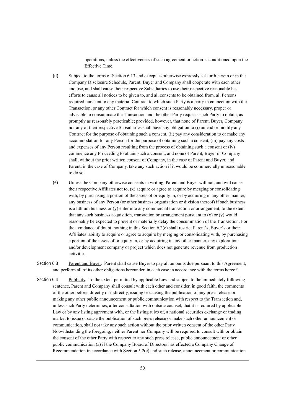 3. ef[hWj_edi* kdb[ii j^[ [\\[Yj_l[d[ii e\ ikY^ W]h[[c[dj eh WYj_ed _i YedZ_j_ed[Z kfed j^[ ?\\[Yj_l[ N_c[, (d) MkX`[Yj je j^[ j[hci e\ M[Yj_ed 4,/1 WdZ [nY[fj Wi ej^[hm_i[ [nfh[iibo i[j \ehj^ ^[h[_d eh _d j^[ =ecfWdo >_iYbeikh[ MY^[Zkb[* JWh[dj* <ko[h WdZ =ecfWdo i^Wbb Yeef[hWj[ m_j^ [WY^ ej^[h WdZ ki[* WdZ i^Wbb YWki[ j^[_h h[if[Yj_l[ MkXi_Z_Wh_[i je ki[ j^[_h h[if[Yj_l[ h[WiedWXb[ X[ij [\\ehji je YWki[ Wbb dej_Y[i je X[ ]_l[d je* WdZ Wbb Yedi[dji je X[ eXjW_d[Z \hec* Wbb J[hiedi h[gk_h[Z fkhikWdj je Wdo cWj[h_Wb =edjhWYj je m^_Y^ ikY^ JWhjo _i W fWhjo _d Yedd[Yj_ed m_j^ j^[ NhWdiWYj_ed* eh Wdo ej^[h =edjhWYj \eh m^_Y^ Yedi[dj _i h[WiedWXbo d[Y[iiWho* fhef[h eh WZl_iWXb[ je YedikccWj[ j^[ NhWdiWYj_ed WdZ j^[ ej^[h JWhjo h[gk[iji ikY^ JWhjo je eXjW_d* Wi fhecfjbo Wi h[WiedWXbo fhWYj_YWXb[9 fhel_Z[Z* ^em[l[h* j^Wj ded[ e\ JWh[dj* <ko[h* =ecfWdo deh Wdo e\ j^[_h h[if[Yj_l[ MkXi_Z_Wh_[i i^Wbb ^Wl[ Wdo eXb_]Wj_ed je (_) Wc[dZ eh ceZ_\o Wdo =edjhWYj \eh j^[ fkhfei[ e\ eXjW_d_d] ikY^ W Yedi[dj* (__) fWo Wdo Yedi_Z[hWj_ed je eh cWa[ Wdo WYYecceZWj_ed \eh Wdo J[hied \eh j^[ fkhfei[ e\ eXjW_d_d] ikY^ W Yedi[dj* (___) fWo Wdo Yeiji WdZ [nf[di[i e\ Wdo J[hied h[ikbj_d] \hec j^[ fheY[ii e\ eXjW_d_d] ikY^ W Yedi[dj eh (_l) Yecc[dY[ Wdo JheY[[Z_d] je eXjW_d ikY^ W Yedi[dj* WdZ ded[ e\ JWh[dj* <ko[h eh =ecfWdo i^Wbb* m_j^ekj j^[ fh_eh mh_jj[d Yedi[dj e\ =ecfWdo* _d j^[ YWi[ e\ JWh[dj WdZ <ko[h* WdZ JWh[dj* _d j^[ YWi[ e\ =ecfWdo* jWa[ Wdo ikY^ WYj_ed _\ _j mekbZ X[ Yecc[hY_Wbbo kdh[WiedWXb[ je Ze ie, (e) Odb[ii j^[ =ecfWdo ej^[hm_i[ Yedi[dji _d mh_j_d]* JWh[dj WdZ <ko[h m_bb dej* WdZ m_bb YWki[ j^[_h h[if[Yj_l[ ;\\_b_Wj[i dej je* (n) WYgk_h[ eh W]h[[ je WYgk_h[ Xo c[h]_d] eh Yedieb_ZWj_d] m_j^* Xo fkhY^Wi_d] W fehj_ed e\ j^[ Wii[ji e\ eh [gk_jo _d* eh Xo WYgk_h_d] _d Wdo ej^[h cWdd[h* Wdo Xki_d[ii e\ Wdo J[hied (eh ej^[h Xki_d[ii eh]Wd_pWj_ed eh Z_l_i_ed j^[h[e\) _\ ikY^ Xki_d[ii _i W b_j^_kc Xki_d[ii eh (o) [dj[h _dje Wdo Yecc[hY_Wb jhWdiWYj_ed eh WhhWd][c[dj* je j^[ [nj[dj j^Wj Wdo ikY^ Xki_d[ii WYgk_i_j_ed* jhWdiWYj_ed eh WhhWd][c[dj fkhikWdj je (n) eh (o) mekbZ h[WiedWXbo X[ [nf[Yj[Z je fh[l[dj eh cWj[h_Wbbo Z[bWo j^[ YedikccWj_ed e\ j^[ NhWdiWYj_ed, @eh j^[ Wle_ZWdY[ e\ ZekXj* dej^_d] _d j^_i M[Yj_ed 4,0([) i^Wbb h[ijh_Yj JWh[djui* <ko[hui eh j^[_h ;\\_b_Wj[iu WX_b_jo je WYgk_h[ eh W]h[[ je WYgk_h[ Xo c[h]_d] eh Yedieb_ZWj_d] m_j^* Xo fkhY^Wi_d] W fehj_ed e\ j^[ Wii[ji e\ eh [gk_jo _d* eh Xo WYgk_h_d] _d Wdo ej^[h cWdd[h* Wdo [nfbehWj_ed WdZ-eh Z[l[befc[dj YecfWdo eh fhe`[Yj m^_Y^ Ze[i dej ][d[hWj[ h[l[dk[ \hec fheZkYj_ed WYj_l_j_[i, Section 6.3 JWh[dj WdZ <ko[h, JWh[dj i^Wbb YWki[ <ko[h je fWo Wbb Wcekdji Zk[ fkhikWdj je j^_i ;]h[[c[dj* WdZ f[h\ehc Wbb e\ _ji ej^[h eXb_]Wj_edi ^[h[kdZ[h* _d [WY^ YWi[ _d WYYehZWdY[ m_j^ j^[ j[hci ^[h[e\, Section 6.4 JkXb_Y_jo, Ne j^[ [nj[dj f[hc_jj[Z Xo Wffb_YWXb[ FWm WdZ ikX`[Yj je j^[ _cc[Z_Wj[bo \ebbem_d] i[dj[dY[* JWh[dj WdZ =ecfWdo i^Wbb Yedikbj m_j^ [WY^ ej^[h WdZ Yedi_Z[h* _d ]eeZ \W_j^* j^[ Yecc[dji e\ j^[ ej^[h X[\eh[* Z_h[Yjbo eh _dZ_h[Yjbo* _iik_d] eh YWki_d] j^[ fkXb_YWj_ed e\ Wdo fh[ii h[b[Wi[ eh cWa_d] Wdo ej^[h fkXb_Y WddekdY[c[dj eh fkXb_Y Yecckd_YWj_ed m_j^ h[if[Yj je j^[ NhWdiWYj_ed WdZ* kdb[ii ikY^ JWhjo Z[j[hc_d[i* W\j[h YedikbjWj_ed m_j^ ekji_Z[ Yekdi[b* j^Wj _j _i h[gk_h[Z Xo Wffb_YWXb[ FWm eh Xo Wdo b_ij_d] W]h[[c[dj m_j^* eh j^[ b_ij_d] hkb[i e\* W dWj_edWb i[Ykh_j_[i [nY^Wd][ eh jhWZ_d] cWha[j je _iik[ eh YWki[ j^[ fkXb_YWj_ed e\ ikY^ fh[ii h[b[Wi[ eh cWa[ ikY^ ej^[h WddekdY[c[dj eh Yecckd_YWj_ed* i^Wbb dej jWa[ Wdo ikY^ WYj_ed m_j^ekj j^[ fh_eh mh_jj[d Yedi[dj e\ j^[ ej^[h JWhjo, Hejm_j^ijWdZ_d] j^[ \eh[]e_d]* d[_j^[h JWh[dj deh =ecfWdo m_bb X[ h[gk_h[Z je Yedikbj m_j^ eh eXjW_d j^[ Yedi[dj e\ j^[ ej^[h JWhjo m_j^ h[if[Yj je Wdo ikY^ fh[ii h[b[Wi[* fkXb_Y WddekdY[c[dj eh ej^[h fkXb_Y Yecckd_YWj_ed (W) _\ j^[ =ecfWdo <eWhZ e\ >_h[Yjehi ^Wi [\\[Yj[Z W =ecfWdo =^Wd][ e\ L[Yecc[dZWj_ed _d WYYehZWdY[ m_j^ M[Yj_ed 3,0([) WdZ ikY^ h[b[Wi[* WddekdY[c[dj eh Yecckd_YWj_ed
