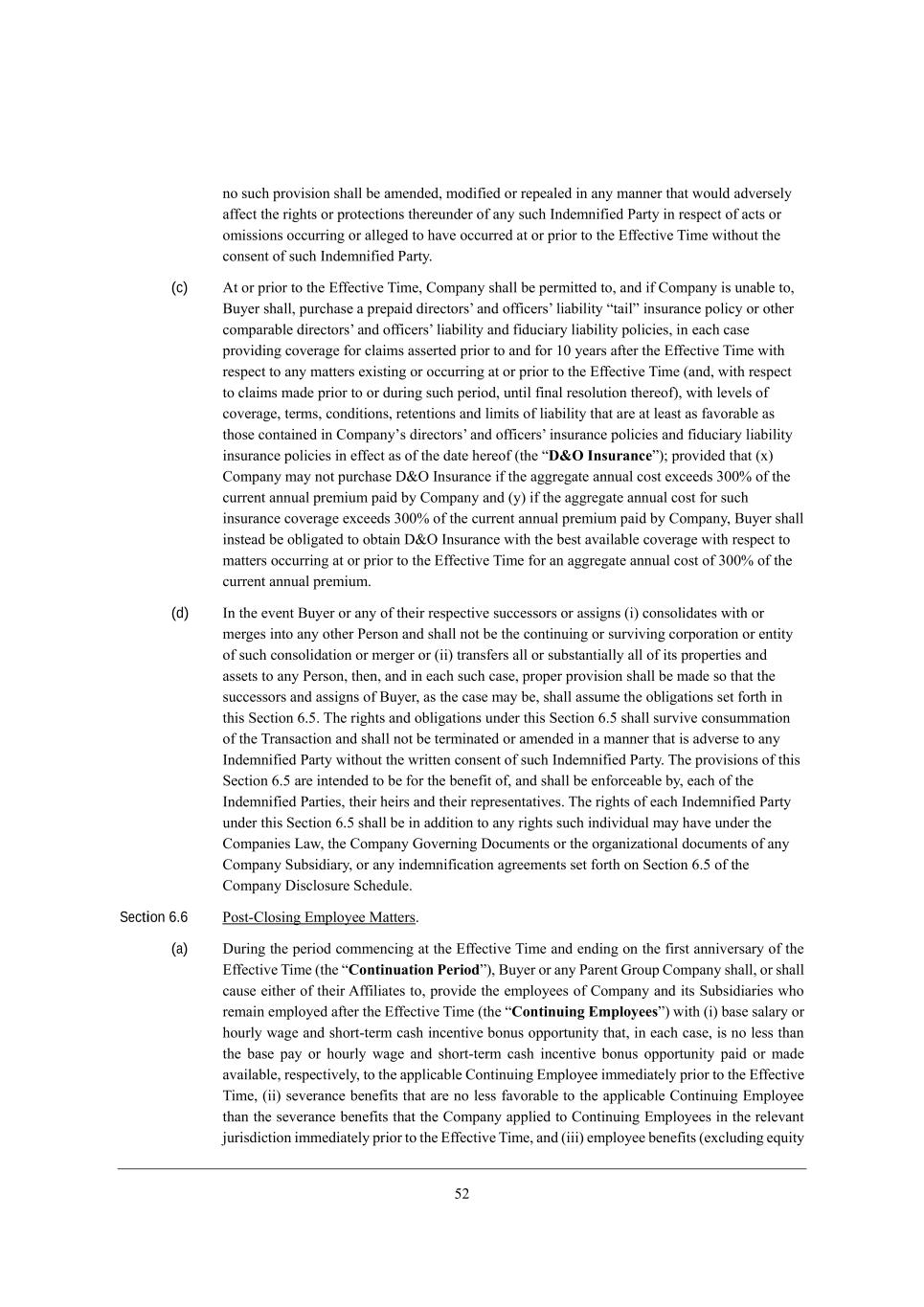30 de ikY^ fhel_i_ed i^Wbb X[ Wc[dZ[Z* ceZ_\_[Z eh h[f[Wb[Z _d Wdo cWdd[h j^Wj mekbZ WZl[hi[bo W\\[Yj j^[ h_]^ji eh fhej[Yj_edi j^[h[kdZ[h e\ Wdo ikY^ CdZ[cd_\_[Z JWhjo _d h[if[Yj e\ WYji eh ec_ii_edi eYYkhh_d] eh Wbb[][Z je ^Wl[ eYYkhh[Z Wj eh fh_eh je j^[ ?\\[Yj_l[ N_c[ m_j^ekj j^[ Yedi[dj e\ ikY^ CdZ[cd_\_[Z JWhjo, (c) ;j eh fh_eh je j^[ ?\\[Yj_l[ N_c[* =ecfWdo i^Wbb X[ f[hc_jj[Z je* WdZ _\ =ecfWdo _i kdWXb[ je* <ko[h i^Wbb* fkhY^Wi[ W fh[fW_Z Z_h[Yjehiu WdZ e\\_Y[hiu b_WX_b_jo rjW_bs _dikhWdY[ feb_Yo eh ej^[h YecfWhWXb[ Z_h[Yjehiu WdZ e\\_Y[hiu b_WX_b_jo WdZ \_ZkY_Who b_WX_b_jo feb_Y_[i* _d [WY^ YWi[ fhel_Z_d] Yel[hW][ \eh YbW_ci Wii[hj[Z fh_eh je WdZ \eh /. o[Whi W\j[h j^[ ?\\[Yj_l[ N_c[ m_j^ h[if[Yj je Wdo cWjj[hi [n_ij_d] eh eYYkhh_d] Wj eh fh_eh je j^[ ?\\[Yj_l[ N_c[ (WdZ* m_j^ h[if[Yj je YbW_ci cWZ[ fh_eh je eh Zkh_d] ikY^ f[h_eZ* kdj_b \_dWb h[iebkj_ed j^[h[e\)* m_j^ b[l[bi e\ Yel[hW][* j[hci* YedZ_j_edi* h[j[dj_edi WdZ b_c_ji e\ b_WX_b_jo j^Wj Wh[ Wj b[Wij Wi \WlehWXb[ Wi j^ei[ YedjW_d[Z _d =ecfWdoui Z_h[Yjehiu WdZ e\\_Y[hiu _dikhWdY[ feb_Y_[i WdZ \_ZkY_Who b_WX_b_jo _dikhWdY[ feb_Y_[i _d [\\[Yj Wi e\ j^[ ZWj[ ^[h[e\ (j^[ rD&O Insurances)9 fhel_Z[Z j^Wj (n) =ecfWdo cWo dej fkhY^Wi[ >&I CdikhWdY[ _\ j^[ W]]h[]Wj[ WddkWb Yeij [nY[[Zi 1..% e\ j^[ Ykhh[dj WddkWb fh[c_kc fW_Z Xo =ecfWdo WdZ (o) _\ j^[ W]]h[]Wj[ WddkWb Yeij \eh ikY^ _dikhWdY[ Yel[hW][ [nY[[Zi 1..% e\ j^[ Ykhh[dj WddkWb fh[c_kc fW_Z Xo =ecfWdo* <ko[h i^Wbb _dij[WZ X[ eXb_]Wj[Z je eXjW_d >&I CdikhWdY[ m_j^ j^[ X[ij WlW_bWXb[ Yel[hW][ m_j^ h[if[Yj je cWjj[hi eYYkhh_d] Wj eh fh_eh je j^[ ?\\[Yj_l[ N_c[ \eh Wd W]]h[]Wj[ WddkWb Yeij e\ 1..% e\ j^[ Ykhh[dj WddkWb fh[c_kc, (d) Cd j^[ [l[dj <ko[h eh Wdo e\ j^[_h h[if[Yj_l[ ikYY[iiehi eh Wii_]di (_) Yedieb_ZWj[i m_j^ eh c[h][i _dje Wdo ej^[h J[hied WdZ i^Wbb dej X[ j^[ Yedj_dk_d] eh ikhl_l_d] YehfehWj_ed eh [dj_jo e\ ikY^ Yedieb_ZWj_ed eh c[h][h eh (__) jhWdi\[hi Wbb eh ikXijWdj_Wbbo Wbb e\ _ji fhef[hj_[i WdZ Wii[ji je Wdo J[hied* j^[d* WdZ _d [WY^ ikY^ YWi[* fhef[h fhel_i_ed i^Wbb X[ cWZ[ ie j^Wj j^[ ikYY[iiehi WdZ Wii_]di e\ <ko[h* Wi j^[ YWi[ cWo X[* i^Wbb Wiikc[ j^[ eXb_]Wj_edi i[j \ehj^ _d j^_i M[Yj_ed 4,3, N^[ h_]^ji WdZ eXb_]Wj_edi kdZ[h j^_i M[Yj_ed 4,3 i^Wbb ikhl_l[ YedikccWj_ed e\ j^[ NhWdiWYj_ed WdZ i^Wbb dej X[ j[hc_dWj[Z eh Wc[dZ[Z _d W cWdd[h j^Wj _i WZl[hi[ je Wdo CdZ[cd_\_[Z JWhjo m_j^ekj j^[ mh_jj[d Yedi[dj e\ ikY^ CdZ[cd_\_[Z JWhjo, N^[ fhel_i_edi e\ j^_i M[Yj_ed 4,3 Wh[ _dj[dZ[Z je X[ \eh j^[ X[d[\_j e\* WdZ i^Wbb X[ [d\ehY[WXb[ Xo* [WY^ e\ j^[ CdZ[cd_\_[Z JWhj_[i* j^[_h ^[_hi WdZ j^[_h h[fh[i[djWj_l[i, N^[ h_]^ji e\ [WY^ CdZ[cd_\_[Z JWhjo kdZ[h j^_i M[Yj_ed 4,3 i^Wbb X[ _d WZZ_j_ed je Wdo h_]^ji ikY^ _dZ_l_ZkWb cWo ^Wl[ kdZ[h j^[ =ecfWd_[i FWm* j^[ =ecfWdo Ael[hd_d] >eYkc[dji eh j^[ eh]Wd_pWj_edWb ZeYkc[dji e\ Wdo =ecfWdo MkXi_Z_Who* eh Wdo _dZ[cd_\_YWj_ed W]h[[c[dji i[j \ehj^ ed M[Yj_ed 4,3 e\ j^[ =ecfWdo >_iYbeikh[ MY^[Zkb[, Section 6.6 Jeij+=bei_d] ?cfbeo[[ GWjj[hi, (a) >kh_d] j^[ f[h_eZ Yecc[dY_d] Wj j^[ ?\\[Yj_l[ N_c[ WdZ [dZ_d] ed j^[ \_hij Wdd_l[hiWho e\ j^[ ?\\[Yj_l[ N_c[ (j^[ rContinuation Periods)* <ko[h eh Wdo JWh[dj Ahekf =ecfWdo i^Wbb* eh i^Wbb YWki[ [_j^[h e\ j^[_h ;\\_b_Wj[i je* fhel_Z[ j^[ [cfbeo[[i e\ =ecfWdo WdZ _ji MkXi_Z_Wh_[i m^e h[cW_d [cfbeo[Z W\j[h j^[ ?\\[Yj_l[ N_c[ (j^[ rContinuing Employeess) m_j^ (_) XWi[ iWbWho eh ^ekhbo mW][ WdZ i^ehj+j[hc YWi^ _dY[dj_l[ Xedki effehjkd_jo j^Wj* _d [WY^ YWi[* _i de b[ii j^Wd j^[ XWi[ fWo eh ^ekhbo mW][ WdZ i^ehj+j[hc YWi^ _dY[dj_l[ Xedki effehjkd_jo fW_Z eh cWZ[ WlW_bWXb[* h[if[Yj_l[bo* je j^[ Wffb_YWXb[ =edj_dk_d] ?cfbeo[[ _cc[Z_Wj[bo fh_eh je j^[ ?\\[Yj_l[ N_c[* (__) i[l[hWdY[ X[d[\_ji j^Wj Wh[ de b[ii \WlehWXb[ je j^[ Wffb_YWXb[ =edj_dk_d] ?cfbeo[[ j^Wd j^[ i[l[hWdY[ X[d[\_ji j^Wj j^[ =ecfWdo Wffb_[Z je =edj_dk_d] ?cfbeo[[i _d j^[ h[b[lWdj `kh_iZ_Yj_ed _cc[Z_Wj[bo fh_eh je j^[ ?\\[Yj_l[ N_c[* WdZ (___) [cfbeo[[ X[d[\_ji ([nYbkZ_d] [gk_jo