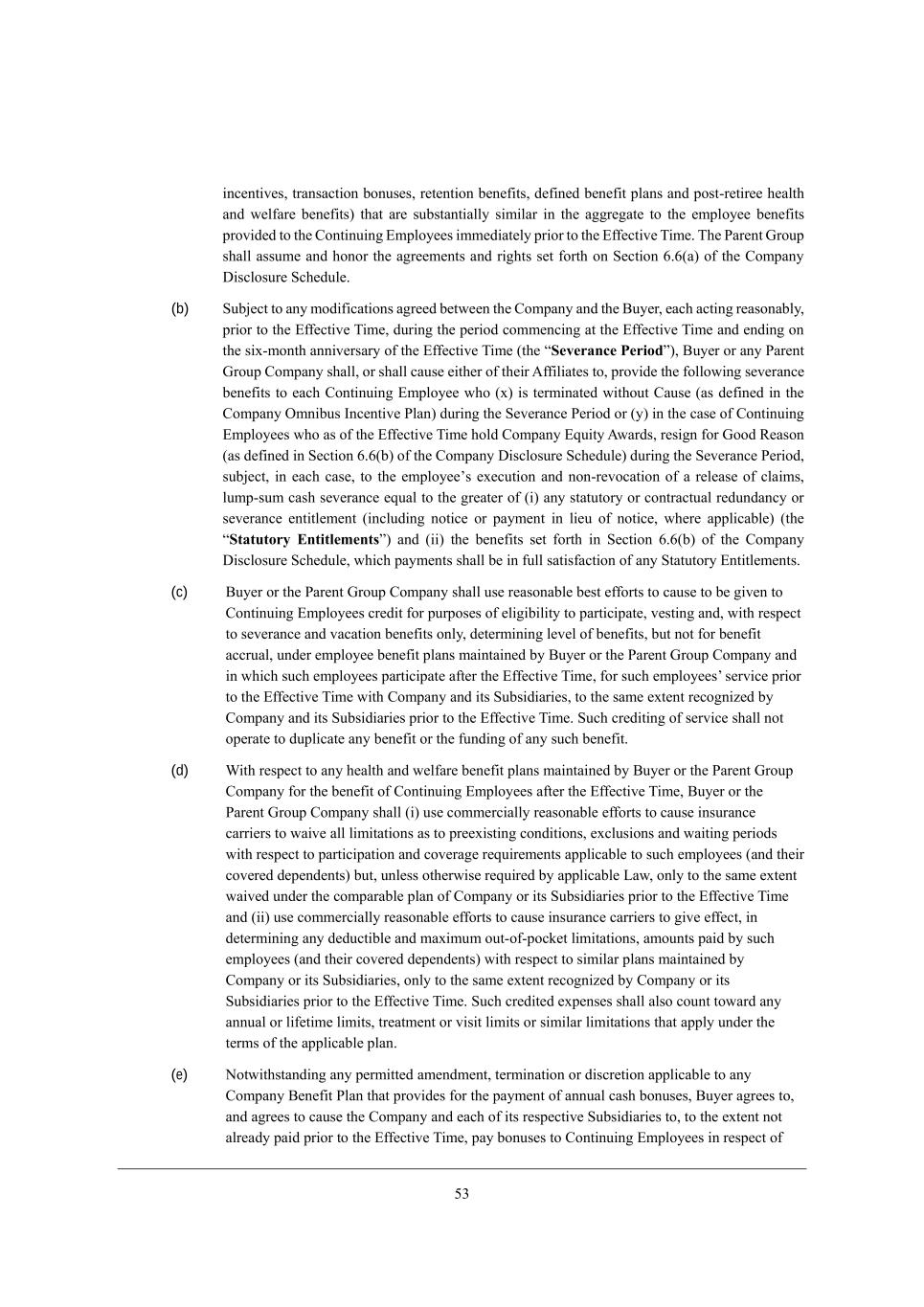 31 _dY[dj_l[i* jhWdiWYj_ed Xedki[i* h[j[dj_ed X[d[\_ji* Z[\_d[Z X[d[\_j fbWdi WdZ feij+h[j_h[[ ^[Wbj^ WdZ m[b\Wh[ X[d[\_ji) j^Wj Wh[ ikXijWdj_Wbbo i_c_bWh _d j^[ W]]h[]Wj[ je j^[ [cfbeo[[ X[d[\_ji fhel_Z[Z je j^[ =edj_dk_d] ?cfbeo[[i _cc[Z_Wj[bo fh_eh je j^[ ?\\[Yj_l[ N_c[, N^[ JWh[dj Ahekf i^Wbb Wiikc[ WdZ ^edeh j^[ W]h[[c[dji WdZ h_]^ji i[j \ehj^ ed M[Yj_ed 4,4(W) e\ j^[ =ecfWdo >_iYbeikh[ MY^[Zkb[, (b) MkX`[Yj je Wdo ceZ_\_YWj_edi W]h[[Z X[jm[[d j^[ =ecfWdo WdZ j^[ <ko[h* [WY^ WYj_d] h[WiedWXbo* fh_eh je j^[ ?\\[Yj_l[ N_c[* Zkh_d] j^[ f[h_eZ Yecc[dY_d] Wj j^[ ?\\[Yj_l[ N_c[ WdZ [dZ_d] ed j^[ i_n+cedj^ Wdd_l[hiWho e\ j^[ ?\\[Yj_l[ N_c[ (j^[ rSeverance Periods)* <ko[h eh Wdo JWh[dj Ahekf =ecfWdo i^Wbb* eh i^Wbb YWki[ [_j^[h e\ j^[_h ;\\_b_Wj[i je* fhel_Z[ j^[ \ebbem_d] i[l[hWdY[ X[d[\_ji je [WY^ =edj_dk_d] ?cfbeo[[ m^e (n) _i j[hc_dWj[Z m_j^ekj =Wki[ (Wi Z[\_d[Z _d j^[ =ecfWdo Icd_Xki CdY[dj_l[ JbWd) Zkh_d] j^[ M[l[hWdY[ J[h_eZ eh (o) _d j^[ YWi[ e\ =edj_dk_d] ?cfbeo[[i m^e Wi e\ j^[ ?\\[Yj_l[ N_c[ ^ebZ =ecfWdo ?gk_jo ;mWhZi* h[i_]d \eh AeeZ L[Wied (Wi Z[\_d[Z _d M[Yj_ed 4,4(X) e\ j^[ =ecfWdo >_iYbeikh[ MY^[Zkb[) Zkh_d] j^[ M[l[hWdY[ J[h_eZ* ikX`[Yj* _d [WY^ YWi[* je j^[ [cfbeo[[ui [n[Ykj_ed WdZ ded+h[leYWj_ed e\ W h[b[Wi[ e\ YbW_ci* bkcf+ikc YWi^ i[l[hWdY[ [gkWb je j^[ ]h[Wj[h e\ (_) Wdo ijWjkjeho eh YedjhWYjkWb h[ZkdZWdYo eh i[l[hWdY[ [dj_jb[c[dj (_dYbkZ_d] dej_Y[ eh fWoc[dj _d b_[k e\ dej_Y[* m^[h[ Wffb_YWXb[) (j^[ rStatutory Entitlementss) WdZ (__) j^[ X[d[\_ji i[j \ehj^ _d M[Yj_ed 4,4(X) e\ j^[ =ecfWdo >_iYbeikh[ MY^[Zkb[* m^_Y^ fWoc[dji i^Wbb X[ _d \kbb iWj_i\WYj_ed e\ Wdo MjWjkjeho ?dj_jb[c[dji, (c) <ko[h eh j^[ JWh[dj Ahekf =ecfWdo i^Wbb ki[ h[WiedWXb[ X[ij [\\ehji je YWki[ je X[ ]_l[d je =edj_dk_d] ?cfbeo[[i Yh[Z_j \eh fkhfei[i e\ [b_]_X_b_jo je fWhj_Y_fWj[* l[ij_d] WdZ* m_j^ h[if[Yj je i[l[hWdY[ WdZ lWYWj_ed X[d[\_ji edbo* Z[j[hc_d_d] b[l[b e\ X[d[\_ji* Xkj dej \eh X[d[\_j WYYhkWb* kdZ[h [cfbeo[[ X[d[\_j fbWdi cW_djW_d[Z Xo <ko[h eh j^[ JWh[dj Ahekf =ecfWdo WdZ _d m^_Y^ ikY^ [cfbeo[[i fWhj_Y_fWj[ W\j[h j^[ ?\\[Yj_l[ N_c[* \eh ikY^ [cfbeo[[iu i[hl_Y[ fh_eh je j^[ ?\\[Yj_l[ N_c[ m_j^ =ecfWdo WdZ _ji MkXi_Z_Wh_[i* je j^[ iWc[ [nj[dj h[Ye]d_p[Z Xo =ecfWdo WdZ _ji MkXi_Z_Wh_[i fh_eh je j^[ ?\\[Yj_l[ N_c[, MkY^ Yh[Z_j_d] e\ i[hl_Y[ i^Wbb dej ef[hWj[ je Zkfb_YWj[ Wdo X[d[\_j eh j^[ \kdZ_d] e\ Wdo ikY^ X[d[\_j, (d) Q_j^ h[if[Yj je Wdo ^[Wbj^ WdZ m[b\Wh[ X[d[\_j fbWdi cW_djW_d[Z Xo <ko[h eh j^[ JWh[dj Ahekf =ecfWdo \eh j^[ X[d[\_j e\ =edj_dk_d] ?cfbeo[[i W\j[h j^[ ?\\[Yj_l[ N_c[* <ko[h eh j^[ JWh[dj Ahekf =ecfWdo i^Wbb (_) ki[ Yecc[hY_Wbbo h[WiedWXb[ [\\ehji je YWki[ _dikhWdY[ YWhh_[hi je mW_l[ Wbb b_c_jWj_edi Wi je fh[[n_ij_d] YedZ_j_edi* [nYbki_edi WdZ mW_j_d] f[h_eZi m_j^ h[if[Yj je fWhj_Y_fWj_ed WdZ Yel[hW][ h[gk_h[c[dji Wffb_YWXb[ je ikY^ [cfbeo[[i (WdZ j^[_h Yel[h[Z Z[f[dZ[dji) Xkj* kdb[ii ej^[hm_i[ h[gk_h[Z Xo Wffb_YWXb[ FWm* edbo je j^[ iWc[ [nj[dj mW_l[Z kdZ[h j^[ YecfWhWXb[ fbWd e\ =ecfWdo eh _ji MkXi_Z_Wh_[i fh_eh je j^[ ?\\[Yj_l[ N_c[ WdZ (__) ki[ Yecc[hY_Wbbo h[WiedWXb[ [\\ehji je YWki[ _dikhWdY[ YWhh_[hi je ]_l[ [\\[Yj* _d Z[j[hc_d_d] Wdo Z[ZkYj_Xb[ WdZ cWn_ckc ekj+e\+feYa[j b_c_jWj_edi* Wcekdji fW_Z Xo ikY^ [cfbeo[[i (WdZ j^[_h Yel[h[Z Z[f[dZ[dji) m_j^ h[if[Yj je i_c_bWh fbWdi cW_djW_d[Z Xo =ecfWdo eh _ji MkXi_Z_Wh_[i* edbo je j^[ iWc[ [nj[dj h[Ye]d_p[Z Xo =ecfWdo eh _ji MkXi_Z_Wh_[i fh_eh je j^[ ?\\[Yj_l[ N_c[, MkY^ Yh[Z_j[Z [nf[di[i i^Wbb Wbie Yekdj jemWhZ Wdo WddkWb eh b_\[j_c[ b_c_ji* jh[Wjc[dj eh l_i_j b_c_ji eh i_c_bWh b_c_jWj_edi j^Wj Wffbo kdZ[h j^[ j[hci e\ j^[ Wffb_YWXb[ fbWd, (e) Hejm_j^ijWdZ_d] Wdo f[hc_jj[Z Wc[dZc[dj* j[hc_dWj_ed eh Z_iYh[j_ed Wffb_YWXb[ je Wdo =ecfWdo <[d[\_j JbWd j^Wj fhel_Z[i \eh j^[ fWoc[dj e\ WddkWb YWi^ Xedki[i* <ko[h W]h[[i je* WdZ W]h[[i je YWki[ j^[ =ecfWdo WdZ [WY^ e\ _ji h[if[Yj_l[ MkXi_Z_Wh_[i je* je j^[ [nj[dj dej Wbh[WZo fW_Z fh_eh je j^[ ?\\[Yj_l[ N_c[* fWo Xedki[i je =edj_dk_d] ?cfbeo[[i _d h[if[Yj e\