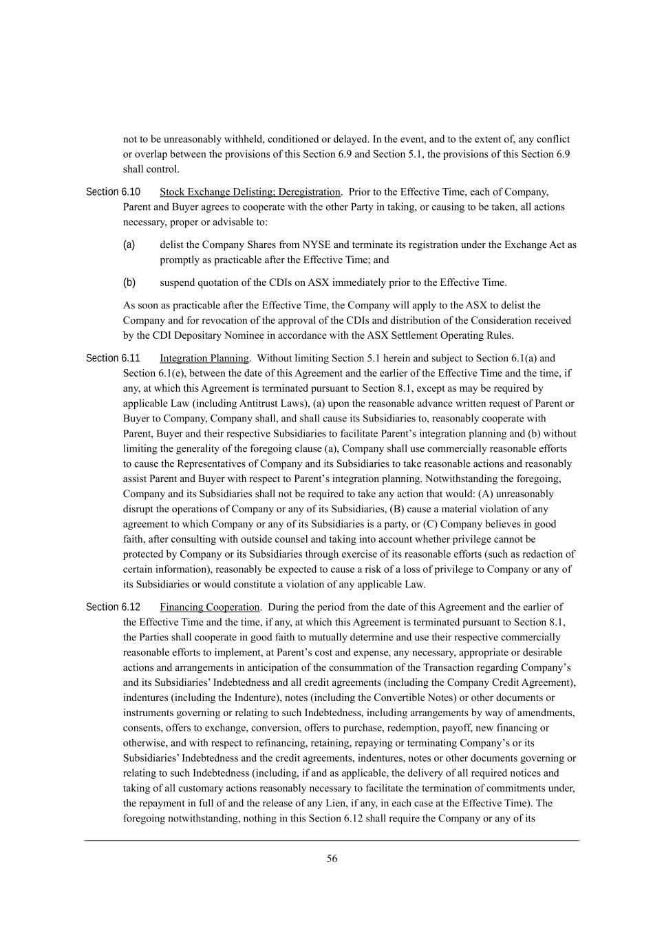 34 dej je X[ kdh[WiedWXbo m_j^^[bZ* YedZ_j_ed[Z eh Z[bWo[Z, Cd j^[ [l[dj* WdZ je j^[ [nj[dj e\* Wdo Yed\b_Yj eh el[hbWf X[jm[[d j^[ fhel_i_edi e\ j^_i M[Yj_ed 4,7 WdZ M[Yj_ed 3,/* j^[ fhel_i_edi e\ j^_i M[Yj_ed 4,7 i^Wbb Yedjheb, Section 6.10 MjeYa ?nY^Wd][ >[b_ij_d]9 >[h[]_ijhWj_ed, Jh_eh je j^[ ?\\[Yj_l[ N_c[* [WY^ e\ =ecfWdo* JWh[dj WdZ <ko[h W]h[[i je Yeef[hWj[ m_j^ j^[ ej^[h JWhjo _d jWa_d]* eh YWki_d] je X[ jWa[d* Wbb WYj_edi d[Y[iiWho* fhef[h eh WZl_iWXb[ je8 (a) Z[b_ij j^[ =ecfWdo M^Wh[i \hec HSM? WdZ j[hc_dWj[ _ji h[]_ijhWj_ed kdZ[h j^[ ?nY^Wd][ ;Yj Wi fhecfjbo Wi fhWYj_YWXb[ W\j[h j^[ ?\\[Yj_l[ N_c[9 WdZ (b) ikif[dZ gkejWj_ed e\ j^[ =>Ci ed ;MR _cc[Z_Wj[bo fh_eh je j^[ ?\\[Yj_l[ N_c[, ;i ieed Wi fhWYj_YWXb[ W\j[h j^[ ?\\[Yj_l[ N_c[* j^[ =ecfWdo m_bb Wffbo je j^[ ;MR je Z[b_ij j^[ =ecfWdo WdZ \eh h[leYWj_ed e\ j^[ WffhelWb e\ j^[ =>Ci WdZ Z_ijh_Xkj_ed e\ j^[ =edi_Z[hWj_ed h[Y[_l[Z Xo j^[ =>C >[fei_jWho Hec_d[[ _d WYYehZWdY[ m_j^ j^[ ;MR M[jjb[c[dj If[hWj_d] Lkb[i, Section 6.11 Cdj[]hWj_ed JbWdd_d], Q_j^ekj b_c_j_d] M[Yj_ed 3,/ ^[h[_d WdZ ikX`[Yj je M[Yj_ed 4,/(W) WdZ M[Yj_ed 4,/([)* X[jm[[d j^[ ZWj[ e\ j^_i ;]h[[c[dj WdZ j^[ [Whb_[h e\ j^[ ?\\[Yj_l[ N_c[ WdZ j^[ j_c[* _\ Wdo* Wj m^_Y^ j^_i ;]h[[c[dj _i j[hc_dWj[Z fkhikWdj je M[Yj_ed 6,/* [nY[fj Wi cWo X[ h[gk_h[Z Xo Wffb_YWXb[ FWm (_dYbkZ_d] ;dj_jhkij FWmi)* (W) kfed j^[ h[WiedWXb[ WZlWdY[ mh_jj[d h[gk[ij e\ JWh[dj eh <ko[h je =ecfWdo* =ecfWdo i^Wbb* WdZ i^Wbb YWki[ _ji MkXi_Z_Wh_[i je* h[WiedWXbo Yeef[hWj[ m_j^ JWh[dj* <ko[h WdZ j^[_h h[if[Yj_l[ MkXi_Z_Wh_[i je \WY_b_jWj[ JWh[djui _dj[]hWj_ed fbWdd_d] WdZ (X) m_j^ekj b_c_j_d] j^[ ][d[hWb_jo e\ j^[ \eh[]e_d] YbWki[ (W)* =ecfWdo i^Wbb ki[ Yecc[hY_Wbbo h[WiedWXb[ [\\ehji je YWki[ j^[ L[fh[i[djWj_l[i e\ =ecfWdo WdZ _ji MkXi_Z_Wh_[i je jWa[ h[WiedWXb[ WYj_edi WdZ h[WiedWXbo Wii_ij JWh[dj WdZ <ko[h m_j^ h[if[Yj je JWh[djui _dj[]hWj_ed fbWdd_d], Hejm_j^ijWdZ_d] j^[ \eh[]e_d]* =ecfWdo WdZ _ji MkXi_Z_Wh_[i i^Wbb dej X[ h[gk_h[Z je jWa[ Wdo WYj_ed j^Wj mekbZ8 (;) kdh[WiedWXbo Z_ihkfj j^[ ef[hWj_edi e\ =ecfWdo eh Wdo e\ _ji MkXi_Z_Wh_[i* (<) YWki[ W cWj[h_Wb l_ebWj_ed e\ Wdo W]h[[c[dj je m^_Y^ =ecfWdo eh Wdo e\ _ji MkXi_Z_Wh_[i _i W fWhjo* eh (=) =ecfWdo X[b_[l[i _d ]eeZ \W_j^* W\j[h Yedikbj_d] m_j^ ekji_Z[ Yekdi[b WdZ jWa_d] _dje WYYekdj m^[j^[h fh_l_b[][ YWddej X[ fhej[Yj[Z Xo =ecfWdo eh _ji MkXi_Z_Wh_[i j^hek]^ [n[hY_i[ e\ _ji h[WiedWXb[ [\\ehji (ikY^ Wi h[ZWYj_ed e\ Y[hjW_d _d\ehcWj_ed)* h[WiedWXbo X[ [nf[Yj[Z je YWki[ W h_ia e\ W beii e\ fh_l_b[][ je =ecfWdo eh Wdo e\ _ji MkXi_Z_Wh_[i eh mekbZ Yedij_jkj[ W l_ebWj_ed e\ Wdo Wffb_YWXb[ FWm, Section 6.12 @_dWdY_d] =eef[hWj_ed, >kh_d] j^[ f[h_eZ \hec j^[ ZWj[ e\ j^_i ;]h[[c[dj WdZ j^[ [Whb_[h e\ j^[ ?\\[Yj_l[ N_c[ WdZ j^[ j_c[* _\ Wdo* Wj m^_Y^ j^_i ;]h[[c[dj _i j[hc_dWj[Z fkhikWdj je M[Yj_ed 6,/* j^[ JWhj_[i i^Wbb Yeef[hWj[ _d ]eeZ \W_j^ je ckjkWbbo Z[j[hc_d[ WdZ ki[ j^[_h h[if[Yj_l[ Yecc[hY_Wbbo h[WiedWXb[ [\\ehji je _cfb[c[dj* Wj JWh[djui Yeij WdZ [nf[di[* Wdo d[Y[iiWho* Wffhefh_Wj[ eh Z[i_hWXb[ WYj_edi WdZ WhhWd][c[dji _d Wdj_Y_fWj_ed e\ j^[ YedikccWj_ed e\ j^[ NhWdiWYj_ed h[]WhZ_d] =ecfWdoui WdZ _ji MkXi_Z_Wh_[iu CdZ[Xj[Zd[ii WdZ Wbb Yh[Z_j W]h[[c[dji (_dYbkZ_d] j^[ =ecfWdo =h[Z_j ;]h[[c[dj)* _dZ[djkh[i (_dYbkZ_d] j^[ CdZ[djkh[)* dej[i (_dYbkZ_d] j^[ =edl[hj_Xb[ Hej[i) eh ej^[h ZeYkc[dji eh _dijhkc[dji ]el[hd_d] eh h[bWj_d] je ikY^ CdZ[Xj[Zd[ii* _dYbkZ_d] WhhWd][c[dji Xo mWo e\ Wc[dZc[dji* Yedi[dji* e\\[hi je [nY^Wd][* Yedl[hi_ed* e\\[hi je fkhY^Wi[* h[Z[cfj_ed* fWoe\\* d[m \_dWdY_d] eh ej^[hm_i[* WdZ m_j^ h[if[Yj je h[\_dWdY_d]* h[jW_d_d]* h[fWo_d] eh j[hc_dWj_d] =ecfWdoui eh _ji MkXi_Z_Wh_[iu CdZ[Xj[Zd[ii WdZ j^[ Yh[Z_j W]h[[c[dji* _dZ[djkh[i* dej[i eh ej^[h ZeYkc[dji ]el[hd_d] eh h[bWj_d] je ikY^ CdZ[Xj[Zd[ii (_dYbkZ_d]* _\ WdZ Wi Wffb_YWXb[* j^[ Z[b_l[ho e\ Wbb h[gk_h[Z dej_Y[i WdZ jWa_d] e\ Wbb YkijecWho WYj_edi h[WiedWXbo d[Y[iiWho je \WY_b_jWj[ j^[ j[hc_dWj_ed e\ Yecc_jc[dji kdZ[h* j^[ h[fWoc[dj _d \kbb e\ WdZ j^[ h[b[Wi[ e\ Wdo F_[d* _\ Wdo* _d [WY^ YWi[ Wj j^[ ?\\[Yj_l[ N_c[), N^[ \eh[]e_d] dejm_j^ijWdZ_d]* dej^_d] _d j^_i M[Yj_ed 4,/0 i^Wbb h[gk_h[ j^[ =ecfWdo eh Wdo e\ _ji
