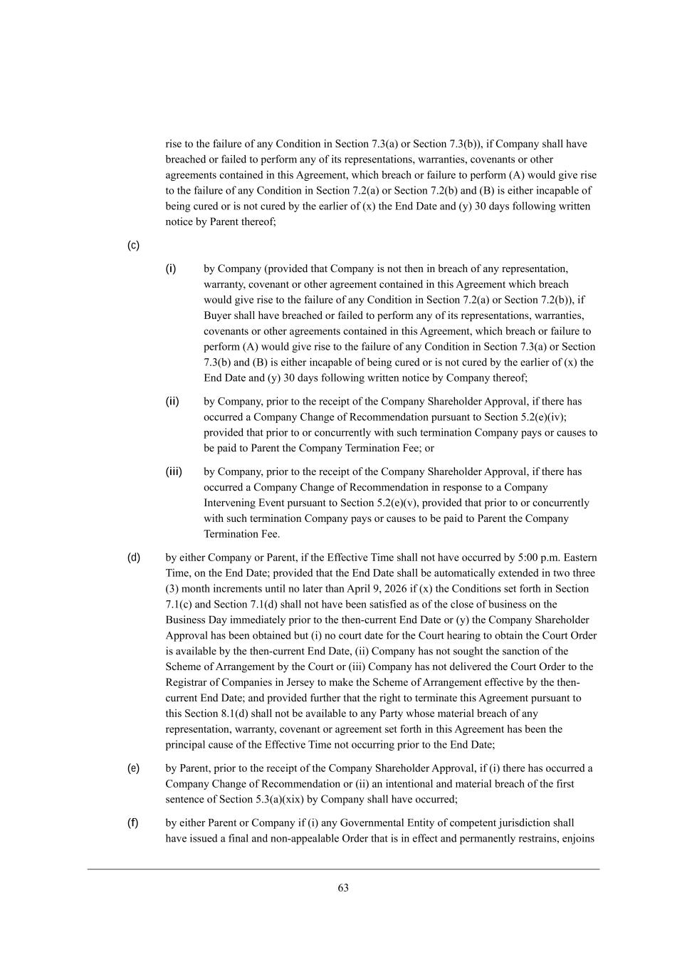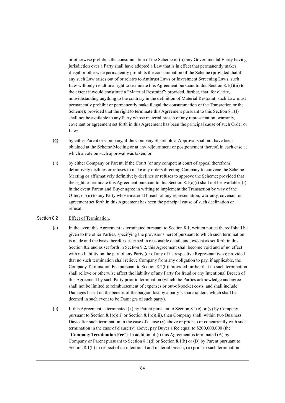 42 eh ej^[hm_i[ fhe^_X_ji j^[ YedikccWj_ed e\ j^[ MY^[c[ eh (__) Wdo Ael[hdc[djWb ?dj_jo ^Wl_d] `kh_iZ_Yj_ed el[h W JWhjo i^Wbb ^Wl[ WZefj[Z W FWm j^Wj _i _d [\\[Yj j^Wj f[hcWd[djbo cWa[i _bb[]Wb eh ej^[hm_i[ f[hcWd[djbo fhe^_X_ji j^[ YedikccWj_ed e\ j^[ MY^[c[ (fhel_Z[Z j^Wj _\ Wdo ikY^ FWm Wh_i[i ekj e\ eh h[bWj[i je ;dj_jhkij FWmi eh Cdl[ijc[dj MYh[[d_d] FWmi* ikY^ FWm m_bb edbo h[ikbj _d W h_]^j je j[hc_dWj[ j^_i ;]h[[c[dj fkhikWdj je j^_i M[Yj_ed 6,/(\)(__) je j^[ [nj[dj _j mekbZ Yedij_jkj[ W rGWj[h_Wb L[ijhW_djs9 fhel_Z[Z* \khj^[h* j^Wj* \eh YbWh_jo* dejm_j^ijWdZ_d] Wdoj^_d] je j^[ YedjhWho _d j^[ Z[\_d_j_ed e\ GWj[h_Wb L[ijhW_dj* ikY^ FWm ckij f[hcWd[djbo fhe^_X_j eh f[hcWd[djbo cWa[ _bb[]Wb j^[ YedikccWj_ed e\ j^[ NhWdiWYj_ed eh j^[ MY^[c[)9 fhel_Z[Z j^Wj j^[ h_]^j je j[hc_dWj[ j^_i ;]h[[c[dj fkhikWdj je j^_i M[Yj_ed 6,/(\) i^Wbb dej X[ WlW_bWXb[ je Wdo JWhjo m^ei[ cWj[h_Wb Xh[WY^ e\ Wdo h[fh[i[djWj_ed* mWhhWdjo* Yel[dWdj eh W]h[[c[dj i[j \ehj^ _d j^_i ;]h[[c[dj ^Wi X[[d j^[ fh_dY_fWb YWki[ e\ ikY^ IhZ[h eh FWm9 (g) Xo [_j^[h JWh[dj eh =ecfWdo* _\ j^[ =ecfWdo M^Wh[^ebZ[h ;ffhelWb i^Wbb dej ^Wl[ X[[d eXjW_d[Z Wj j^[ MY^[c[ G[[j_d] eh Wj Wdo WZ`ekhdc[dj eh feijfed[c[dj j^[h[e\* _d [WY^ YWi[ Wj m^_Y^ W lej[ ed ikY^ WffhelWb mWi jWa[d9 eh (h) Xo [_j^[h =ecfWdo eh JWh[dj* _\ j^[ =ekhj (eh Wdo Yecf[j[dj Yekhj e\ Wff[Wb j^[h[\hec) Z[\_d_j_l[bo Z[Yb_d[i eh h[\ki[i je cWa[ Wdo ehZ[hi Z_h[Yj_d] =ecfWdo je Yedl[d[ j^[ MY^[c[ G[[j_d] eh W\\_hcWj_l[bo Z[\_d_j_l[bo Z[Yb_d[i eh h[\ki[i je Wffhel[ j^[ MY^[c[9 fhel_Z[Z j^Wj j^[ h_]^j je j[hc_dWj[ j^_i ;]h[[c[dj fkhikWdj je j^_i M[Yj_ed 6,/(Y)(_) i^Wbb dej X[ WlW_bWXb[* (_) _d j^[ [l[dj JWh[dj WdZ <ko[h W]h[[ _d mh_j_d] je _cfb[c[dj j^[ NhWdiWYj_ed Xo mWo e\ j^[ I\\[h9 eh (__) je Wdo JWhjo m^ei[ cWj[h_Wb Xh[WY^ e\ Wdo h[fh[i[djWj_ed* mWhhWdjo* Yel[dWdj eh W]h[[c[dj i[j \ehj^ _d j^_i ;]h[[c[dj ^Wi X[[d j^[ fh_dY_fWb YWki[ e\ ikY^ Z[Yb_dWj_ed eh h[\kiWb, Section 8.2 ?\\[Yj e\ N[hc_dWj_ed, (a) Cd j^[ [l[dj j^_i ;]h[[c[dj _i j[hc_dWj[Z fkhikWdj je M[Yj_ed 6,/* mh_jj[d dej_Y[ j^[h[e\ i^Wbb X[ ]_l[d je j^[ ej^[h JWhj_[i* if[Y_\o_d] j^[ fhel_i_edi ^[h[e\ fkhikWdj je m^_Y^ ikY^ j[hc_dWj_ed _i cWZ[ WdZ j^[ XWi_i j^[h[\eh Z[iYh_X[Z _d h[WiedWXb[ Z[jW_b* WdZ* [nY[fj Wi i[j \ehj^ _d j^_i M[Yj_ed 6,0 WdZ Wi i[j \ehj^ _d M[Yj_ed 7,0* j^_i ;]h[[c[dj i^Wbb X[Yec[ le_Z WdZ e\ de [\\[Yj m_j^ de b_WX_b_jo ed j^[ fWhj e\ Wdo JWhjo (eh e\ Wdo e\ _ji h[if[Yj_l[ L[fh[i[djWj_l[i)9 fhel_Z[Z j^Wj de ikY^ j[hc_dWj_ed i^Wbb h[b_[l[ =ecfWdo \hec Wdo eXb_]Wj_ed je fWo* _\ Wffb_YWXb[* j^[ =ecfWdo N[hc_dWj_ed @[[ fkhikWdj je M[Yj_ed 6,0(X)9 fhel_Z[Z \khj^[h j^Wj de ikY^ j[hc_dWj_ed i^Wbb h[b_[l[ eh ej^[hm_i[ W\\[Yj j^[ b_WX_b_jo e\ Wdo JWhjo \eh \hWkZ eh Wdo Cdj[dj_edWb <h[WY^ e\ j^_i ;]h[[c[dj Xo ikY^ JWhjo fh_eh je j[hc_dWj_ed (m^_Y^ j^[ JWhj_[i WYademb[Z][ WdZ W]h[[ i^Wbb dej X[ b_c_j[Z je h[_cXkhi[c[dj e\ [nf[di[i eh ekj+e\+feYa[j Yeiji* WdZ i^Wbb _dYbkZ[ >WcW][i XWi[Z ed j^[ X[d[\_j e\ j^[ XWh]W_d beij Xo W fWhjoui i^Wh[^ebZ[hi* m^_Y^ i^Wbb X[ Z[[c[Z _d ikY^ [l[dj je X[ >WcW][i e\ ikY^ fWhjo), (b) C\ j^_i ;]h[[c[dj _i j[hc_dWj[Z (n) Xo JWh[dj fkhikWdj je M[Yj_ed 6,/([) eh (o) Xo =ecfWdo fkhikWdj je M[Yj_ed 6,/(Y)(__) eh M[Yj_ed 6,/(Y)(___)* j^[d =ecfWdo i^Wbb* m_j^_d jme <ki_d[ii >Woi W\j[h ikY^ j[hc_dWj_ed _d j^[ YWi[ e\ YbWki[ (n) WXel[ eh fh_eh je eh YedYkhh[djbo m_j^ ikY^ j[hc_dWj_ed _d j^[ YWi[ e\ YbWki[ (o) WXel[* fWo <ko[h W \[[ [gkWb je $0..*...*... (j^[ rCompany Termination Fees), Cd WZZ_j_ed* _\ (_) j^_i ;]h[[c[dj _i j[hc_dWj[Z (;) Xo =ecfWdo eh JWh[dj fkhikWdj je M[Yj_ed 6,/(Z) eh M[Yj_ed 6,/(^) eh (<) Xo JWh[dj fkhikWdj je M[Yj_ed 6,/(X) _d h[if[Yj e\ Wd _dj[dj_edWb WdZ cWj[h_Wb Xh[WY^* (__) fh_eh je ikY^ j[hc_dWj_ed