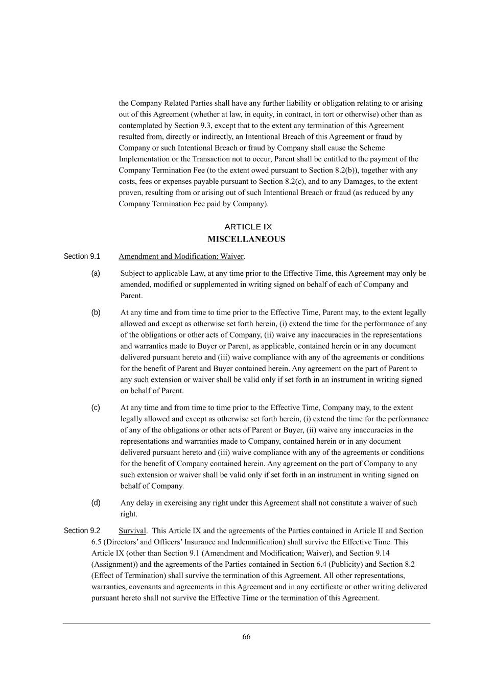 44 j^[ =ecfWdo L[bWj[Z JWhj_[i i^Wbb ^Wl[ Wdo \khj^[h b_WX_b_jo eh eXb_]Wj_ed h[bWj_d] je eh Wh_i_d] ekj e\ j^_i ;]h[[c[dj (m^[j^[h Wj bWm* _d [gk_jo* _d YedjhWYj* _d jehj eh ej^[hm_i[) ej^[h j^Wd Wi Yedj[cfbWj[Z Xo M[Yj_ed 7,1* [nY[fj j^Wj je j^[ [nj[dj Wdo j[hc_dWj_ed e\ j^_i ;]h[[c[dj h[ikbj[Z \hec* Z_h[Yjbo eh _dZ_h[Yjbo* Wd Cdj[dj_edWb <h[WY^ e\ j^_i ;]h[[c[dj eh \hWkZ Xo =ecfWdo eh ikY^ Cdj[dj_edWb <h[WY^ eh \hWkZ Xo =ecfWdo i^Wbb YWki[ j^[ MY^[c[ Ccfb[c[djWj_ed eh j^[ NhWdiWYj_ed dej je eYYkh* JWh[dj i^Wbb X[ [dj_jb[Z je j^[ fWoc[dj e\ j^[ =ecfWdo N[hc_dWj_ed @[[ (je j^[ [nj[dj em[Z fkhikWdj je M[Yj_ed 6,0(X))* je][j^[h m_j^ Wdo Yeiji* \[[i eh [nf[di[i fWoWXb[ fkhikWdj je M[Yj_ed 6,0(Y)* WdZ je Wdo >WcW][i* je j^[ [nj[dj fhel[d* h[ikbj_d] \hec eh Wh_i_d] ekj e\ ikY^ Cdj[dj_edWb <h[WY^ eh \hWkZ (Wi h[ZkY[Z Xo Wdo =ecfWdo N[hc_dWj_ed @[[ fW_Z Xo =ecfWdo), ARTICLE IX MISCELLANEOUS Section 9.1 ;c[dZc[dj WdZ GeZ_\_YWj_ed9 QW_l[h, (a) MkX`[Yj je Wffb_YWXb[ FWm* Wj Wdo j_c[ fh_eh je j^[ ?\\[Yj_l[ N_c[* j^_i ;]h[[c[dj cWo edbo X[ Wc[dZ[Z* ceZ_\_[Z eh ikffb[c[dj[Z _d mh_j_d] i_]d[Z ed X[^Wb\ e\ [WY^ e\ =ecfWdo WdZ JWh[dj, (b) ;j Wdo j_c[ WdZ \hec j_c[ je j_c[ fh_eh je j^[ ?\\[Yj_l[ N_c[* JWh[dj cWo* je j^[ [nj[dj b[]Wbbo Wbbem[Z WdZ [nY[fj Wi ej^[hm_i[ i[j \ehj^ ^[h[_d* (_) [nj[dZ j^[ j_c[ \eh j^[ f[h\ehcWdY[ e\ Wdo e\ j^[ eXb_]Wj_edi eh ej^[h WYji e\ =ecfWdo* (__) mW_l[ Wdo _dWYYkhWY_[i _d j^[ h[fh[i[djWj_edi WdZ mWhhWdj_[i cWZ[ je <ko[h eh JWh[dj* Wi Wffb_YWXb[* YedjW_d[Z ^[h[_d eh _d Wdo ZeYkc[dj Z[b_l[h[Z fkhikWdj ^[h[je WdZ (___) mW_l[ Yecfb_WdY[ m_j^ Wdo e\ j^[ W]h[[c[dji eh YedZ_j_edi \eh j^[ X[d[\_j e\ JWh[dj WdZ <ko[h YedjW_d[Z ^[h[_d, ;do W]h[[c[dj ed j^[ fWhj e\ JWh[dj je Wdo ikY^ [nj[di_ed eh mW_l[h i^Wbb X[ lWb_Z edbo _\ i[j \ehj^ _d Wd _dijhkc[dj _d mh_j_d] i_]d[Z ed X[^Wb\ e\ JWh[dj, (c) ;j Wdo j_c[ WdZ \hec j_c[ je j_c[ fh_eh je j^[ ?\\[Yj_l[ N_c[* =ecfWdo cWo* je j^[ [nj[dj b[]Wbbo Wbbem[Z WdZ [nY[fj Wi ej^[hm_i[ i[j \ehj^ ^[h[_d* (_) [nj[dZ j^[ j_c[ \eh j^[ f[h\ehcWdY[ e\ Wdo e\ j^[ eXb_]Wj_edi eh ej^[h WYji e\ JWh[dj eh <ko[h* (__) mW_l[ Wdo _dWYYkhWY_[i _d j^[ h[fh[i[djWj_edi WdZ mWhhWdj_[i cWZ[ je =ecfWdo* YedjW_d[Z ^[h[_d eh _d Wdo ZeYkc[dj Z[b_l[h[Z fkhikWdj ^[h[je WdZ (___) mW_l[ Yecfb_WdY[ m_j^ Wdo e\ j^[ W]h[[c[dji eh YedZ_j_edi \eh j^[ X[d[\_j e\ =ecfWdo YedjW_d[Z ^[h[_d, ;do W]h[[c[dj ed j^[ fWhj e\ =ecfWdo je Wdo ikY^ [nj[di_ed eh mW_l[h i^Wbb X[ lWb_Z edbo _\ i[j \ehj^ _d Wd _dijhkc[dj _d mh_j_d] i_]d[Z ed X[^Wb\ e\ =ecfWdo, (d) ;do Z[bWo _d [n[hY_i_d] Wdo h_]^j kdZ[h j^_i ;]h[[c[dj i^Wbb dej Yedij_jkj[ W mW_l[h e\ ikY^ h_]^j, Section 9.2 Mkhl_lWb, N^_i ;hj_Yb[ CR WdZ j^[ W]h[[c[dji e\ j^[ JWhj_[i YedjW_d[Z _d ;hj_Yb[ CC WdZ M[Yj_ed 4,3 (>_h[Yjehiu WdZ I\\_Y[hiu CdikhWdY[ WdZ CdZ[cd_\_YWj_ed) i^Wbb ikhl_l[ j^[ ?\\[Yj_l[ N_c[, N^_i ;hj_Yb[ CR (ej^[h j^Wd M[Yj_ed 7,/ (;c[dZc[dj WdZ GeZ_\_YWj_ed9 QW_l[h)* WdZ M[Yj_ed 7,/2 (;ii_]dc[dj)) WdZ j^[ W]h[[c[dji e\ j^[ JWhj_[i YedjW_d[Z _d M[Yj_ed 4,2 (JkXb_Y_jo) WdZ M[Yj_ed 6,0 (?\\[Yj e\ N[hc_dWj_ed) i^Wbb ikhl_l[ j^[ j[hc_dWj_ed e\ j^_i ;]h[[c[dj, ;bb ej^[h h[fh[i[djWj_edi* mWhhWdj_[i* Yel[dWdji WdZ W]h[[c[dji _d j^_i ;]h[[c[dj WdZ _d Wdo Y[hj_\_YWj[ eh ej^[h mh_j_d] Z[b_l[h[Z fkhikWdj ^[h[je i^Wbb dej ikhl_l[ j^[ ?\\[Yj_l[ N_c[ eh j^[ j[hc_dWj_ed e\ j^_i ;]h[[c[dj,