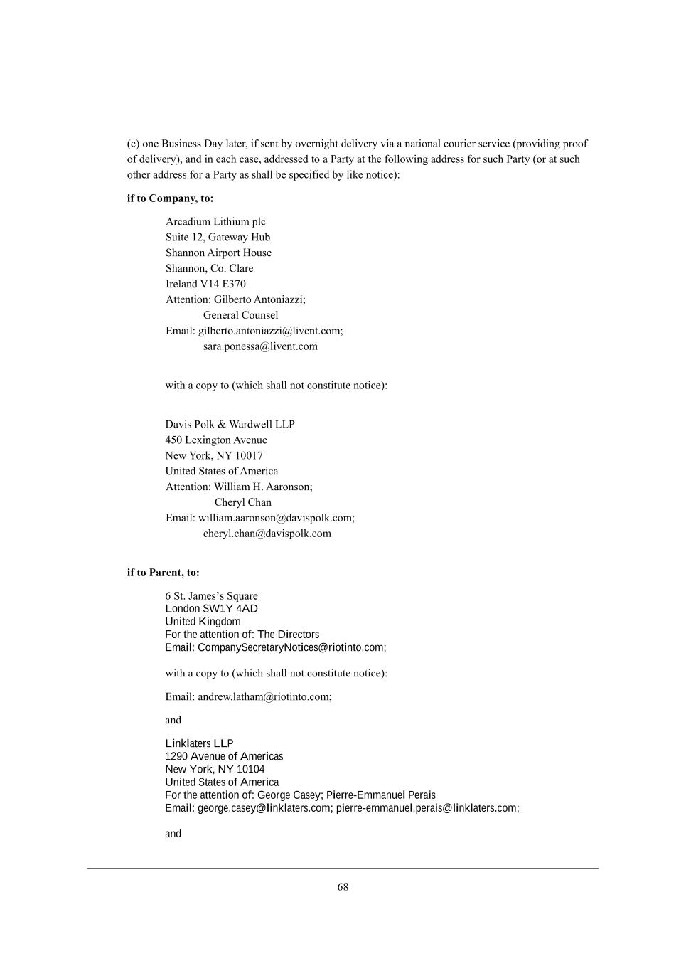 46 (Y) ed[ <ki_d[ii >Wo bWj[h* _\ i[dj Xo el[hd_]^j Z[b_l[ho l_W W dWj_edWb Yekh_[h i[hl_Y[ (fhel_Z_d] fhee\ e\ Z[b_l[ho)* WdZ _d [WY^ YWi[* WZZh[ii[Z je W JWhjo Wj j^[ \ebbem_d] WZZh[ii \eh ikY^ JWhjo (eh Wj ikY^ ej^[h WZZh[ii \eh W JWhjo Wi i^Wbb X[ if[Y_\_[Z Xo b_a[ dej_Y[)8 if to Company, to: ;hYWZ_kc F_j^_kc fbY Mk_j[ /0* AWj[mWo BkX M^Wdded ;_hfehj Beki[ M^Wdded* =e, =bWh[ Ch[bWdZ P/2 ?15. ;jj[dj_ed8 A_bX[hje ;djed_Wpp_9 A[d[hWb =ekdi[b ?cW_b8 ]_bX[hje,Wdjed_Wpp_:b_l[dj,Yec9 iWhW,fed[iiW:b_l[dj,Yec m_j^ W Yefo je (m^_Y^ i^Wbb dej Yedij_jkj[ dej_Y[)8 >Wl_i Jeba & QWhZm[bb FFJ 23. F[n_d]jed ;l[dk[ H[m Seha* HS /../5 Od_j[Z MjWj[i e\ ;c[h_YW ;jj[dj_ed8 Q_bb_Wc B, ;Whedied9 =^[hob =^Wd ?cW_b8 m_bb_Wc,WWhedied:ZWl_ifeba,Yec9 Y^[hob,Y^Wd:ZWl_ifeba,Yec if to Parent, to: 4 Mj, DWc[iui MgkWh[ London SW1Y 4AD United Kingdom For the attention of: The Directors Email: CompanySecretaryNotices@riotinto.com; m_j^ W Yefo je (m^_Y^ i^Wbb dej Yedij_jkj[ dej_Y[)8 ?cW_b8 WdZh[m,bWj^Wc:h_ej_dje,Yec9 WdZ Linklaters LLP 1290 Avenue of Americas New York, NY 10104 United States of America For the attention of: George Casey; Pierre-Emmanuel Perais Email: george.casey@linklaters.com; pierre-emmanuel.perais@linklaters.com; and