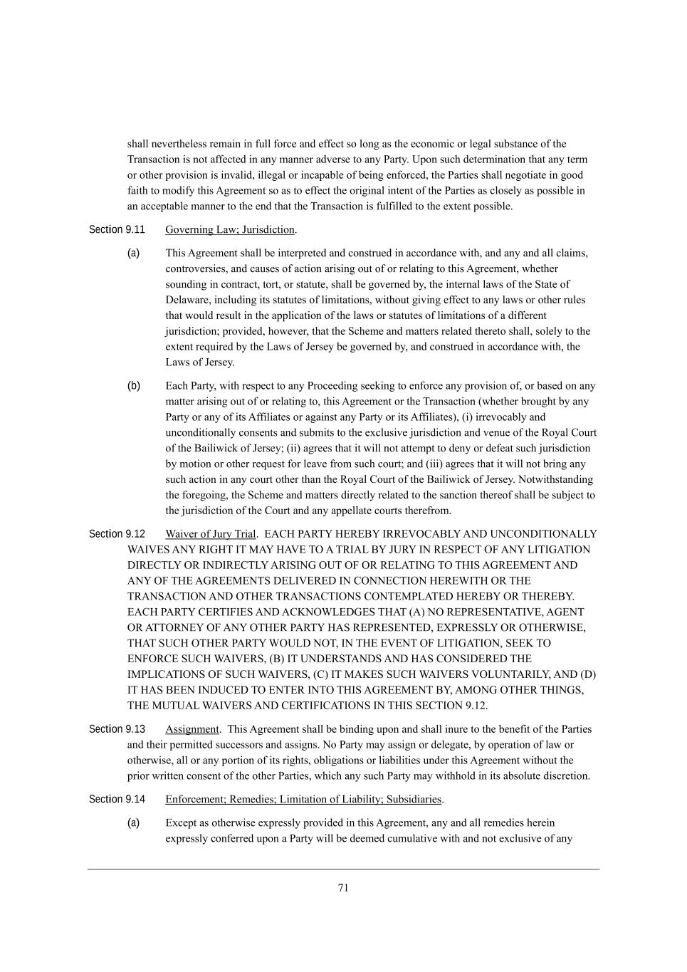 5/ i^Wbb d[l[hj^[b[ii h[cW_d _d \kbb \ehY[ WdZ [\\[Yj ie bed] Wi j^[ [Yedec_Y eh b[]Wb ikXijWdY[ e\ j^[ NhWdiWYj_ed _i dej W\\[Yj[Z _d Wdo cWdd[h WZl[hi[ je Wdo JWhjo, Ofed ikY^ Z[j[hc_dWj_ed j^Wj Wdo j[hc eh ej^[h fhel_i_ed _i _dlWb_Z* _bb[]Wb eh _dYWfWXb[ e\ X[_d] [d\ehY[Z* j^[ JWhj_[i i^Wbb d[]ej_Wj[ _d ]eeZ \W_j^ je ceZ_\o j^_i ;]h[[c[dj ie Wi je [\\[Yj j^[ eh_]_dWb _dj[dj e\ j^[ JWhj_[i Wi Ybei[bo Wi feii_Xb[ _d Wd WYY[fjWXb[ cWdd[h je j^[ [dZ j^Wj j^[ NhWdiWYj_ed _i \kb\_bb[Z je j^[ [nj[dj feii_Xb[, Section 9.11 Ael[hd_d] FWm9 Dkh_iZ_Yj_ed, (a) N^_i ;]h[[c[dj i^Wbb X[ _dj[hfh[j[Z WdZ Yedijhk[Z _d WYYehZWdY[ m_j^* WdZ Wdo WdZ Wbb YbW_ci* Yedjhel[hi_[i* WdZ YWki[i e\ WYj_ed Wh_i_d] ekj e\ eh h[bWj_d] je j^_i ;]h[[c[dj* m^[j^[h iekdZ_d] _d YedjhWYj* jehj* eh ijWjkj[* i^Wbb X[ ]el[hd[Z Xo* j^[ _dj[hdWb bWmi e\ j^[ MjWj[ e\ >[bWmWh[* _dYbkZ_d] _ji ijWjkj[i e\ b_c_jWj_edi* m_j^ekj ]_l_d] [\\[Yj je Wdo bWmi eh ej^[h hkb[i j^Wj mekbZ h[ikbj _d j^[ Wffb_YWj_ed e\ j^[ bWmi eh ijWjkj[i e\ b_c_jWj_edi e\ W Z_\\[h[dj `kh_iZ_Yj_ed9 fhel_Z[Z* ^em[l[h* j^Wj j^[ MY^[c[ WdZ cWjj[hi h[bWj[Z j^[h[je i^Wbb* ieb[bo je j^[ [nj[dj h[gk_h[Z Xo j^[ FWmi e\ D[hi[o X[ ]el[hd[Z Xo* WdZ Yedijhk[Z _d WYYehZWdY[ m_j^* j^[ FWmi e\ D[hi[o, (b) ?WY^ JWhjo* m_j^ h[if[Yj je Wdo JheY[[Z_d] i[[a_d] je [d\ehY[ Wdo fhel_i_ed e\* eh XWi[Z ed Wdo cWjj[h Wh_i_d] ekj e\ eh h[bWj_d] je* j^_i ;]h[[c[dj eh j^[ NhWdiWYj_ed (m^[j^[h Xhek]^j Xo Wdo JWhjo eh Wdo e\ _ji ;\\_b_Wj[i eh W]W_dij Wdo JWhjo eh _ji ;\\_b_Wj[i)* (_) _hh[leYWXbo WdZ kdYedZ_j_edWbbo Yedi[dji WdZ ikXc_ji je j^[ [nYbki_l[ `kh_iZ_Yj_ed WdZ l[dk[ e\ j^[ LeoWb =ekhj e\ j^[ <W_b_m_Ya e\ D[hi[o9 (__) W]h[[i j^Wj _j m_bb dej Wjj[cfj je Z[do eh Z[\[Wj ikY^ `kh_iZ_Yj_ed Xo cej_ed eh ej^[h h[gk[ij \eh b[Wl[ \hec ikY^ Yekhj9 WdZ (___) W]h[[i j^Wj _j m_bb dej Xh_d] Wdo ikY^ WYj_ed _d Wdo Yekhj ej^[h j^Wd j^[ LeoWb =ekhj e\ j^[ <W_b_m_Ya e\ D[hi[o, Hejm_j^ijWdZ_d] j^[ \eh[]e_d]* j^[ MY^[c[ WdZ cWjj[hi Z_h[Yjbo h[bWj[Z je j^[ iWdYj_ed j^[h[e\ i^Wbb X[ ikX`[Yj je j^[ `kh_iZ_Yj_ed e\ j^[ =ekhj WdZ Wdo Wff[bbWj[ Yekhji j^[h[\hec, Section 9.12 QW_l[h e\ Dkho Nh_Wb, ?;=B J;LNS B?L?<S CLL?PI=;<FS ;H> OH=IH>CNCIH;FFS Q;CP?M ;HS LCABN CN G;S B;P? NI ; NLC;F <S DOLS CH L?MJ?=N I@ ;HS FCNCA;NCIH >CL?=NFS IL CH>CL?=NFS ;LCMCHA ION I@ IL L?F;NCHA NI NBCM ;AL??G?HN ;H> ;HS I@ NB? ;AL??G?HNM >?FCP?L?> CH =IHH?=NCIH B?L?QCNB IL NB? NL;HM;=NCIH ;H> INB?L NL;HM;=NCIHM =IHN?GJF;N?> B?L?<S IL NB?L?<S, ?;=B J;LNS =?LNC@C?M ;H> ;=EHIQF?>A?M NB;N (;) HI L?JL?M?HN;NCP?* ;A?HN IL ;NNILH?S I@ ;HS INB?L J;LNS B;M L?JL?M?HN?>* ?RJL?MMFS IL INB?LQCM?* NB;N MO=B INB?L J;LNS QIOF> HIN* CH NB? ?P?HN I@ FCNCA;NCIH* M??E NI ?H@IL=? MO=B Q;CP?LM* (<) CN OH>?LMN;H>M ;H> B;M =IHMC>?L?> NB? CGJFC=;NCIHM I@ MO=B Q;CP?LM* (=) CN G;E?M MO=B Q;CP?LM PIFOHN;LCFS* ;H> (>) CN B;M <??H CH>O=?> NI ?HN?L CHNI NBCM ;AL??G?HN <S* ;GIHA INB?L NBCHAM* NB? GONO;F Q;CP?LM ;H> =?LNC@C=;NCIHM CH NBCM M?=NCIH 7,/0, Section 9.13 ;ii_]dc[dj, N^_i ;]h[[c[dj i^Wbb X[ X_dZ_d] kfed WdZ i^Wbb _dkh[ je j^[ X[d[\_j e\ j^[ JWhj_[i WdZ j^[_h f[hc_jj[Z ikYY[iiehi WdZ Wii_]di, He JWhjo cWo Wii_]d eh Z[b[]Wj[* Xo ef[hWj_ed e\ bWm eh ej^[hm_i[* Wbb eh Wdo fehj_ed e\ _ji h_]^ji* eXb_]Wj_edi eh b_WX_b_j_[i kdZ[h j^_i ;]h[[c[dj m_j^ekj j^[ fh_eh mh_jj[d Yedi[dj e\ j^[ ej^[h JWhj_[i* m^_Y^ Wdo ikY^ JWhjo cWo m_j^^ebZ _d _ji WXiebkj[ Z_iYh[j_ed, Section 9.14 ?d\ehY[c[dj9 L[c[Z_[i9 F_c_jWj_ed e\ F_WX_b_jo9 MkXi_Z_Wh_[i, (a) ?nY[fj Wi ej^[hm_i[ [nfh[iibo fhel_Z[Z _d j^_i ;]h[[c[dj* Wdo WdZ Wbb h[c[Z_[i ^[h[_d [nfh[iibo Yed\[hh[Z kfed W JWhjo m_bb X[ Z[[c[Z YkckbWj_l[ m_j^ WdZ dej [nYbki_l[ e\ Wdo