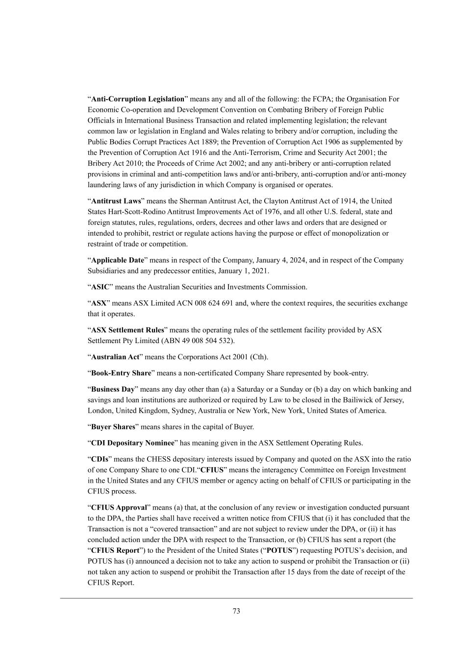 51 rAnti-Corruption Legislations c[Wdi Wdo WdZ Wbb e\ j^[ \ebbem_d]8 j^[ @=J;9 j^[ Ih]Wd_iWj_ed @eh ?Yedec_Y =e+ef[hWj_ed WdZ >[l[befc[dj =edl[dj_ed ed =ecXWj_d] <h_X[ho e\ @eh[_]d JkXb_Y I\\_Y_Wbi _d Cdj[hdWj_edWb <ki_d[ii NhWdiWYj_ed WdZ h[bWj[Z _cfb[c[dj_d] b[]_ibWj_ed9 j^[ h[b[lWdj Yecced bWm eh b[]_ibWj_ed _d ?d]bWdZ WdZ QWb[i h[bWj_d] je Xh_X[ho WdZ-eh Yehhkfj_ed* _dYbkZ_d] j^[ JkXb_Y <eZ_[i =ehhkfj JhWYj_Y[i ;Yj /6679 j^[ Jh[l[dj_ed e\ =ehhkfj_ed ;Yj /7.4 Wi ikffb[c[dj[Z Xo j^[ Jh[l[dj_ed e\ =ehhkfj_ed ;Yj /7/4 WdZ j^[ ;dj_+N[hheh_ic* =h_c[ WdZ M[Ykh_jo ;Yj 0../9 j^[ <h_X[ho ;Yj 0./.9 j^[ JheY[[Zi e\ =h_c[ ;Yj 0..09 WdZ Wdo Wdj_+Xh_X[ho eh Wdj_+Yehhkfj_ed h[bWj[Z fhel_i_edi _d Yh_c_dWb WdZ Wdj_+Yecf[j_j_ed bWmi WdZ-eh Wdj_+Xh_X[ho* Wdj_+Yehhkfj_ed WdZ-eh Wdj_+ced[o bWkdZ[h_d] bWmi e\ Wdo `kh_iZ_Yj_ed _d m^_Y^ =ecfWdo _i eh]Wd_i[Z eh ef[hWj[i, rAntitrust Lawss c[Wdi j^[ M^[hcWd ;dj_jhkij ;Yj* j^[ =bWojed ;dj_jhkij ;Yj e\ /7/2* j^[ Od_j[Z MjWj[i BWhj+MYejj+LeZ_de ;dj_jhkij Ccfhel[c[dji ;Yj e\ /754* WdZ Wbb ej^[h O,M, \[Z[hWb* ijWj[ WdZ \eh[_]d ijWjkj[i* hkb[i* h[]kbWj_edi* ehZ[hi* Z[Yh[[i WdZ ej^[h bWmi WdZ ehZ[hi j^Wj Wh[ Z[i_]d[Z eh _dj[dZ[Z je fhe^_X_j* h[ijh_Yj eh h[]kbWj[ WYj_edi ^Wl_d] j^[ fkhfei[ eh [\\[Yj e\ cedefeb_pWj_ed eh h[ijhW_dj e\ jhWZ[ eh Yecf[j_j_ed, rApplicable Dates c[Wdi _d h[if[Yj e\ j^[ =ecfWdo* DWdkWho 2* 0.02* WdZ _d h[if[Yj e\ j^[ =ecfWdo MkXi_Z_Wh_[i WdZ Wdo fh[Z[Y[iieh [dj_j_[i* DWdkWho /* 0.0/, rASICs c[Wdi j^[ ;kijhWb_Wd M[Ykh_j_[i WdZ Cdl[ijc[dji =ecc_ii_ed, rASXs c[Wdi ;MR F_c_j[Z ;=H ..6 402 47/ WdZ* m^[h[ j^[ Yedj[nj h[gk_h[i* j^[ i[Ykh_j_[i [nY^Wd][ j^Wj _j ef[hWj[i, rASX Settlement Ruless c[Wdi j^[ ef[hWj_d] hkb[i e\ j^[ i[jjb[c[dj \WY_b_jo fhel_Z[Z Xo ;MR M[jjb[c[dj Jjo F_c_j[Z (;<H 27 ..6 3.2 310), rAustralian Acts c[Wdi j^[ =ehfehWj_edi ;Yj 0../ (=j^), rBook-Entry Shares c[Wdi W ded+Y[hj_\_YWj[Z =ecfWdo M^Wh[ h[fh[i[dj[Z Xo Xeea+[djho, rBusiness Days c[Wdi Wdo ZWo ej^[h j^Wd (W) W MWjkhZWo eh W MkdZWo eh (X) W ZWo ed m^_Y^ XWda_d] WdZ iWl_d]i WdZ beWd _dij_jkj_edi Wh[ Wkj^eh_p[Z eh h[gk_h[Z Xo FWm je X[ Ybei[Z _d j^[ <W_b_m_Ya e\ D[hi[o* FedZed* Od_j[Z E_d]Zec* MoZd[o* ;kijhWb_W eh H[m Seha* H[m Seha* Od_j[Z MjWj[i e\ ;c[h_YW, rBuyer Sharess c[Wdi i^Wh[i _d j^[ YWf_jWb e\ <ko[h, rCDI Depositary Nominees ^Wi c[Wd_d] ]_l[d _d j^[ ;MR M[jjb[c[dj If[hWj_d] Lkb[i, rCDIss c[Wdi j^[ =B?MM Z[fei_jWho _dj[h[iji _iik[Z Xo =ecfWdo WdZ gkej[Z ed j^[ ;MR _dje j^[ hWj_e e\ ed[ =ecfWdo M^Wh[ je ed[ =>C,rCFIUSs c[Wdi j^[ _dj[hW][dYo =ecc_jj[[ ed @eh[_]d Cdl[ijc[dj _d j^[ Od_j[Z MjWj[i WdZ Wdo =@COM c[cX[h eh W][dYo WYj_d] ed X[^Wb\ e\ =@COM eh fWhj_Y_fWj_d] _d j^[ =@COM fheY[ii, rCFIUS Approvals c[Wdi (W) j^Wj* Wj j^[ YedYbki_ed e\ Wdo h[l_[m eh _dl[ij_]Wj_ed YedZkYj[Z fkhikWdj je j^[ >J;* j^[ JWhj_[i i^Wbb ^Wl[ h[Y[_l[Z W mh_jj[d dej_Y[ \hec =@COM j^Wj (_) _j ^Wi YedYbkZ[Z j^Wj j^[ NhWdiWYj_ed _i dej W rYel[h[Z jhWdiWYj_eds WdZ Wh[ dej ikX`[Yj je h[l_[m kdZ[h j^[ >J;* eh (__) _j ^Wi YedYbkZ[Z WYj_ed kdZ[h j^[ >J; m_j^ h[if[Yj je j^[ NhWdiWYj_ed* eh (X) =@COM ^Wi i[dj W h[fehj (j^[ rCFIUS Reports) je j^[ Jh[i_Z[dj e\ j^[ Od_j[Z MjWj[i (rPOTUSs) h[gk[ij_d] JINOMui Z[Y_i_ed* WdZ JINOM ^Wi (_) WddekdY[Z W Z[Y_i_ed dej je jWa[ Wdo WYj_ed je ikif[dZ eh fhe^_X_j j^[ NhWdiWYj_ed eh (__) dej jWa[d Wdo WYj_ed je ikif[dZ eh fhe^_X_j j^[ NhWdiWYj_ed W\j[h /3 ZWoi \hec j^[ ZWj[ e\ h[Y[_fj e\ j^[ =@COM L[fehj,