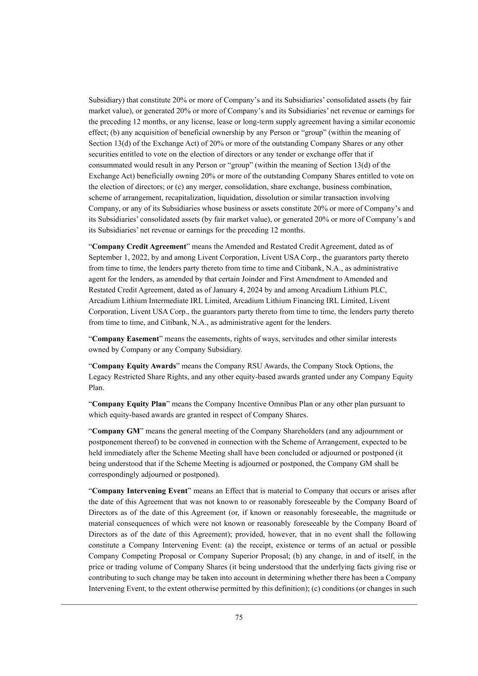 53 MkXi_Z_Who) j^Wj Yedij_jkj[ 0.% eh ceh[ e\ =ecfWdoui WdZ _ji MkXi_Z_Wh_[iu Yedieb_ZWj[Z Wii[ji (Xo \W_h cWha[j lWbk[)* eh ][d[hWj[Z 0.% eh ceh[ e\ =ecfWdoui WdZ _ji MkXi_Z_Wh_[iu d[j h[l[dk[ eh [Whd_d]i \eh j^[ fh[Y[Z_d] /0 cedj^i* eh Wdo b_Y[di[* b[Wi[ eh bed]+j[hc ikffbo W]h[[c[dj ^Wl_d] W i_c_bWh [Yedec_Y [\\[Yj9 (X) Wdo WYgk_i_j_ed e\ X[d[\_Y_Wb emd[hi^_f Xo Wdo J[hied eh r]hekfs (m_j^_d j^[ c[Wd_d] e\ M[Yj_ed /1(Z) e\ j^[ ?nY^Wd][ ;Yj) e\ 0.% eh ceh[ e\ j^[ ekjijWdZ_d] =ecfWdo M^Wh[i eh Wdo ej^[h i[Ykh_j_[i [dj_jb[Z je lej[ ed j^[ [b[Yj_ed e\ Z_h[Yjehi eh Wdo j[dZ[h eh [nY^Wd][ e\\[h j^Wj _\ YedikccWj[Z mekbZ h[ikbj _d Wdo J[hied eh r]hekfs (m_j^_d j^[ c[Wd_d] e\ M[Yj_ed /1(Z) e\ j^[ ?nY^Wd][ ;Yj) X[d[\_Y_Wbbo emd_d] 0.% eh ceh[ e\ j^[ ekjijWdZ_d] =ecfWdo M^Wh[i [dj_jb[Z je lej[ ed j^[ [b[Yj_ed e\ Z_h[Yjehi9 eh (Y) Wdo c[h][h* Yedieb_ZWj_ed* i^Wh[ [nY^Wd][* Xki_d[ii YecX_dWj_ed* iY^[c[ e\ WhhWd][c[dj* h[YWf_jWb_pWj_ed* b_gk_ZWj_ed* Z_iiebkj_ed eh i_c_bWh jhWdiWYj_ed _dlebl_d] =ecfWdo* eh Wdo e\ _ji MkXi_Z_Wh_[i m^ei[ Xki_d[ii eh Wii[ji Yedij_jkj[ 0.% eh ceh[ e\ =ecfWdoui WdZ _ji MkXi_Z_Wh_[iu Yedieb_ZWj[Z Wii[ji (Xo \W_h cWha[j lWbk[)* eh ][d[hWj[Z 0.% eh ceh[ e\ =ecfWdoui WdZ _ji MkXi_Z_Wh_[iu d[j h[l[dk[ eh [Whd_d]i \eh j^[ fh[Y[Z_d] /0 cedj^i, rCompany Credit Agreements c[Wdi j^[ ;c[dZ[Z WdZ L[ijWj[Z =h[Z_j ;]h[[c[dj* ZWj[Z Wi e\ M[fj[cX[h /* 0.00* Xo WdZ Wced] F_l[dj =ehfehWj_ed* F_l[dj OM; =ehf,* j^[ ]kWhWdjehi fWhjo j^[h[je \hec j_c[ je j_c[* j^[ b[dZ[hi fWhjo j^[h[je \hec j_c[ je j_c[ WdZ =_j_XWda* H,;,* Wi WZc_d_ijhWj_l[ W][dj \eh j^[ b[dZ[hi* Wi Wc[dZ[Z Xo j^Wj Y[hjW_d De_dZ[h WdZ @_hij ;c[dZc[dj je ;c[dZ[Z WdZ L[ijWj[Z =h[Z_j ;]h[[c[dj* ZWj[Z Wi e\ DWdkWho 2* 0.02 Xo WdZ Wced] ;hYWZ_kc F_j^_kc JF=* ;hYWZ_kc F_j^_kc Cdj[hc[Z_Wj[ CLF F_c_j[Z* ;hYWZ_kc F_j^_kc @_dWdY_d] CLF F_c_j[Z* F_l[dj =ehfehWj_ed* F_l[dj OM; =ehf,* j^[ ]kWhWdjehi fWhjo j^[h[je \hec j_c[ je j_c[* j^[ b[dZ[hi fWhjo j^[h[je \hec j_c[ je j_c[* WdZ =_j_XWda* H,;,* Wi WZc_d_ijhWj_l[ W][dj \eh j^[ b[dZ[hi, rCompany Easements c[Wdi j^[ [Wi[c[dji* h_]^ji e\ mWoi* i[hl_jkZ[i WdZ ej^[h i_c_bWh _dj[h[iji emd[Z Xo =ecfWdo eh Wdo =ecfWdo MkXi_Z_Who, rCompany Equity Awardss c[Wdi j^[ =ecfWdo LMO ;mWhZi* j^[ =ecfWdo MjeYa Ifj_edi* j^[ F[]WYo L[ijh_Yj[Z M^Wh[ L_]^ji* WdZ Wdo ej^[h [gk_jo+XWi[Z WmWhZi ]hWdj[Z kdZ[h Wdo =ecfWdo ?gk_jo JbWd, rCompany Equity Plans c[Wdi j^[ =ecfWdo CdY[dj_l[ Icd_Xki JbWd eh Wdo ej^[h fbWd fkhikWdj je m^_Y^ [gk_jo+XWi[Z WmWhZi Wh[ ]hWdj[Z _d h[if[Yj e\ =ecfWdo M^Wh[i, rCompany GMs c[Wdi j^[ ][d[hWb c[[j_d] e\ j^[ =ecfWdo M^Wh[^ebZ[hi (WdZ Wdo WZ`ekhdc[dj eh feijfed[c[dj j^[h[e\) je X[ Yedl[d[Z _d Yedd[Yj_ed m_j^ j^[ MY^[c[ e\ ;hhWd][c[dj* [nf[Yj[Z je X[ ^[bZ _cc[Z_Wj[bo W\j[h j^[ MY^[c[ G[[j_d] i^Wbb ^Wl[ X[[d YedYbkZ[Z eh WZ`ekhd[Z eh feijfed[Z (_j X[_d] kdZ[hijeeZ j^Wj _\ j^[ MY^[c[ G[[j_d] _i WZ`ekhd[Z eh feijfed[Z* j^[ =ecfWdo AG i^Wbb X[ Yehh[ifedZ_d]bo WZ`ekhd[Z eh feijfed[Z), rCompany Intervening Events c[Wdi Wd ?\\[Yj j^Wj _i cWj[h_Wb je =ecfWdo j^Wj eYYkhi eh Wh_i[i W\j[h j^[ ZWj[ e\ j^_i ;]h[[c[dj j^Wj mWi dej ademd je eh h[WiedWXbo \eh[i[[WXb[ Xo j^[ =ecfWdo <eWhZ e\ >_h[Yjehi Wi e\ j^[ ZWj[ e\ j^_i ;]h[[c[dj (eh* _\ ademd eh h[WiedWXbo \eh[i[[WXb[* j^[ cW]d_jkZ[ eh cWj[h_Wb Yedi[gk[dY[i e\ m^_Y^ m[h[ dej ademd eh h[WiedWXbo \eh[i[[WXb[ Xo j^[ =ecfWdo <eWhZ e\ >_h[Yjehi Wi e\ j^[ ZWj[ e\ j^_i ;]h[[c[dj)9 fhel_Z[Z* ^em[l[h* j^Wj _d de [l[dj i^Wbb j^[ \ebbem_d] Yedij_jkj[ W =ecfWdo Cdj[hl[d_d] ?l[dj8 (W) j^[ h[Y[_fj* [n_ij[dY[ eh j[hci e\ Wd WYjkWb eh feii_Xb[ =ecfWdo =ecf[j_d] JhefeiWb eh =ecfWdo Mkf[h_eh JhefeiWb9 (X) Wdo Y^Wd][* _d WdZ e\ _ji[b\* _d j^[ fh_Y[ eh jhWZ_d] lebkc[ e\ =ecfWdo M^Wh[i (_j X[_d] kdZ[hijeeZ j^Wj j^[ kdZ[hbo_d] \WYji ]_l_d] h_i[ eh Yedjh_Xkj_d] je ikY^ Y^Wd][ cWo X[ jWa[d _dje WYYekdj _d Z[j[hc_d_d] m^[j^[h j^[h[ ^Wi X[[d W =ecfWdo Cdj[hl[d_d] ?l[dj* je j^[ [nj[dj ej^[hm_i[ f[hc_jj[Z Xo j^_i Z[\_d_j_ed)9 (Y) YedZ_j_edi (eh Y^Wd][i _d ikY^