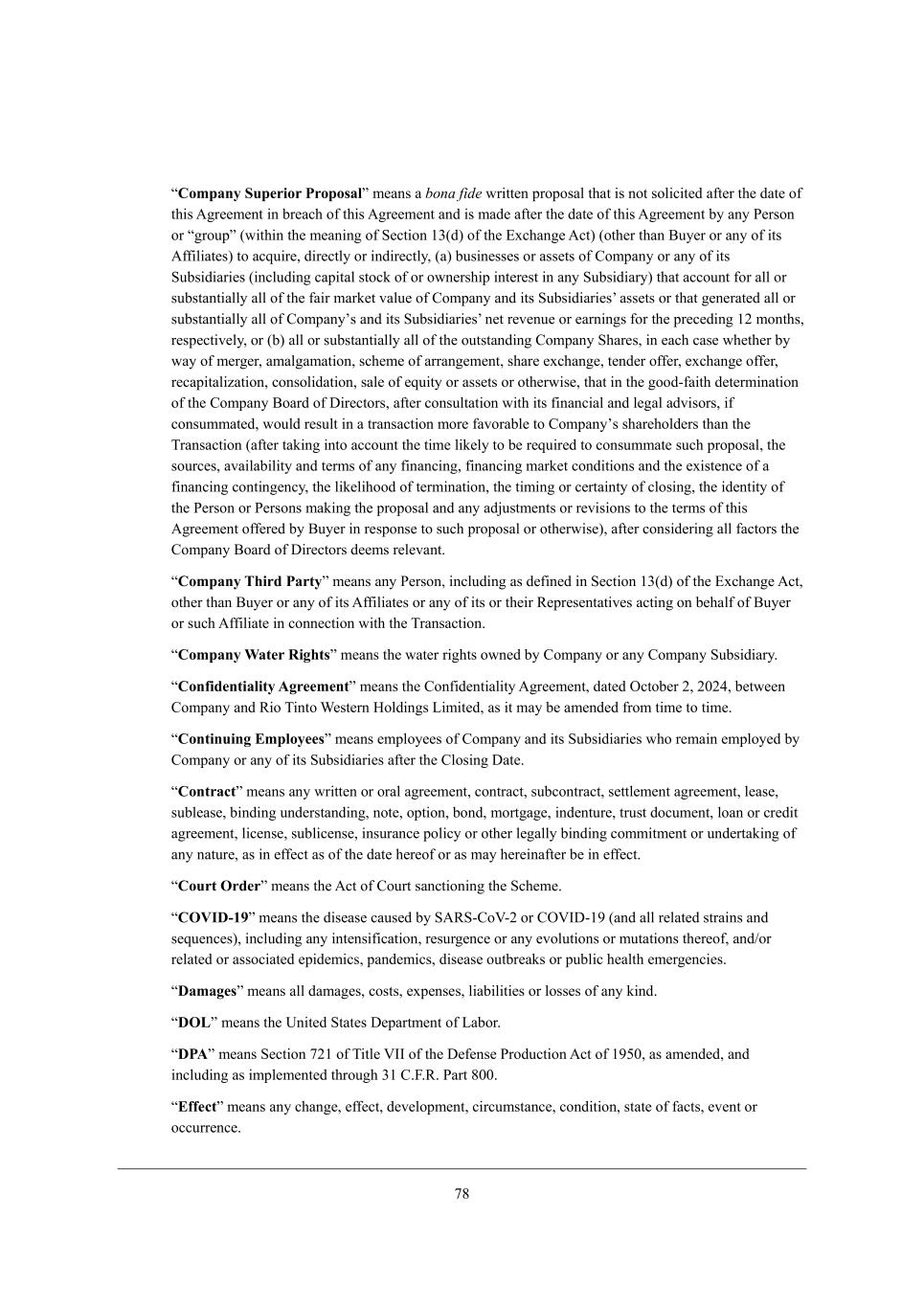 56 rCompany Superior Proposals c[Wdi W bona fide mh_jj[d fhefeiWb j^Wj _i dej ieb_Y_j[Z W\j[h j^[ ZWj[ e\ j^_i ;]h[[c[dj _d Xh[WY^ e\ j^_i ;]h[[c[dj WdZ _i cWZ[ W\j[h j^[ ZWj[ e\ j^_i ;]h[[c[dj Xo Wdo J[hied eh r]hekfs (m_j^_d j^[ c[Wd_d] e\ M[Yj_ed /1(Z) e\ j^[ ?nY^Wd][ ;Yj) (ej^[h j^Wd <ko[h eh Wdo e\ _ji ;\\_b_Wj[i) je WYgk_h[* Z_h[Yjbo eh _dZ_h[Yjbo* (W) Xki_d[ii[i eh Wii[ji e\ =ecfWdo eh Wdo e\ _ji MkXi_Z_Wh_[i (_dYbkZ_d] YWf_jWb ijeYa e\ eh emd[hi^_f _dj[h[ij _d Wdo MkXi_Z_Who) j^Wj WYYekdj \eh Wbb eh ikXijWdj_Wbbo Wbb e\ j^[ \W_h cWha[j lWbk[ e\ =ecfWdo WdZ _ji MkXi_Z_Wh_[iu Wii[ji eh j^Wj ][d[hWj[Z Wbb eh ikXijWdj_Wbbo Wbb e\ =ecfWdoui WdZ _ji MkXi_Z_Wh_[iu d[j h[l[dk[ eh [Whd_d]i \eh j^[ fh[Y[Z_d] /0 cedj^i* h[if[Yj_l[bo* eh (X) Wbb eh ikXijWdj_Wbbo Wbb e\ j^[ ekjijWdZ_d] =ecfWdo M^Wh[i* _d [WY^ YWi[ m^[j^[h Xo mWo e\ c[h][h* WcWb]WcWj_ed* iY^[c[ e\ WhhWd][c[dj* i^Wh[ [nY^Wd][* j[dZ[h e\\[h* [nY^Wd][ e\\[h* h[YWf_jWb_pWj_ed* Yedieb_ZWj_ed* iWb[ e\ [gk_jo eh Wii[ji eh ej^[hm_i[* j^Wj _d j^[ ]eeZ+\W_j^ Z[j[hc_dWj_ed e\ j^[ =ecfWdo <eWhZ e\ >_h[Yjehi* W\j[h YedikbjWj_ed m_j^ _ji \_dWdY_Wb WdZ b[]Wb WZl_iehi* _\ YedikccWj[Z* mekbZ h[ikbj _d W jhWdiWYj_ed ceh[ \WlehWXb[ je =ecfWdoui i^Wh[^ebZ[hi j^Wd j^[ NhWdiWYj_ed (W\j[h jWa_d] _dje WYYekdj j^[ j_c[ b_a[bo je X[ h[gk_h[Z je YedikccWj[ ikY^ fhefeiWb* j^[ iekhY[i* WlW_bWX_b_jo WdZ j[hci e\ Wdo \_dWdY_d]* \_dWdY_d] cWha[j YedZ_j_edi WdZ j^[ [n_ij[dY[ e\ W \_dWdY_d] Yedj_d][dYo* j^[ b_a[b_^eeZ e\ j[hc_dWj_ed* j^[ j_c_d] eh Y[hjW_djo e\ Ybei_d]* j^[ _Z[dj_jo e\ j^[ J[hied eh J[hiedi cWa_d] j^[ fhefeiWb WdZ Wdo WZ`kijc[dji eh h[l_i_edi je j^[ j[hci e\ j^_i ;]h[[c[dj e\\[h[Z Xo <ko[h _d h[ifedi[ je ikY^ fhefeiWb eh ej^[hm_i[)* W\j[h Yedi_Z[h_d] Wbb \WYjehi j^[ =ecfWdo <eWhZ e\ >_h[Yjehi Z[[ci h[b[lWdj, rCompany Third Partys c[Wdi Wdo J[hied* _dYbkZ_d] Wi Z[\_d[Z _d M[Yj_ed /1(Z) e\ j^[ ?nY^Wd][ ;Yj* ej^[h j^Wd <ko[h eh Wdo e\ _ji ;\\_b_Wj[i eh Wdo e\ _ji eh j^[_h L[fh[i[djWj_l[i WYj_d] ed X[^Wb\ e\ <ko[h eh ikY^ ;\\_b_Wj[ _d Yedd[Yj_ed m_j^ j^[ NhWdiWYj_ed, rCompany Water Rightss c[Wdi j^[ mWj[h h_]^ji emd[Z Xo =ecfWdo eh Wdo =ecfWdo MkXi_Z_Who, rConfidentiality Agreements c[Wdi j^[ =ed\_Z[dj_Wb_jo ;]h[[c[dj* ZWj[Z IYjeX[h 0* 0.02* X[jm[[d =ecfWdo WdZ L_e N_dje Q[ij[hd BebZ_d]i F_c_j[Z* Wi _j cWo X[ Wc[dZ[Z \hec j_c[ je j_c[, rContinuing Employeess c[Wdi [cfbeo[[i e\ =ecfWdo WdZ _ji MkXi_Z_Wh_[i m^e h[cW_d [cfbeo[Z Xo =ecfWdo eh Wdo e\ _ji MkXi_Z_Wh_[i W\j[h j^[ =bei_d] >Wj[, rContracts c[Wdi Wdo mh_jj[d eh ehWb W]h[[c[dj* YedjhWYj* ikXYedjhWYj* i[jjb[c[dj W]h[[c[dj* b[Wi[* ikXb[Wi[* X_dZ_d] kdZ[hijWdZ_d]* dej[* efj_ed* XedZ* cehj]W][* _dZ[djkh[* jhkij ZeYkc[dj* beWd eh Yh[Z_j W]h[[c[dj* b_Y[di[* ikXb_Y[di[* _dikhWdY[ feb_Yo eh ej^[h b[]Wbbo X_dZ_d] Yecc_jc[dj eh kdZ[hjWa_d] e\ Wdo dWjkh[* Wi _d [\\[Yj Wi e\ j^[ ZWj[ ^[h[e\ eh Wi cWo ^[h[_dW\j[h X[ _d [\\[Yj, rCourt Orders c[Wdi j^[ ;Yj e\ =ekhj iWdYj_ed_d] j^[ MY^[c[, rCOVID-19s c[Wdi j^[ Z_i[Wi[ YWki[Z Xo M;LM+=eP+0 eh =IPC>+/7 (WdZ Wbb h[bWj[Z ijhW_di WdZ i[gk[dY[i)* _dYbkZ_d] Wdo _dj[di_\_YWj_ed* h[ikh][dY[ eh Wdo [lebkj_edi eh ckjWj_edi j^[h[e\* WdZ-eh h[bWj[Z eh WiieY_Wj[Z [f_Z[c_Yi* fWdZ[c_Yi* Z_i[Wi[ ekjXh[Wai eh fkXb_Y ^[Wbj^ [c[h][dY_[i, rDamagess c[Wdi Wbb ZWcW][i* Yeiji* [nf[di[i* b_WX_b_j_[i eh beii[i e\ Wdo a_dZ, rDOLs c[Wdi j^[ Od_j[Z MjWj[i >[fWhjc[dj e\ FWXeh, rDPAs c[Wdi M[Yj_ed 50/ e\ N_jb[ PCC e\ j^[ >[\[di[ JheZkYj_ed ;Yj e\ /73.* Wi Wc[dZ[Z* WdZ _dYbkZ_d] Wi _cfb[c[dj[Z j^hek]^ 1/ =,@,L, JWhj 6.., rEffects c[Wdi Wdo Y^Wd][* [\\[Yj* Z[l[befc[dj* Y_hYkcijWdY[* YedZ_j_ed* ijWj[ e\ \WYji* [l[dj eh eYYkhh[dY[,