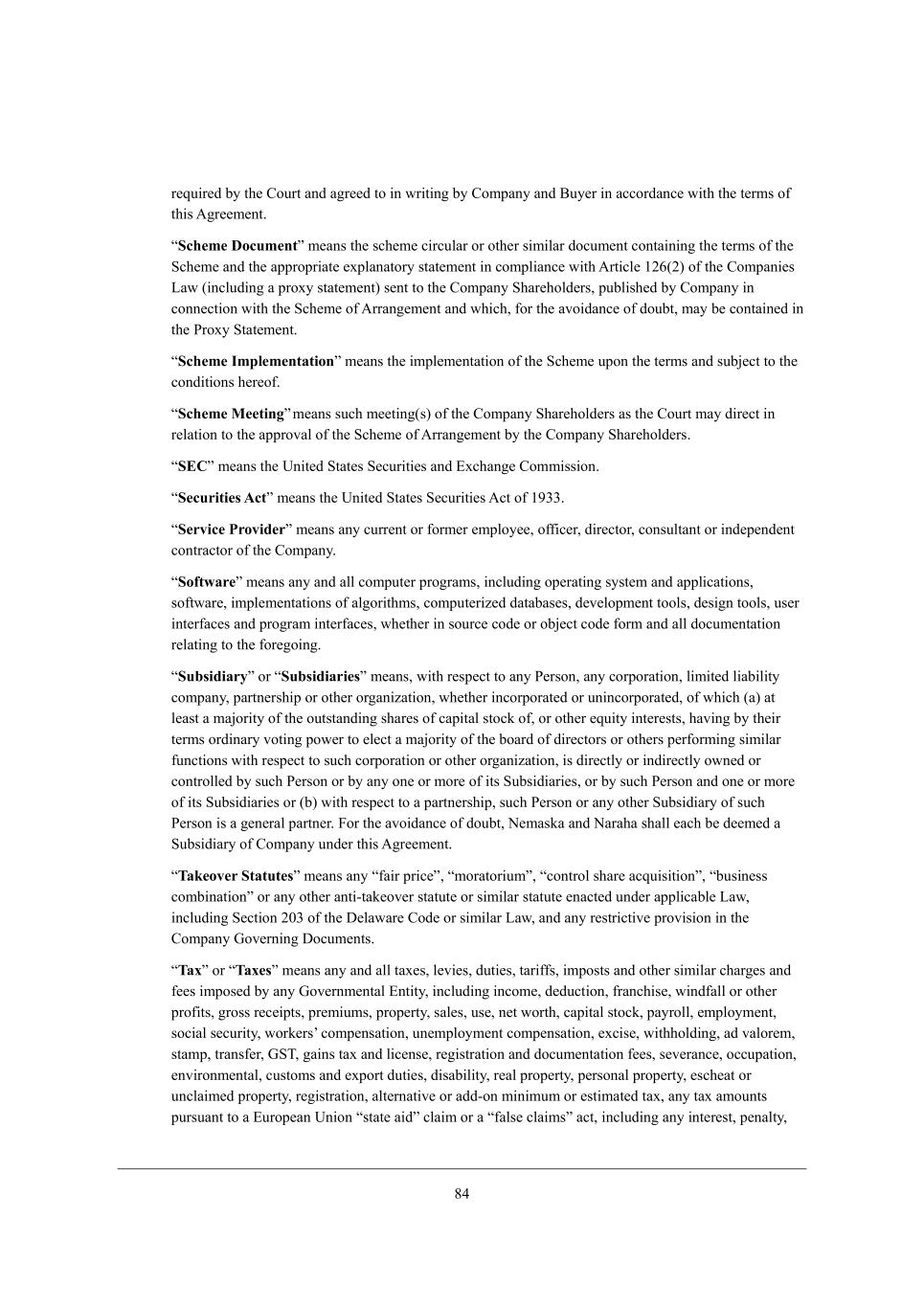62 h[gk_h[Z Xo j^[ =ekhj WdZ W]h[[Z je _d mh_j_d] Xo =ecfWdo WdZ <ko[h _d WYYehZWdY[ m_j^ j^[ j[hci e\ j^_i ;]h[[c[dj, rScheme Documents c[Wdi j^[ iY^[c[ Y_hYkbWh eh ej^[h i_c_bWh ZeYkc[dj YedjW_d_d] j^[ j[hci e\ j^[ MY^[c[ WdZ j^[ Wffhefh_Wj[ [nfbWdWjeho ijWj[c[dj _d Yecfb_WdY[ m_j^ ;hj_Yb[ /04(0) e\ j^[ =ecfWd_[i FWm (_dYbkZ_d] W fheno ijWj[c[dj) i[dj je j^[ =ecfWdo M^Wh[^ebZ[hi* fkXb_i^[Z Xo =ecfWdo _d Yedd[Yj_ed m_j^ j^[ MY^[c[ e\ ;hhWd][c[dj WdZ m^_Y^* \eh j^[ Wle_ZWdY[ e\ ZekXj* cWo X[ YedjW_d[Z _d j^[ Jheno MjWj[c[dj, rScheme Implementations c[Wdi j^[ _cfb[c[djWj_ed e\ j^[ MY^[c[ kfed j^[ j[hci WdZ ikX`[Yj je j^[ YedZ_j_edi ^[h[e\, rScheme Meetingsc[Wdi ikY^ c[[j_d](i) e\ j^[ =ecfWdo M^Wh[^ebZ[hi Wi j^[ =ekhj cWo Z_h[Yj _d h[bWj_ed je j^[ WffhelWb e\ j^[ MY^[c[ e\ ;hhWd][c[dj Xo j^[ =ecfWdo M^Wh[^ebZ[hi, rSECs c[Wdi j^[ Od_j[Z MjWj[i M[Ykh_j_[i WdZ ?nY^Wd][ =ecc_ii_ed, rSecurities Acts c[Wdi j^[ Od_j[Z MjWj[i M[Ykh_j_[i ;Yj e\ /711, rService Providers c[Wdi Wdo Ykhh[dj eh \ehc[h [cfbeo[[* e\\_Y[h* Z_h[Yjeh* YedikbjWdj eh _dZ[f[dZ[dj YedjhWYjeh e\ j^[ =ecfWdo, rSoftwares c[Wdi Wdo WdZ Wbb Yecfkj[h fhe]hWci* _dYbkZ_d] ef[hWj_d] ioij[c WdZ Wffb_YWj_edi* ie\jmWh[* _cfb[c[djWj_edi e\ Wb]eh_j^ci* Yecfkj[h_p[Z ZWjWXWi[i* Z[l[befc[dj jeebi* Z[i_]d jeebi* ki[h _dj[h\WY[i WdZ fhe]hWc _dj[h\WY[i* m^[j^[h _d iekhY[ YeZ[ eh eX`[Yj YeZ[ \ehc WdZ Wbb ZeYkc[djWj_ed h[bWj_d] je j^[ \eh[]e_d], rSubsidiarys eh rSubsidiariess c[Wdi* m_j^ h[if[Yj je Wdo J[hied* Wdo YehfehWj_ed* b_c_j[Z b_WX_b_jo YecfWdo* fWhjd[hi^_f eh ej^[h eh]Wd_pWj_ed* m^[j^[h _dYehfehWj[Z eh kd_dYehfehWj[Z* e\ m^_Y^ (W) Wj b[Wij W cW`eh_jo e\ j^[ ekjijWdZ_d] i^Wh[i e\ YWf_jWb ijeYa e\* eh ej^[h [gk_jo _dj[h[iji* ^Wl_d] Xo j^[_h j[hci ehZ_dWho lej_d] fem[h je [b[Yj W cW`eh_jo e\ j^[ XeWhZ e\ Z_h[Yjehi eh ej^[hi f[h\ehc_d] i_c_bWh \kdYj_edi m_j^ h[if[Yj je ikY^ YehfehWj_ed eh ej^[h eh]Wd_pWj_ed* _i Z_h[Yjbo eh _dZ_h[Yjbo emd[Z eh Yedjhebb[Z Xo ikY^ J[hied eh Xo Wdo ed[ eh ceh[ e\ _ji MkXi_Z_Wh_[i* eh Xo ikY^ J[hied WdZ ed[ eh ceh[ e\ _ji MkXi_Z_Wh_[i eh (X) m_j^ h[if[Yj je W fWhjd[hi^_f* ikY^ J[hied eh Wdo ej^[h MkXi_Z_Who e\ ikY^ J[hied _i W ][d[hWb fWhjd[h, @eh j^[ Wle_ZWdY[ e\ ZekXj* H[cWiaW WdZ HWhW^W i^Wbb [WY^ X[ Z[[c[Z W MkXi_Z_Who e\ =ecfWdo kdZ[h j^_i ;]h[[c[dj, rTakeover Statutess c[Wdi Wdo r\W_h fh_Y[s* rcehWjeh_kcs* rYedjheb i^Wh[ WYgk_i_j_eds* rXki_d[ii YecX_dWj_eds eh Wdo ej^[h Wdj_+jWa[el[h ijWjkj[ eh i_c_bWh ijWjkj[ [dWYj[Z kdZ[h Wffb_YWXb[ FWm* _dYbkZ_d] M[Yj_ed 0.1 e\ j^[ >[bWmWh[ =eZ[ eh i_c_bWh FWm* WdZ Wdo h[ijh_Yj_l[ fhel_i_ed _d j^[ =ecfWdo Ael[hd_d] >eYkc[dji, rTaxs eh rTaxess c[Wdi Wdo WdZ Wbb jWn[i* b[l_[i* Zkj_[i* jWh_\\i* _cfeiji WdZ ej^[h i_c_bWh Y^Wh][i WdZ \[[i _cfei[Z Xo Wdo Ael[hdc[djWb ?dj_jo* _dYbkZ_d] _dYec[* Z[ZkYj_ed* \hWdY^_i[* m_dZ\Wbb eh ej^[h fhe\_ji* ]heii h[Y[_fji* fh[c_kci* fhef[hjo* iWb[i* ki[* d[j mehj^* YWf_jWb ijeYa* fWohebb* [cfbeoc[dj* ieY_Wb i[Ykh_jo* meha[hiu Yecf[diWj_ed* kd[cfbeoc[dj Yecf[diWj_ed* [nY_i[* m_j^^ebZ_d]* WZ lWbeh[c* ijWcf* jhWdi\[h* AMN* ]W_di jWn WdZ b_Y[di[* h[]_ijhWj_ed WdZ ZeYkc[djWj_ed \[[i* i[l[hWdY[* eYYkfWj_ed* [dl_hedc[djWb* Ykijeci WdZ [nfehj Zkj_[i* Z_iWX_b_jo* h[Wb fhef[hjo* f[hiedWb fhef[hjo* [iY^[Wj eh kdYbW_c[Z fhef[hjo* h[]_ijhWj_ed* Wbj[hdWj_l[ eh WZZ+ed c_d_ckc eh [ij_cWj[Z jWn* Wdo jWn Wcekdji fkhikWdj je W ?khef[Wd Od_ed rijWj[ W_Zs YbW_c eh W r\Wbi[ YbW_cis WYj* _dYbkZ_d] Wdo _dj[h[ij* f[dWbjo*