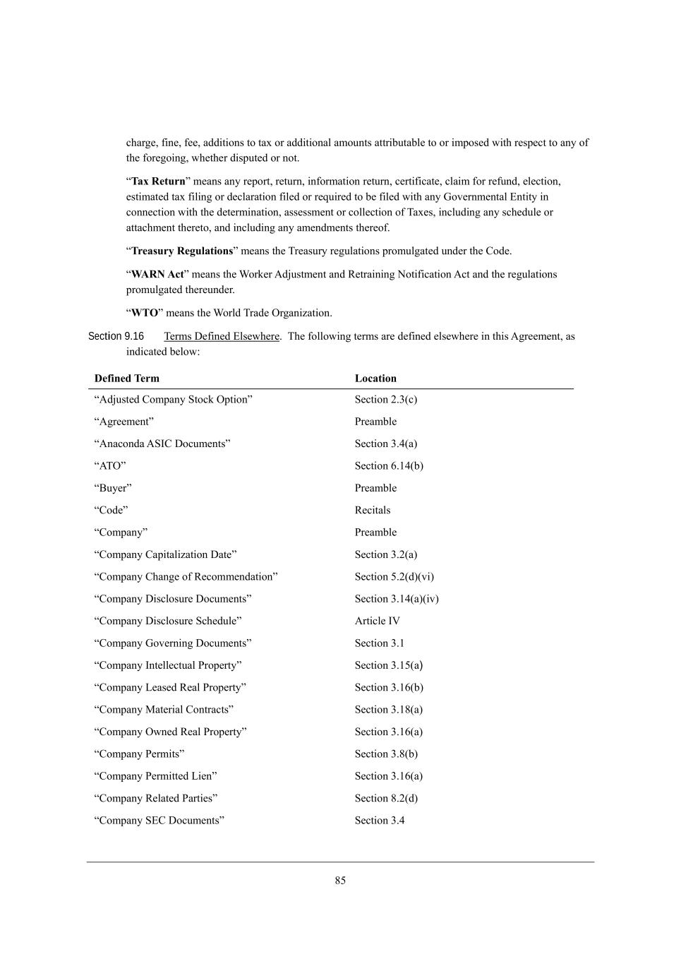 63 Y^Wh][* \_d[* \[[* WZZ_j_edi je jWn eh WZZ_j_edWb Wcekdji Wjjh_XkjWXb[ je eh _cfei[Z m_j^ h[if[Yj je Wdo e\ j^[ \eh[]e_d]* m^[j^[h Z_ifkj[Z eh dej, rTax Returns c[Wdi Wdo h[fehj* h[jkhd* _d\ehcWj_ed h[jkhd* Y[hj_\_YWj[* YbW_c \eh h[\kdZ* [b[Yj_ed* [ij_cWj[Z jWn \_b_d] eh Z[YbWhWj_ed \_b[Z eh h[gk_h[Z je X[ \_b[Z m_j^ Wdo Ael[hdc[djWb ?dj_jo _d Yedd[Yj_ed m_j^ j^[ Z[j[hc_dWj_ed* Wii[iic[dj eh Yebb[Yj_ed e\ NWn[i* _dYbkZ_d] Wdo iY^[Zkb[ eh WjjWY^c[dj j^[h[je* WdZ _dYbkZ_d] Wdo Wc[dZc[dji j^[h[e\, rTreasury Regulationss c[Wdi j^[ Nh[Wikho h[]kbWj_edi fheckb]Wj[Z kdZ[h j^[ =eZ[, rWARN Acts c[Wdi j^[ Qeha[h ;Z`kijc[dj WdZ L[jhW_d_d] Hej_\_YWj_ed ;Yj WdZ j^[ h[]kbWj_edi fheckb]Wj[Z j^[h[kdZ[h, rWTOs c[Wdi j^[ QehbZ NhWZ[ Ih]Wd_pWj_ed, Section 9.16 N[hci >[\_d[Z ?bi[m^[h[, N^[ \ebbem_d] j[hci Wh[ Z[\_d[Z [bi[m^[h[ _d j^_i ;]h[[c[dj* Wi _dZ_YWj[Z X[bem8 Defined Term Location r;Z`kij[Z =ecfWdo MjeYa Ifj_eds M[Yj_ed 0,1(Y) r;]h[[c[djs Jh[WcXb[ r;dWYedZW ;MC= >eYkc[djis M[Yj_ed 1,2(W) r;NIs M[Yj_ed 4,/2(X) r<ko[hs Jh[WcXb[ r=eZ[s L[Y_jWbi r=ecfWdos Jh[WcXb[ r=ecfWdo =Wf_jWb_pWj_ed >Wj[s M[Yj_ed 1,0(W) r=ecfWdo =^Wd][ e\ L[Yecc[dZWj_eds M[Yj_ed 3,0(Z)(l_) r=ecfWdo >_iYbeikh[ >eYkc[djis M[Yj_ed 1,/2(W)(_l) r=ecfWdo >_iYbeikh[ MY^[Zkb[s ;hj_Yb[ CP r=ecfWdo Ael[hd_d] >eYkc[djis M[Yj_ed 1,/ r=ecfWdo Cdj[bb[YjkWb Jhef[hjos M[Yj_ed 1,/3(W) r=ecfWdo F[Wi[Z L[Wb Jhef[hjos M[Yj_ed 1,/4(X) r=ecfWdo GWj[h_Wb =edjhWYjis M[Yj_ed 1,/6(W) r=ecfWdo Imd[Z L[Wb Jhef[hjos M[Yj_ed 1,/4(W) r=ecfWdo J[hc_jis M[Yj_ed 1,6(X) r=ecfWdo J[hc_jj[Z F_[ds M[Yj_ed 1,/4(W) r=ecfWdo L[bWj[Z JWhj_[is M[Yj_ed 6,0(Z) r=ecfWdo M?= >eYkc[djis M[Yj_ed 1,2