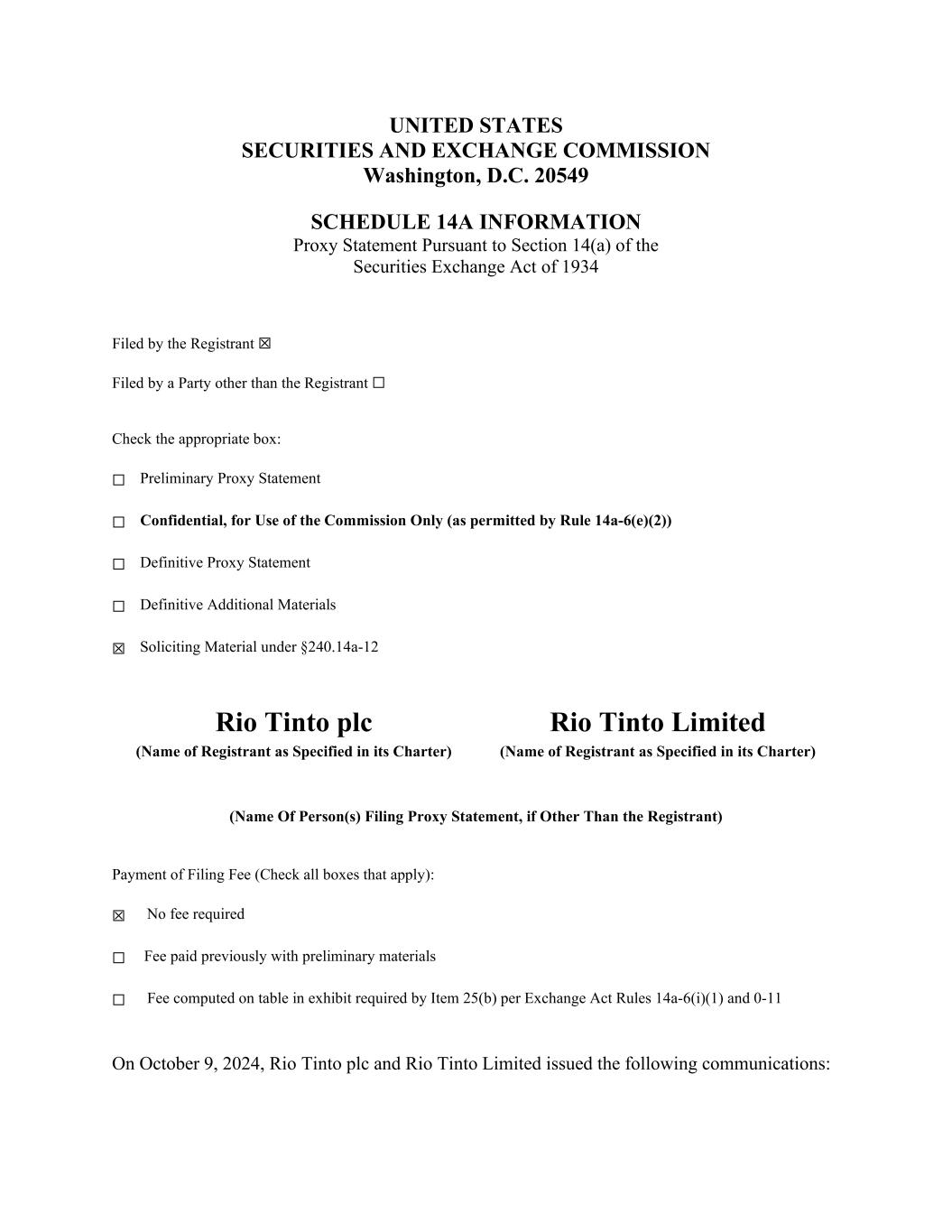 UNITED STATES SECURITIES AND EXCHANGE COMMISSION Washington, D.C. 20549 SCHEDULE 14A INFORMATION Proxy Statement Pursuant to Section 14(a) of the Securities Exchange Act of 1934 Filed by the Registrant ☒ Filed by a Party other than the Registrant ☐ Check the appropriate box: ☐ Preliminary Proxy Statement ☐ Confidential, for Use of the Commission Only (as permitted by Rule 14a-6(e)(2)) ☐ Definitive Proxy Statement ☐ Definitive Additional Materials ☒ Soliciting Material under §240.14a-12 Rio Tinto plc Rio Tinto Limited (Name of Registrant as Specified in its Charter) (Name of Registrant as Specified in its Charter) (Name Of Person(s) Filing Proxy Statement, if Other Than the Registrant) Payment of Filing Fee (Check all boxes that apply): ☒ No fee required ☐ Fee paid previously with preliminary materials ☐ Fee computed on table in exhibit required by Item 25(b) per Exchange Act Rules 14a-6(i)(1) and 0-11 On October 9, 2024, Rio Tinto plc and Rio Tinto Limited issued the following communications: