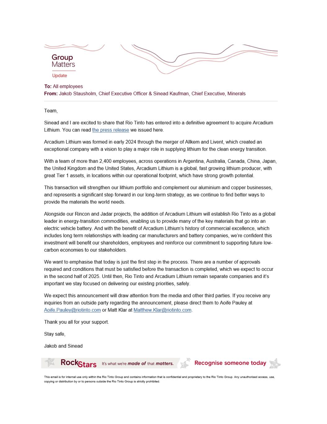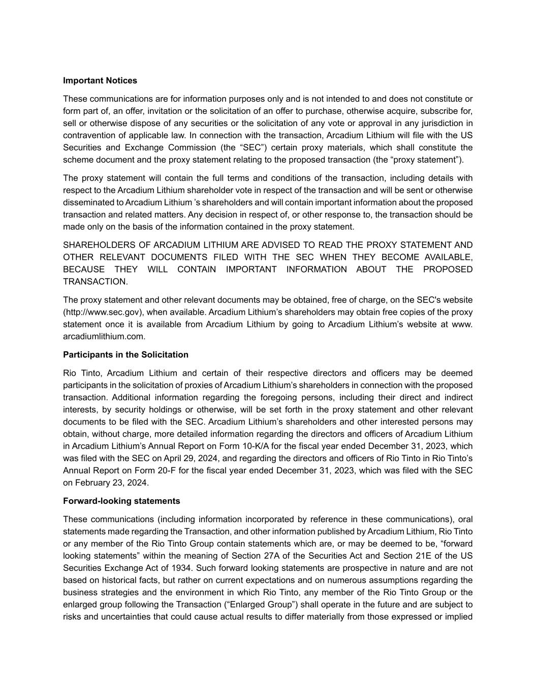 Important Notices These communications are for information purposes only and is not intended to and does not constitute or form part of, an offer, invitation or the solicitation of an offer to purchase, otherwise acquire, subscribe for, sell or otherwise dispose of any securities or the solicitation of any vote or approval in any jurisdiction in contravention of applicable law. In connection with the transaction, Arcadium Lithium will file with the US Securities and Exchange Commission (the “SEC”) certain proxy materials, which shall constitute the scheme document and the proxy statement relating to the proposed transaction (the “proxy statement”). The proxy statement will contain the full terms and conditions of the transaction, including details with respect to the Arcadium Lithium shareholder vote in respect of the transaction and will be sent or otherwise disseminated to Arcadium Lithium ’s shareholders and will contain important information about the proposed transaction and related matters. Any decision in respect of, or other response to, the transaction should be made only on the basis of the information contained in the proxy statement. SHAREHOLDERS OF ARCADIUM LITHIUM ARE ADVISED TO READ THE PROXY STATEMENT AND OTHER RELEVANT DOCUMENTS FILED WITH THE SEC WHEN THEY BECOME AVAILABLE, BECAUSE THEY WILL CONTAIN IMPORTANT INFORMATION ABOUT THE PROPOSED TRANSACTION. The proxy statement and other relevant documents may be obtained, free of charge, on the SEC's website (http://www.sec.gov), when available. Arcadium Lithium’s shareholders may obtain free copies of the proxy statement once it is available from Arcadium Lithium by going to Arcadium Lithium’s website at www. arcadiumlithium.com. Participants in the Solicitation Rio Tinto, Arcadium Lithium and certain of their respective directors and officers may be deemed participants in the solicitation of proxies of Arcadium Lithium’s shareholders in connection with the proposed transaction. Additional information regarding the foregoing persons, including their direct and indirect interests, by security holdings or otherwise, will be set forth in the proxy statement and other relevant documents to be filed with the SEC. Arcadium Lithium’s shareholders and other interested persons may obtain, without charge, more detailed information regarding the directors and officers of Arcadium Lithium in Arcadium Lithium’s Annual Report on Form 10-K/A for the fiscal year ended December 31, 2023, which was filed with the SEC on April 29, 2024, and regarding the directors and officers of Rio Tinto in Rio Tinto’s Annual Report on Form 20-F for the fiscal year ended December 31, 2023, which was filed with the SEC on February 23, 2024. Forward-looking statements These communications (including information incorporated by reference in these communications), oral statements made regarding the Transaction, and other information published by Arcadium Lithium, Rio Tinto or any member of the Rio Tinto Group contain statements which are, or may be deemed to be, “forward looking statements” within the meaning of Section 27A of the Securities Act and Section 21E of the US Securities Exchange Act of 1934. Such forward looking statements are prospective in nature and are not based on historical facts, but rather on current expectations and on numerous assumptions regarding the business strategies and the environment in which Rio Tinto, any member of the Rio Tinto Group or the enlarged group following the Transaction (“Enlarged Group”) shall operate in the future and are subject to risks and uncertainties that could cause actual results to differ materially from those expressed or implied