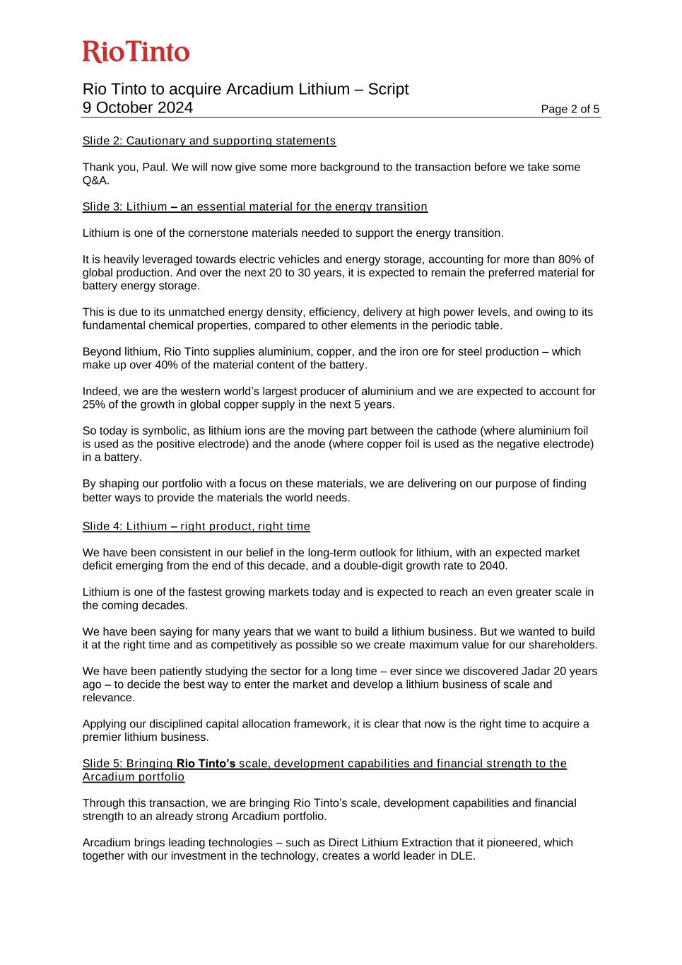 Rio Tinto to acquire Arcadium Lithium – Script 9 October 2024 Page 2 of 5 Slide 2: Cautionary and supporting statements Thank you, Paul. We will now give some more background to the transaction before we take some Q&A. Slide 3: Lithium – an essential material for the energy transition Lithium is one of the cornerstone materials needed to support the energy transition. It is heavily leveraged towards electric vehicles and energy storage, accounting for more than 80% of global production. And over the next 20 to 30 years, it is expected to remain the preferred material for battery energy storage. This is due to its unmatched energy density, efficiency, delivery at high power levels, and owing to its fundamental chemical properties, compared to other elements in the periodic table. Beyond lithium, Rio Tinto supplies aluminium, copper, and the iron ore for steel production – which make up over 40% of the material content of the battery. Indeed, we are the western world’s largest producer of aluminium and we are expected to account for 25% of the growth in global copper supply in the next 5 years. So today is symbolic, as lithium ions are the moving part between the cathode (where aluminium foil is used as the positive electrode) and the anode (where copper foil is used as the negative electrode) in a battery. By shaping our portfolio with a focus on these materials, we are delivering on our purpose of finding better ways to provide the materials the world needs. Slide 4: Lithium – right product, right time We have been consistent in our belief in the long-term outlook for lithium, with an expected market deficit emerging from the end of this decade, and a double-digit growth rate to 2040. Lithium is one of the fastest growing markets today and is expected to reach an even greater scale in the coming decades. We have been saying for many years that we want to build a lithium business. But we wanted to build it at the right time and as competitively as possible so we create maximum value for our shareholders. We have been patiently studying the sector for a long time – ever since we discovered Jadar 20 years ago – to decide the best way to enter the market and develop a lithium business of scale and relevance. Applying our disciplined capital allocation framework, it is clear that now is the right time to acquire a premier lithium business. Slide 5: Bringing Rio Tinto’s scale, development capabilities and financial strength to the Arcadium portfolio Through this transaction, we are bringing Rio Tinto’s scale, development capabilities and financial strength to an already strong Arcadium portfolio. Arcadium brings leading technologies – such as Direct Lithium Extraction that it pioneered, which together with our investment in the technology, creates a world leader in DLE.