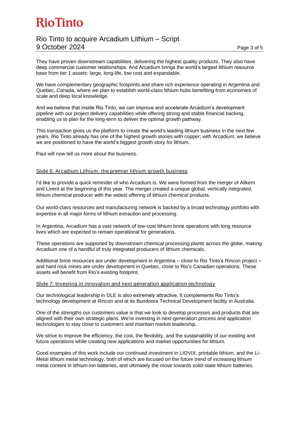 Rio Tinto to acquire Arcadium Lithium – Script 9 October 2024 Page 3 of 5 They have proven downstream capabilities, delivering the highest quality products. They also have deep commercial customer relationships. And Arcadium brings the world’s largest lithium resource base from tier 1 assets: large, long-life, low cost and expandable. We have complementary geographic footprints and share rich experience operating in Argentina and Quebec, Canada, where we plan to establish world-class lithium hubs benefiting from economies of scale and deep local knowledge. And we believe that inside Rio Tinto, we can improve and accelerate Arcadium’s development pipeline with our project delivery capabilities while offering strong and stable financial backing, enabling us to plan for the long-term to deliver the optimal growth pathway. This transaction gives us the platform to create the world’s leading lithium business in the next few years. Rio Tinto already has one of the highest growth stories with copper; with Arcadium, we believe we are positioned to have the world’s biggest growth story for lithium. Paul will now tell us more about the business. Slide 6: Arcadium Lithium: the premier lithium growth business I’d like to provide a quick reminder of who Arcadium is. We were formed from the merger of Allkem and Livent at the beginning of this year. The merger created a unique global, vertically integrated, lithium chemical producer with the widest offering of lithium chemical products. Our world-class resources and manufacturing network is backed by a broad technology portfolio with expertise in all major forms of lithium extraction and processing. In Argentina, Arcadium has a vast network of low-cost lithium brine operations with long resource lives which are expected to remain operational for generations. These operations are supported by downstream chemical processing plants across the globe, making Arcadium one of a handful of truly integrated producers of lithium chemicals. Additional brine resources are under development in Argentina – close to Rio Tinto’s Rincon project – and hard rock mines are under development in Quebec, close to Rio’s Canadian operations. These assets will benefit from Rio’s existing footprint. Slide 7: Investing in innovation and next generation application technology Our technological leadership in DLE is also extremely attractive. It complements Rio Tinto’s technology development at Rincon and at its Bundoora Technical Development facility in Australia. One of the strengths our customers value is that we look to develop processes and products that are aligned with their own strategic plans. We're investing in next-generation process and application technologies to stay close to customers and maintain market leadership. We strive to improve the efficiency, the cost, the flexibility, and the sustainability of our existing and future operations while creating new applications and market opportunities for lithium. Good examples of this work include our continued investment in LIOVIX, printable lithium, and the Li- Metal lithium metal technology, both of which are focused on the future trend of increasing lithium metal content in lithium-ion batteries, and ultimately the move towards solid-state lithium batteries.