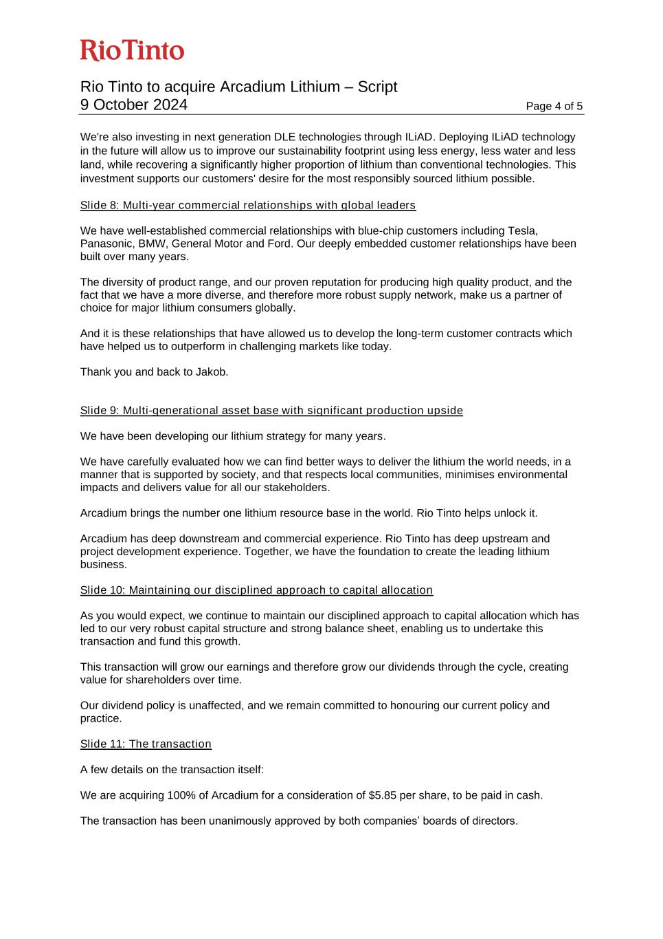 Rio Tinto to acquire Arcadium Lithium – Script 9 October 2024 Page 4 of 5 We're also investing in next generation DLE technologies through ILiAD. Deploying ILiAD technology in the future will allow us to improve our sustainability footprint using less energy, less water and less land, while recovering a significantly higher proportion of lithium than conventional technologies. This investment supports our customers' desire for the most responsibly sourced lithium possible. Slide 8: Multi-year commercial relationships with global leaders We have well-established commercial relationships with blue-chip customers including Tesla, Panasonic, BMW, General Motor and Ford. Our deeply embedded customer relationships have been built over many years. The diversity of product range, and our proven reputation for producing high quality product, and the fact that we have a more diverse, and therefore more robust supply network, make us a partner of choice for major lithium consumers globally. And it is these relationships that have allowed us to develop the long-term customer contracts which have helped us to outperform in challenging markets like today. Thank you and back to Jakob. Slide 9: Multi-generational asset base with significant production upside We have been developing our lithium strategy for many years. We have carefully evaluated how we can find better ways to deliver the lithium the world needs, in a manner that is supported by society, and that respects local communities, minimises environmental impacts and delivers value for all our stakeholders. Arcadium brings the number one lithium resource base in the world. Rio Tinto helps unlock it. Arcadium has deep downstream and commercial experience. Rio Tinto has deep upstream and project development experience. Together, we have the foundation to create the leading lithium business. Slide 10: Maintaining our disciplined approach to capital allocation As you would expect, we continue to maintain our disciplined approach to capital allocation which has led to our very robust capital structure and strong balance sheet, enabling us to undertake this transaction and fund this growth. This transaction will grow our earnings and therefore grow our dividends through the cycle, creating value for shareholders over time. Our dividend policy is unaffected, and we remain committed to honouring our current policy and practice. Slide 11: The transaction A few details on the transaction itself: We are acquiring 100% of Arcadium for a consideration of $5.85 per share, to be paid in cash. The transaction has been unanimously approved by both companies’ boards of directors.