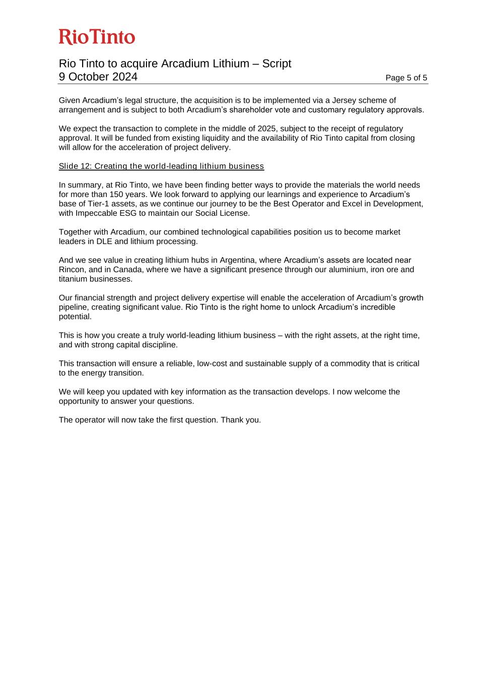 Rio Tinto to acquire Arcadium Lithium – Script 9 October 2024 Page 5 of 5 Given Arcadium’s legal structure, the acquisition is to be implemented via a Jersey scheme of arrangement and is subject to both Arcadium’s shareholder vote and customary regulatory approvals. We expect the transaction to complete in the middle of 2025, subject to the receipt of regulatory approval. It will be funded from existing liquidity and the availability of Rio Tinto capital from closing will allow for the acceleration of project delivery. Slide 12: Creating the world-leading lithium business In summary, at Rio Tinto, we have been finding better ways to provide the materials the world needs for more than 150 years. We look forward to applying our learnings and experience to Arcadium’s base of Tier-1 assets, as we continue our journey to be the Best Operator and Excel in Development, with Impeccable ESG to maintain our Social License. Together with Arcadium, our combined technological capabilities position us to become market leaders in DLE and lithium processing. And we see value in creating lithium hubs in Argentina, where Arcadium’s assets are located near Rincon, and in Canada, where we have a significant presence through our aluminium, iron ore and titanium businesses. Our financial strength and project delivery expertise will enable the acceleration of Arcadium’s growth pipeline, creating significant value. Rio Tinto is the right home to unlock Arcadium’s incredible potential. This is how you create a truly world-leading lithium business – with the right assets, at the right time, and with strong capital discipline. This transaction will ensure a reliable, low-cost and sustainable supply of a commodity that is critical to the energy transition. We will keep you updated with key information as the transaction develops. I now welcome the opportunity to answer your questions. The operator will now take the first question. Thank you.