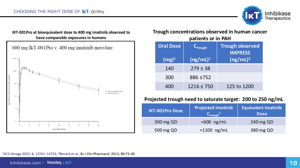 CHOOSING THE RIGHT DOSE OF IkT- 001Pro IKT-001Pro at bioequivalent dose to 400 mg imatinib observed to Trough concentrations observed in human cancer have comparable exposures in humans patients or in PAH Oral Dose C Trough observed trough IMPRESS 1 1 2 (mg) (ng/mL) (ng/mL) 140 279 ± 38 300 886 ±752 400 1216 ± 750 125 to 1200 Projected trough need to saturate target: 200 to 250 ng/mL Projected Imatinib Equivalent Imatinib IKT-001Pro Dose 1 C Dose trough 300 mg QD ≈600 ng/mL 240 mg QD 500 mg QD ≈1100 ng/mL 380 mg QD 1 2 ACS Omega 2023, 8, 13741−13753; Renard et al., Br J Clin Pharmacol 2015; 80:75–85 Inhibikase.com • : IKT 19