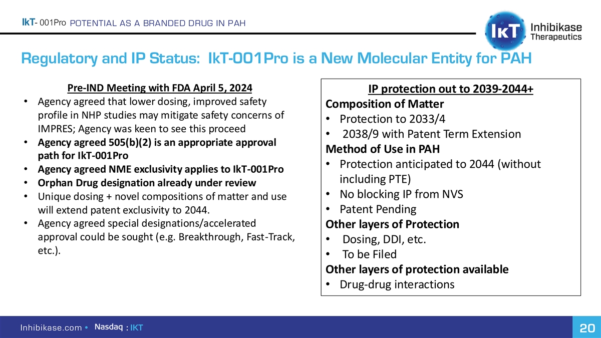 IkT- 001Pro POTENTIAL AS A BRANDED DRUG IN PAH Regulatory and IP Status: IkT-001Pro is a New Molecular Entity for PAH Pre-IND Meeting with FDA April 5, 2024 IP protection out to 2039-2044+ • Agency agreed that lower dosing, improved safety Composition of Matter profile in NHP studies may mitigate safety concerns of • Protection to 2033/4 IMPRES; Agency was keen to see this proceed • 2038/9 with Patent Term Extension • Agency agreed 505(b)(2) is an appropriate approval Method of Use in PAH path for IkT-001Pro • Protection anticipated to 2044 (without • Agency agreed NME exclusivity applies to IkT-001Pro including PTE) • Orphan Drug designation already under review • No blocking IP from NVS • Unique dosing + novel compositions of matter and use will extend patent exclusivity to 2044. • Patent Pending • Agency agreed special designations/accelerated Other layers of Protection approval could be sought (e.g. Breakthrough, Fast-Track, • Dosing, DDI, etc. etc.). • To be Filed Other layers of protection available • Drug-drug interactions Inhibikase.com • : IKT 20