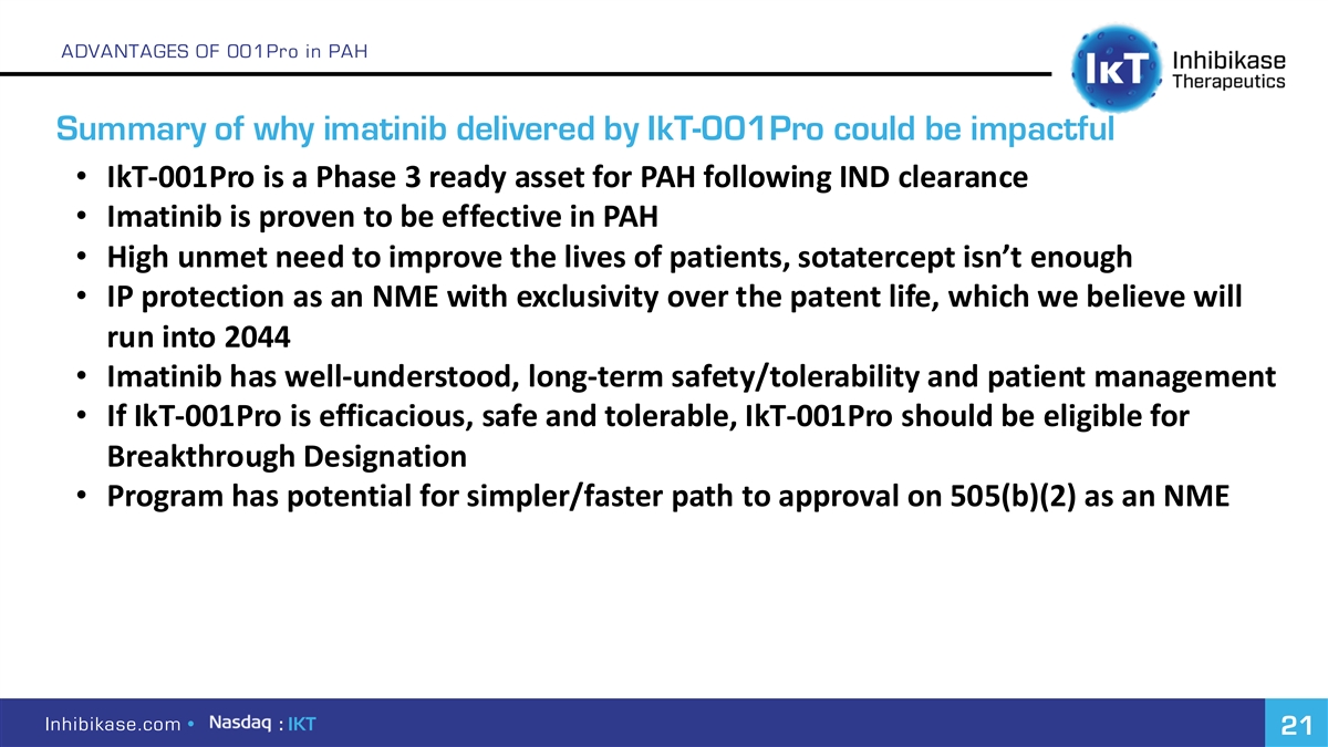 ADVANTAGES OF 001Pro in PAH Summary of why imatinib delivered by IkT-001Pro could be impactful • IkT-001Pro is a Phase 3 ready asset for PAH following IND clearance • Imatinib is proven to be effective in PAH • High unmet need to improve the lives of patients, sotatercept isn’t enough • IP protection as an NME with exclusivity over the patent life, which we believe will run into 2044 • Imatinib has well-understood, long-term safety/tolerability and patient management • If IkT-001Pro is efficacious, safe and tolerable, IkT-001Pro should be eligible for Breakthrough Designation • Program has potential for simpler/faster path to approval on 505(b)(2) as an NME Inhibikase.com • : IKT 21