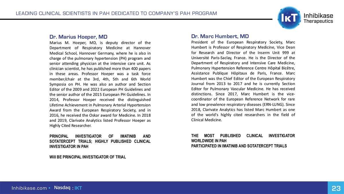 LEADING CLINICAL SCIENTISTS IN PAH DEDICATED TO COMPANY’S PAH PROGRAM Dr. Marc Humbert, MD Dr. Marius Hoeper, MD President of the European Respiratory Society, Marc Marius M. Hoeper, MD, is deputy director of the Humbert is Professor of Respiratory Medicine, Vice Dean Department of Respiratory Medicine at Hannover for Research and Director of the Inserm Unit 999 at Medical School, Hannover Germany, where he is also in Université Paris-Saclay, France. He is the Director of the charge of the pulmonary hypertension (PH) program and Department of Respiratory and Intensive Care Medicine, senior attending physician at the intensive care unit. As Pulmonary Hypertension Reference Centre Hôpital Bicêtre, clinician scientist, he has published more than 400 papers Assistance Publique Hôpitaux de Paris, France. Marc in these areas. Professor Hoeper was a task force Humbert was the Chief Editor of the European Respiratory member/chair at the 3rd, 4th, 5th and 6th World Journal from 2013 to 2017 and he is currently Section Symposia on PH. He was also an author and Section Editor for Pulmonary Vascular Medicine. He has received Editor of the 2009 and 2022 European PH Guidelines and distinctions. Since 2017, Marc Humbert is the vice- the senior author of the 2015 European PH Guidelines. In coordinator of the European Reference Network for rare 2014, Professor Hoeper received the distinguished and low prevalence respiratory diseases (ERN-LUNG). Since Lifetime Achievement in Pulmonary Arterial Hypertension 2018, Clarivate Analytics has listed Marc Humbert as one Award from the European Respiratory Society, and in of the world's highly cited researchers in the field of 2016, he received the Oskar award for Medicine. In 2018 Clinical Medicine. and 2019, Clarivate Analytics listed Professor Hoeper as Highly Cited Researcher. THE MOST PUBLISHED CLINICAL INVESTIGATOR PRINCIPAL INVESTIGATOR OF IMATINIB AND WORLDWIDE IN PAH SOTATERCEPT TRIALS; HIGHLY PUBLISHED CLINICAL PARTICIPATED IN IMATINIB AND SOTATERCEPT TRIALS INVESTIGATOR IN PAH Will BE PRINCIPAL INVESTIGATOR OF TRIAL Inhibikase.com • : IKT 23