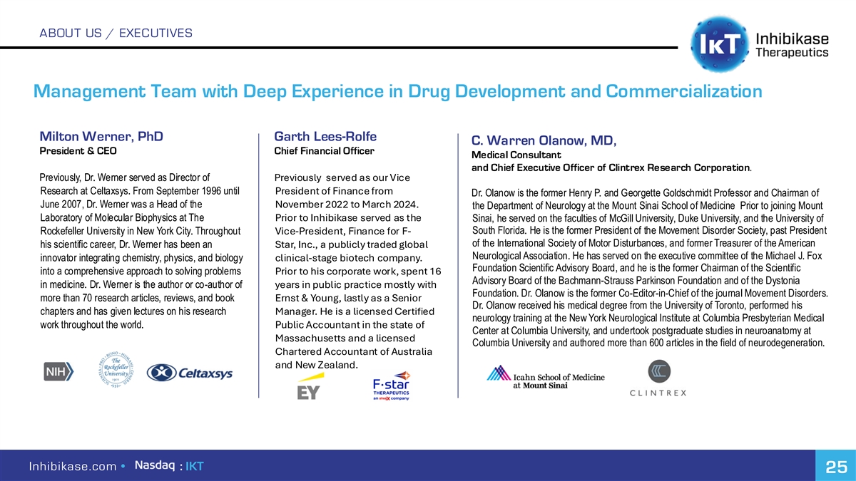 ABOUT US / EXECUTIVES Management Team with Deep Experience in Drug Development and Commercialization Milton Werner, PhD Garth Lees-Rolfe C. Warren Olanow, MD, President & CEO Chief Financial Officer Medical Consultant and Chief Executive Officer of Clintrex Research Corporation. Previously, Dr. Werner served as Director of Previously served as our Vice Research at Celtaxsys. From September 1996 until President of Finance from Dr. Olanow is the former Henry P. and Georgette Goldschmidt Professor and Chairman of June 2007, Dr. Werner was a Head of the November 2022 to March 2024. the Department of Neurology at the Mount Sinai School of Medicine Prior to joining Mount Laboratory of Molecular Biophysics at The Prior to Inhibikase served as the Sinai, he served on the faculties of McGill University, Duke University, and the University of Rockefeller University in New York City. Throughout Vice-President, Finance for F- South Florida. He is the former President of the Movement Disorder Society, past President of the International Society of Motor Disturbances, and former Treasurer of the American his scientific career, Dr. Werner has been an Star, Inc., a publicly traded global Neurological Association. He has served on the executive committee of the Michael J. Fox innovator integrating chemistry, physics, and biology clinical-stage biotech company. Foundation Scientific Advisory Board, and he is the former Chairman of the Scientific into a comprehensive approach to solving problems Prior to his corporate work, spent 16 Advisory Board of the Bachmann-Strauss Parkinson Foundation and of the Dystonia in medicine. Dr. Werner is the author or co-author of years in public practice mostly with Foundation. Dr. Olanow is the former Co-Editor-in-Chief of the journal Movement Disorders. more than 70 research articles, reviews, and book Ernst & Young, lastly as a Senior Dr. Olanow received his medical degree from the University of Toronto, performed his chapters and has given lectures on his research Manager. He is a licensed Certified neurology training at the New York Neurological Institute at Columbia Presbyterian Medical work throughout the world. Public Accountant in the state of Center at Columbia University, and undertook postgraduate studies in neuroanatomy at Massachusetts and a licensed Columbia University and authored more than 600 articles in the field of neurodegeneration. Chartered Accountant of Australia and New Zealand. Inhibikase.com • : IKT 25