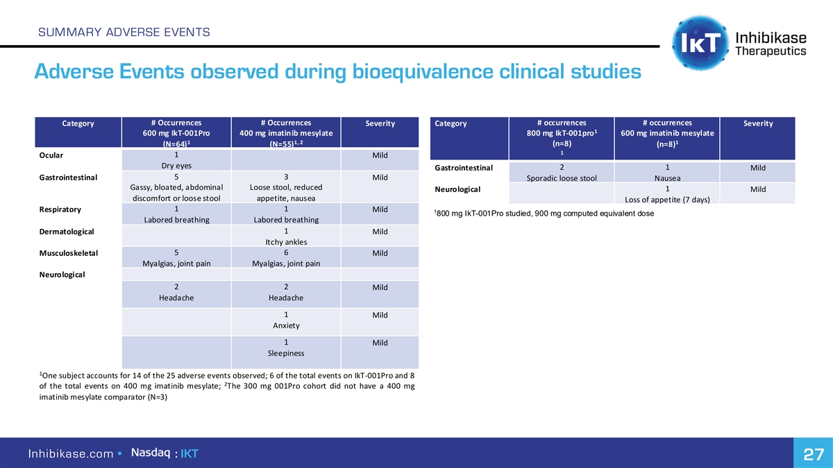 SUMMARY ADVERSE EVENTS Adverse Events observed during bioequivalence clinical studies # Occurrences # Occurrences # occurrences # occurrences Category Severity Category Severity 1 600 mg IkT-001Pro 400 mg imatinib mesylate 800 mg IkT-001pro 600 mg imatinib mesylate 1 1, 2 1 (n=8) (N=64) (N=55) (n=8) 1 Ocular 1 Mild Dry eyes 2 1 Gastrointestinal Mild 5 3 Gastrointestinal Mild Sporadic loose stool Nausea Gassy, bloated, abdominal Loose stool, reduced 1 Neurological Mild discomfort or loose stool appetite, nausea Loss of appetite (7 days) 1 1 Respiratory Mild 1 800 mg IkT-001Pro studied, 900 mg computed equivalent dose Labored breathing Labored breathing Dermatological 1 Mild Itchy ankles Musculoskeletal 5 6 Mild Myalgias, joint pain Myalgias, joint pain Neurological 2 2 Mild Headache Headache 1 Mild Anxiety 1 Mild Sleepiness 1 One subject accounts for 14 of the 25 adverse events observed; 6 of the total events on IkT-001Pro and 8 2 of the total events on 400 mg imatinib mesylate; The 300 mg 001Pro cohort did not have a 400 mg imatinib mesylate comparator (N=3) Inhibikase.com • : IKT 27