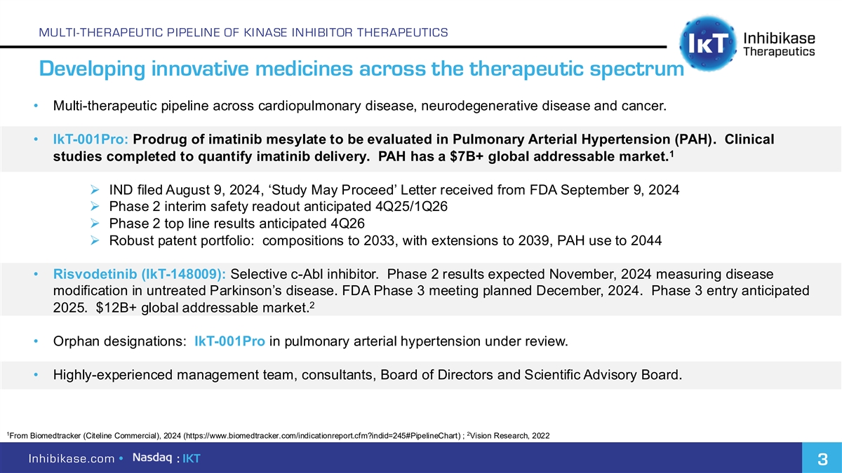 MULTI-THERAPEUTIC PIPELINE OF KINASE INHIBITOR THERAPEUTICS Developing innovative medicines across the therapeutic spectrum • Multi-therapeutic pipeline across cardiopulmonary disease, neurodegenerative disease and cancer. • IkT-001Pro: Prodrug of imatinib mesylate to be evaluated in Pulmonary Arterial Hypertension (PAH). Clinical 1 studies completed to quantify imatinib delivery. PAH has a $7B+ global addressable market. ➢ IND filed August 9, 2024, ‘Study May Proceed’ Letter received from FDA September 9, 2024 ➢ Phase 2 interim safety readout anticipated 4Q25/1Q26 ➢ Phase 2 top line results anticipated 4Q26 ➢ Robust patent portfolio: compositions to 2033, with extensions to 2039, PAH use to 2044 • Risvodetinib (IkT-148009): Selective c-Abl inhibitor. Phase 2 results expected November, 2024 measuring disease modification in untreated Parkinson’s disease. FDA Phase 3 meeting planned December, 2024. Phase 3 entry anticipated 2 2025. $12B+ global addressable market. • Orphan designations: IkT-001Pro in pulmonary arterial hypertension under review. • Highly-experienced management team, consultants, Board of Directors and Scientific Advisory Board. 1 2 From Biomedtracker (Citeline Commercial), 2024 (https://www.biomedtracker.com/indicationreport.cfm?indid=245#PipelineChart) ; Vision Research, 2022 Inhibikase.com • : IKT 3