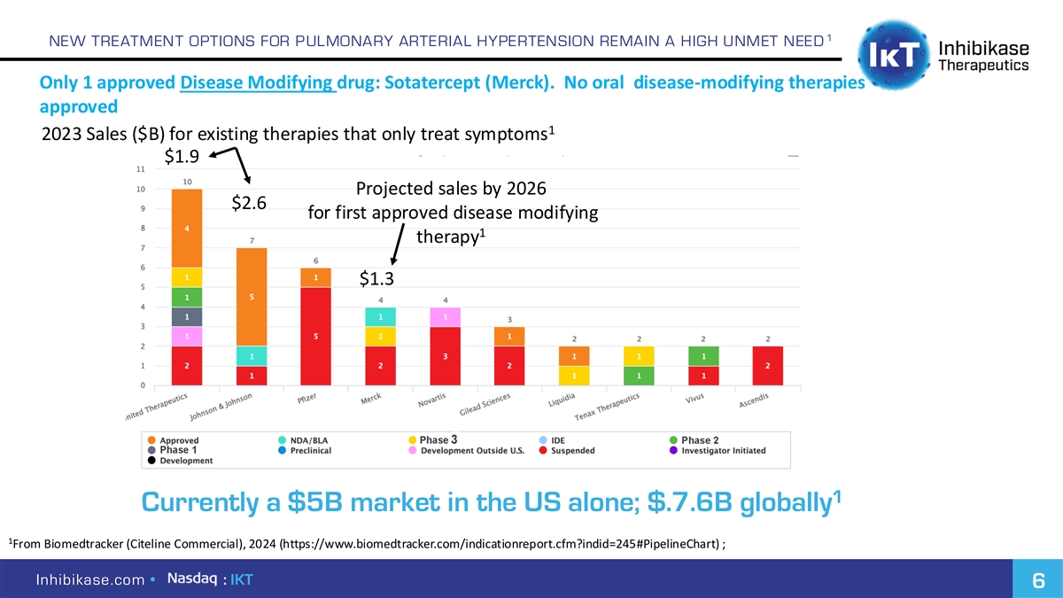 1 NEW TREATMENT OPTIONS FOR PULMONARY ARTERIAL HYPERTENSION REMAIN A HIGH UNMET NEED Only 1 approved Disease Modifying drug: Sotatercept (Merck). No oral disease-modifying therapies approved 1 2023 Sales ($B) for existing therapies that only treat symptoms $1.9 Projected sales by 2026 $2.6 for first approved disease modifying 1 therapy $1.3 1 Currently a $5B market in the US alone; $.7.6B globally 1 From Biomedtracker (Citeline Commercial), 2024 (https://www.biomedtracker.com/indicationreport.cfm?indid=245#PipelineChart) ; Inhibikase.com • : IKT 6