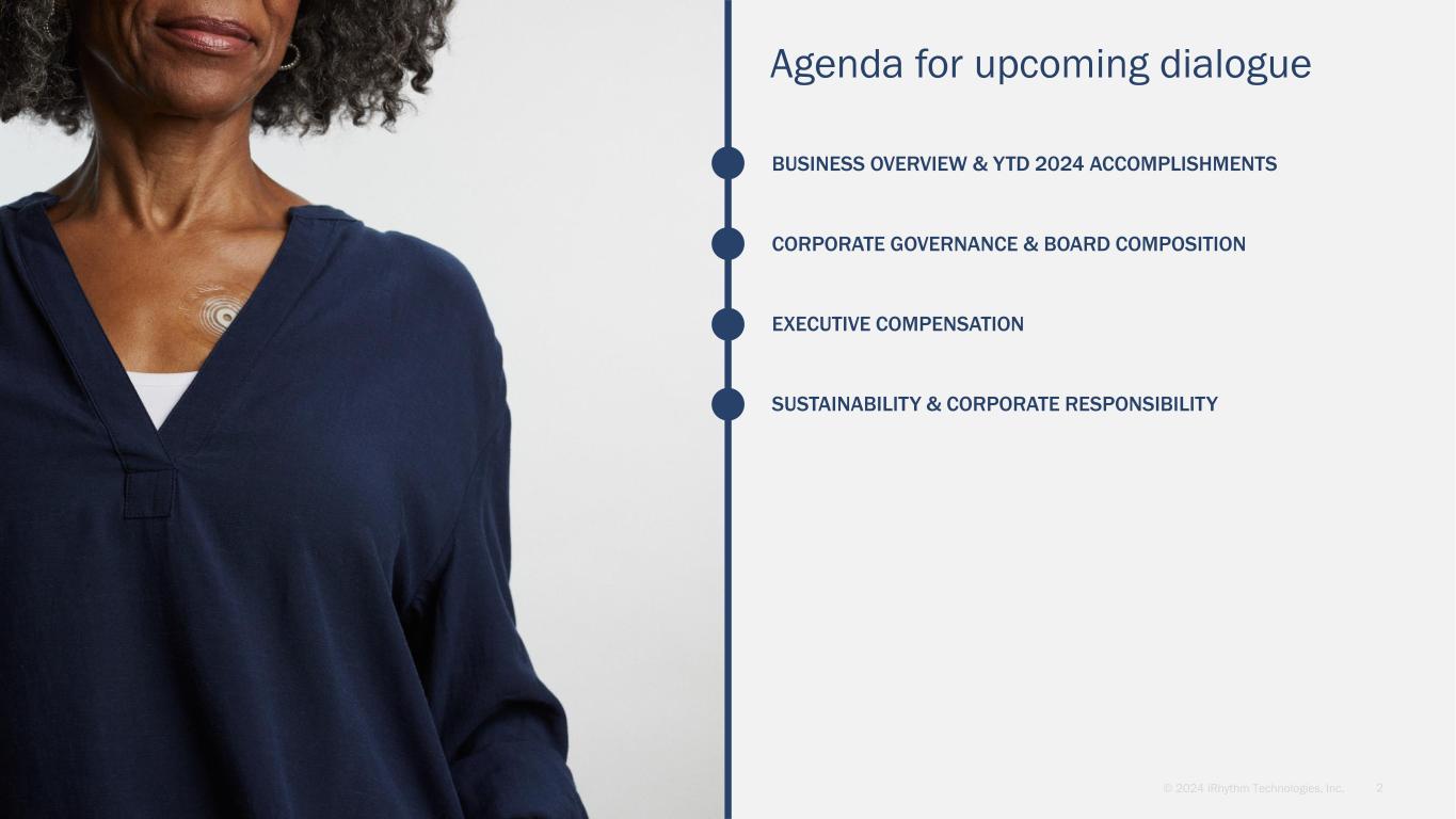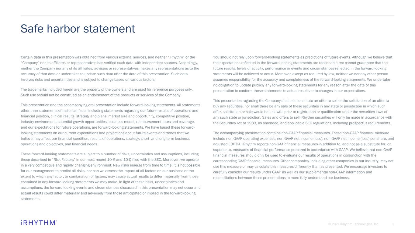2© 2024 iRhythm Technologies, Inc. BUSINESS OVERVIEW & YTD 2024 ACCOMPLISHMENTS CORPORATE GOVERNANCE & BOARD COMPOSITION Agenda for upcoming dialogue EXECUTIVE COMPENSATION SUSTAINABILITY & CORPORATE RESPONSIBILITY