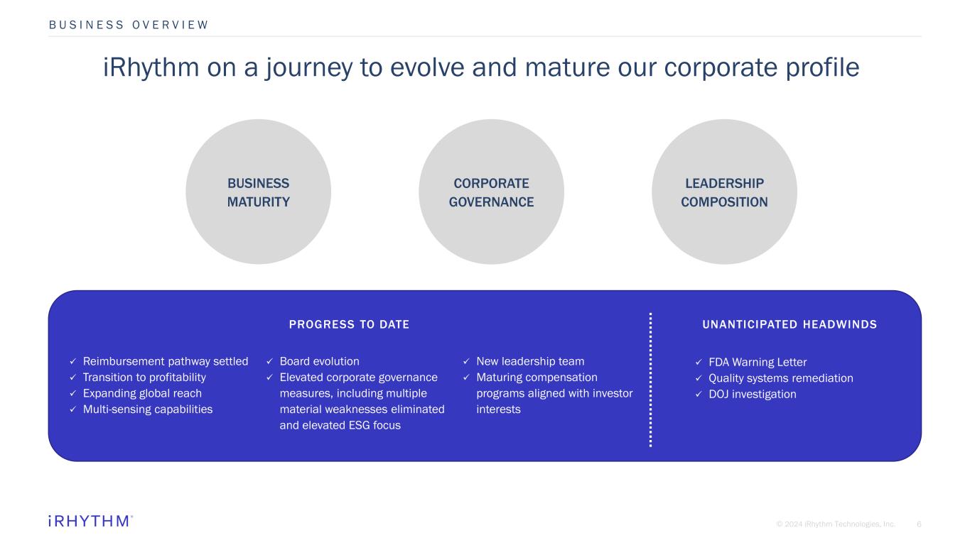 5© 2024 iRhythm Technologies, Inc. MARKET EXPANSION OPPORTUNITIES INNOVATION OPERATIONAL EFFICIENCY FOCUS IMPROVING FINANCIAL PROFILE Compelling investment thesis for long-term shareholder value creation Core US market penetration Greenfield specialist growth Primary care physician growth Channel expansion International expansion Adjacent market development Relentless patient focus Insight generation AI and prediction capabilities Connected care Commitment to quality, safety and regulatory compliance Supply chain resilience Unit cost economics Digital transformation Continuous process improvement Focus on generating leverage Disciplined opportunity prioritization Balanced reinvestments Strategic portfolio management Investments for opening adjacent markets Strategy to deliver enhanced value to all stakeholders B U S I N E S S O V E R V I E W