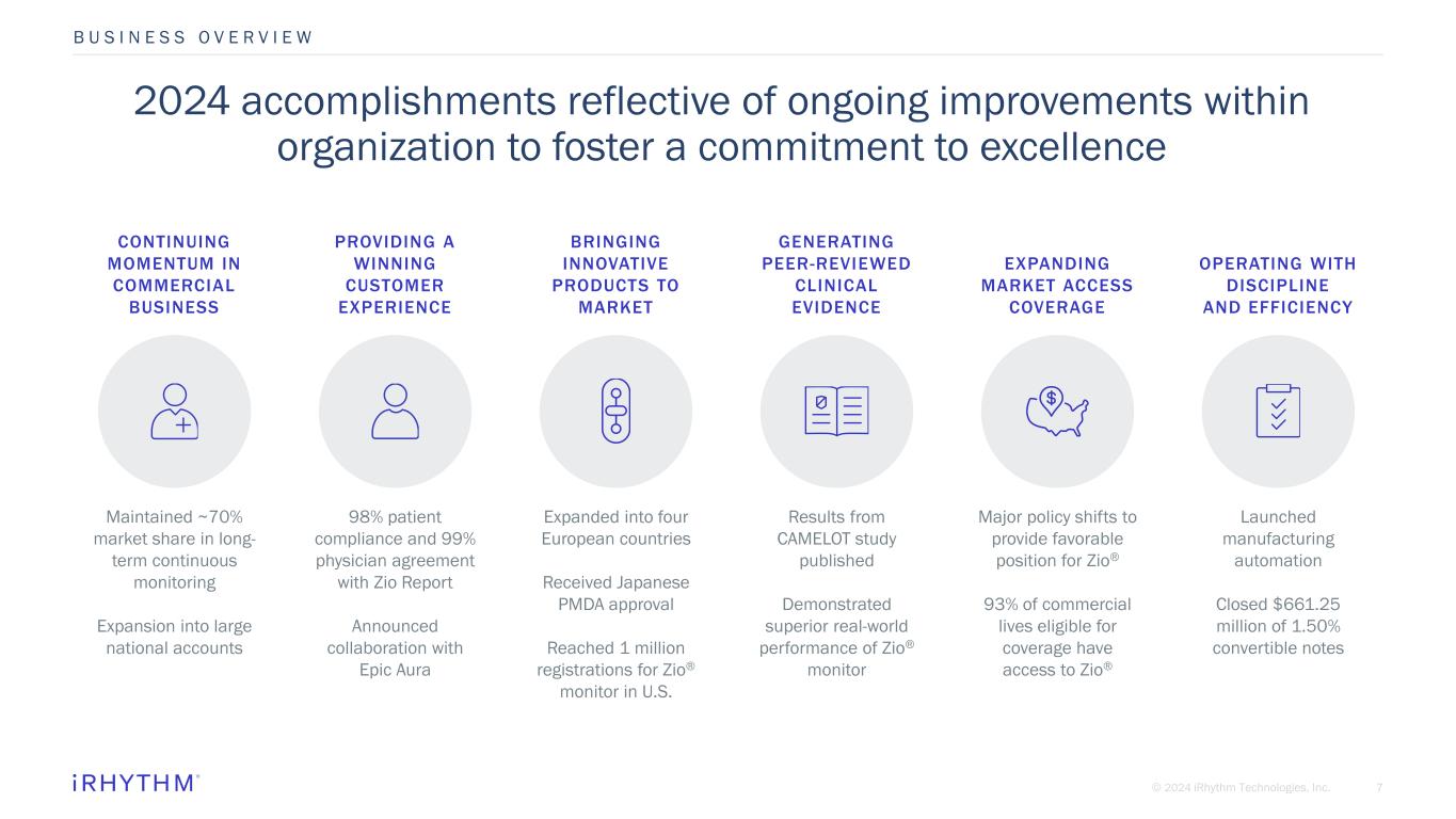 6© 2024 iRhythm Technologies, Inc. iRhythm on a journey to evolve and mature our corporate profile B U S I N E S S O V E R V I E W BUSINESS MATURITY CORPORATE GOVERNANCE LEADERSHIP COMPOSITION PROGRESS TO DATE ✓ Reimbursement pathway settled ✓ Transition to profitability ✓ Expanding global reach ✓ Multi-sensing capabilities ✓ Board evolution ✓ Elevated corporate governance measures, including multiple material weaknesses eliminated and elevated ESG focus ✓ New leadership team ✓ Maturing compensation programs aligned with investor interests UNANTICIPATED HEADWINDS ✓ FDA Warning Letter ✓ Quality systems remediation ✓ DOJ investigation
