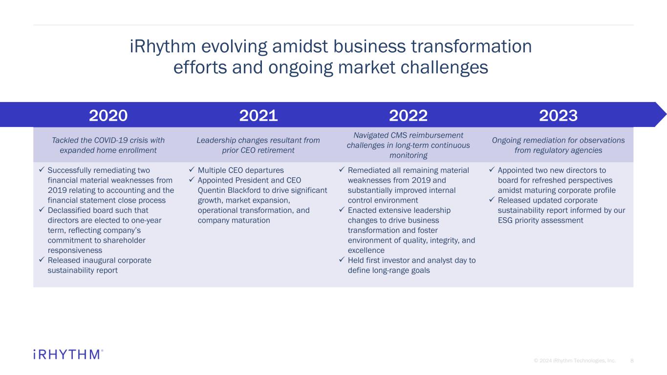 © 2024 iRhythm Technologies, Inc. 7 2024 accomplishments reflective of ongoing improvements within organization to foster a commitment to excellence Expanded into four European countries Received Japanese PMDA approval Reached 1 million registrations for Zio® monitor in U.S. BRINGING INNOVATIVE PRODUCTS TO MARKET Maintained ~70% market share in long- term continuous monitoring Expansion into large national accounts CONTINUING MOMENTUM IN COMMERCIAL BUSINESS Results from CAMELOT study published Demonstrated superior real-world performance of Zio® monitor GENERATING PEER-REVIEWED CLINICAL EVIDENCE Major policy shifts to provide favorable position for Zio® 93% of commercial lives eligible for coverage have access to Zio® EXPANDING MARKET ACCESS COVERAGE OPERATING WITH DISCIPLINE AND EFFICIENCY Launched manufacturing automation Closed $661.25 million of 1.50% convertible notes 98% patient compliance and 99% physician agreement with Zio Report Announced collaboration with Epic Aura PROVIDING A WINNING CUSTOMER EXPERIENCE B U S I N E S S O V E R V I E W