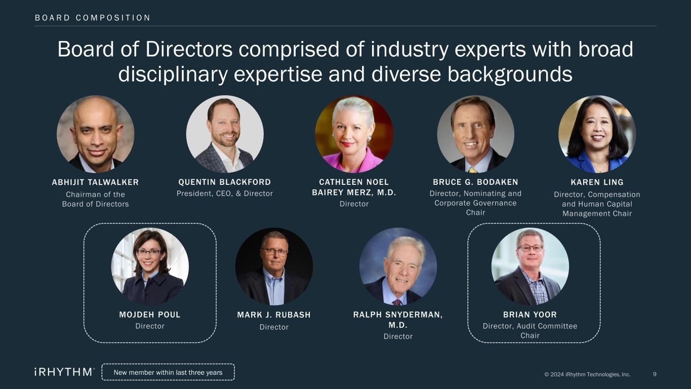 8© 2024 iRhythm Technologies, Inc. iRhythm evolving amidst business transformation efforts and ongoing market challenges 2020 2021 2022 2023 Tackled the COVID-19 crisis with expanded home enrollment Leadership changes resultant from prior CEO retirement Navigated CMS reimbursement challenges in long-term continuous monitoring Ongoing remediation for observations from regulatory agencies ✓ Successfully remediating two financial material weaknesses from 2019 relating to accounting and the financial statement close process ✓ Declassified board such that directors are elected to one-year term, reflecting company’s commitment to shareholder responsiveness ✓ Released inaugural corporate sustainability report ✓ Multiple CEO departures ✓ Appointed President and CEO Quentin Blackford to drive significant growth, market expansion, operational transformation, and company maturation ✓ Remediated all remaining material weaknesses from 2019 and substantially improved internal control environment ✓ Enacted extensive leadership changes to drive business transformation and foster environment of quality, integrity, and excellence ✓ Held first investor and analyst day to define long-range goals ✓ Appointed two new directors to board for refreshed perspectives amidst maturing corporate profile ✓ Released updated corporate sustainability report informed by our ESG priority assessment