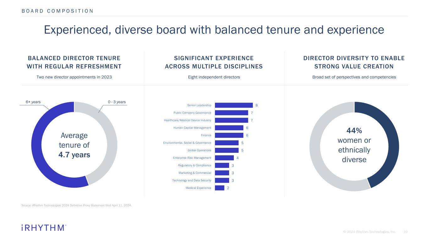 9© 2024 iRhythm Technologies, Inc. CATHLEEN NOEL BAIREY MERZ, M.D. Director RALPH SNYDERMAN, M.D. Director MOJDEH POUL Director Board of Directors comprised of industry experts with broad disciplinary expertise and diverse backgrounds BRUCE G. BODAKEN Director, Nominating and Corporate Governance Chair KAREN LING Director, Compensation and Human Capital Management Chair MARK J. RUBASH Director QUENTIN BLACKFORD President, CEO, & Director B O A R D C O M P O S I T I O N ABHIJIT TALWALKER Chairman of the Board of Directors BRIAN YOOR Director, Audit Committee Chair New member within last three years