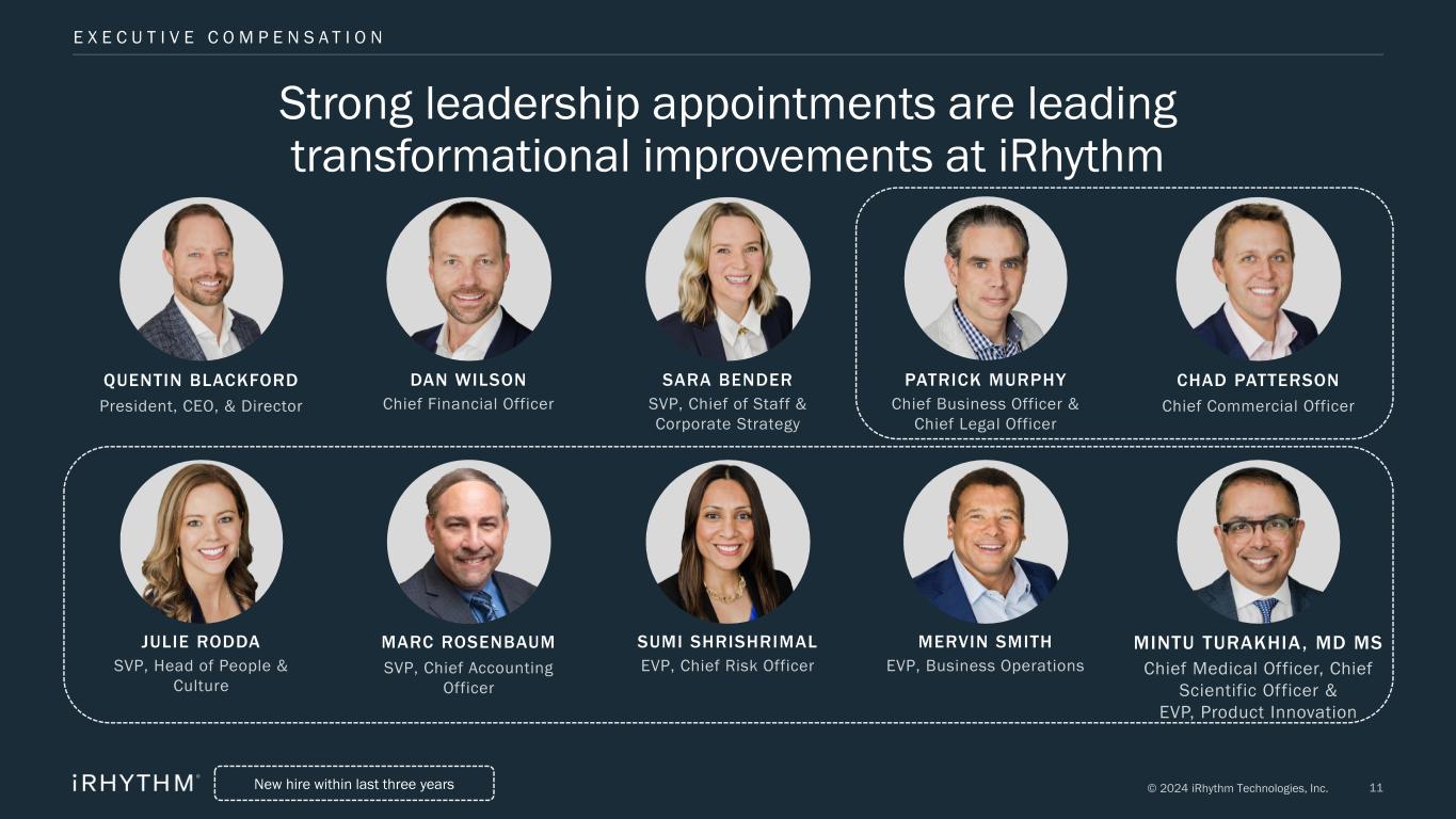 10© 2024 iRhythm Technologies, Inc. Experienced, diverse board with balanced tenure and experience BALANCED DIRECTOR TENURE WITH REGULAR REFRESHMENT Two new director appointments in 2023 SIGNIFICANT EXPERIENCE ACROSS MULTIPLE DISCIPLINES Eight independent directors DIRECTOR DIVERSITY TO ENABLE STRONG VALUE CREATION Broad set of perspectives and competencies 2 3 3 3 4 5 5 6 6 7 7 8 Medical Experience Technology and Data Security Marketing & Commercial Regulatory & Compliance Enterprise Risk Management Global Operations Environmental, Social & Governance Finance Human Capital Management Healthcare/Medical Device Industry Public Company Governance Senior Leadership Source: iRhythm Technologies 2024 Definitive Proxy Statement filed April 11, 2024. Average tenure of 4.7 years 44% women or ethnically diverse B O A R D C O M P O S I T I O N 0 - 3 years6+ years